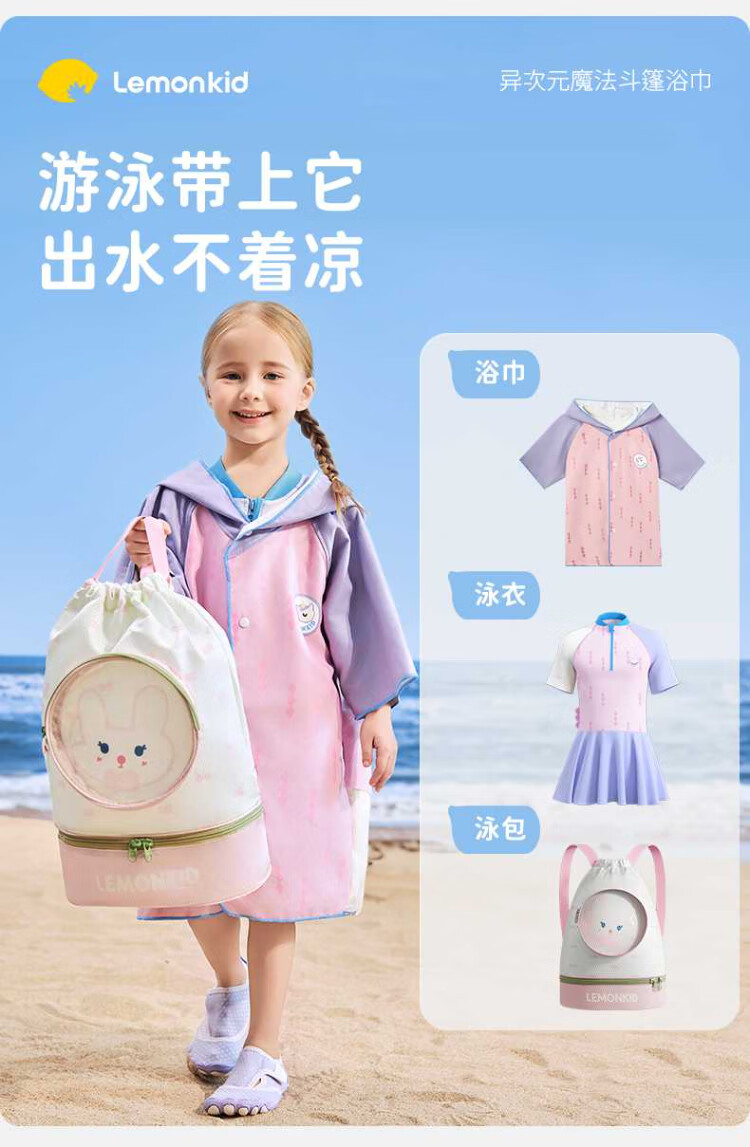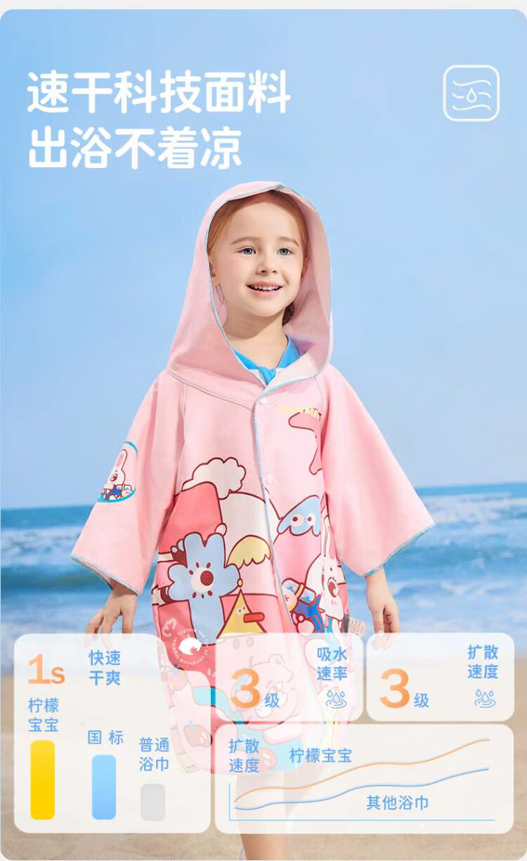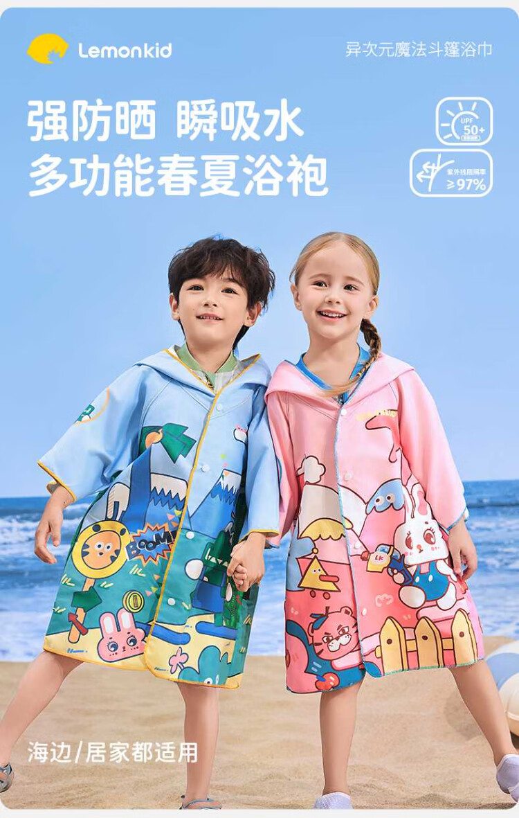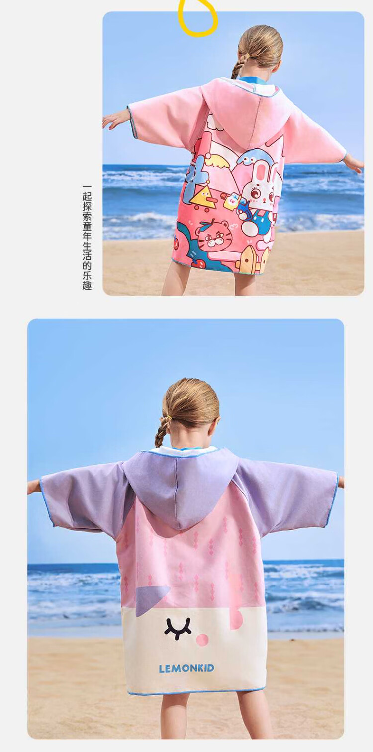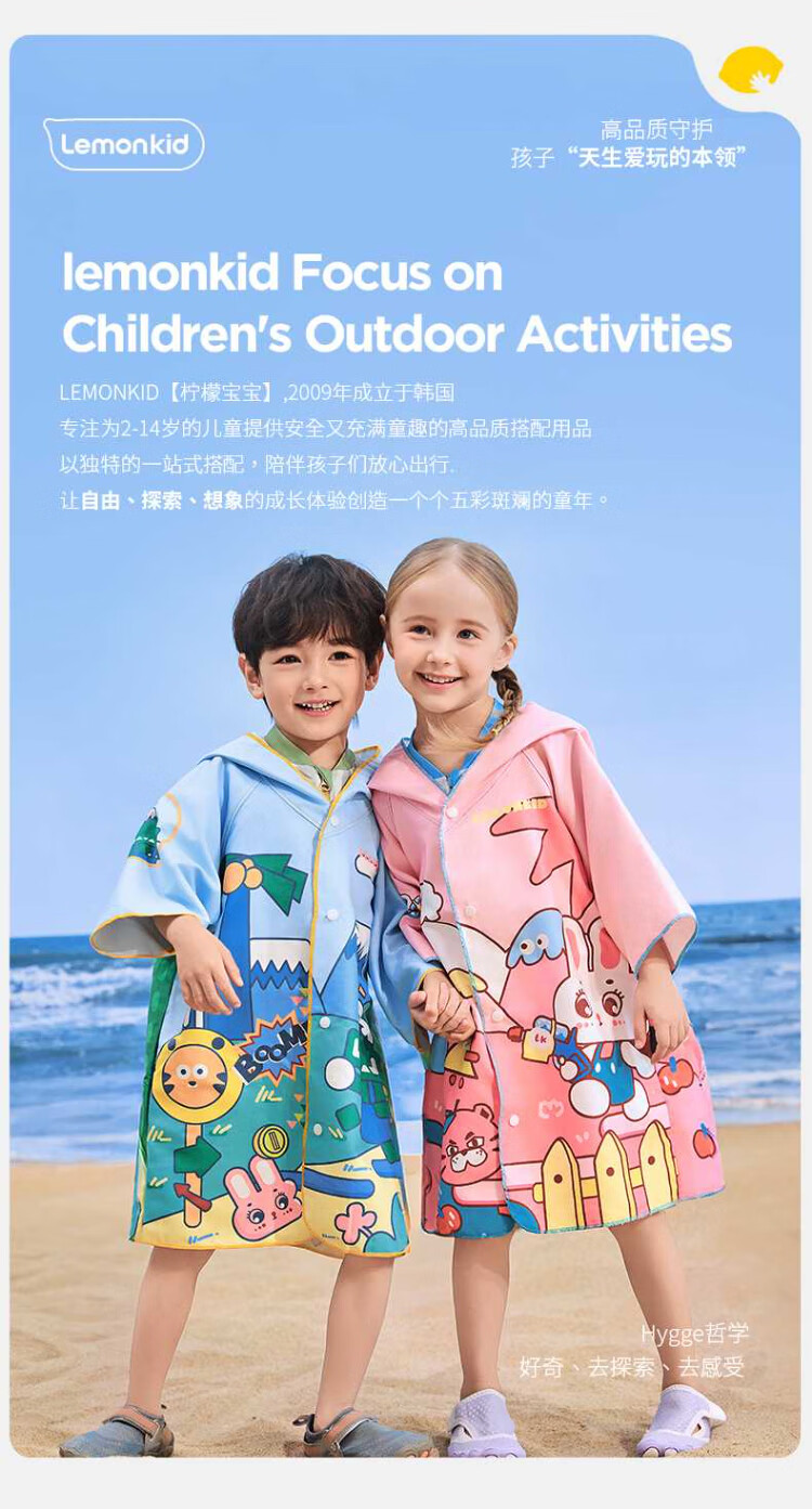 lemonkid儿童浴袍宝宝男女童带帽可穿吸水速干浴巾 水族蓝恐龙 100