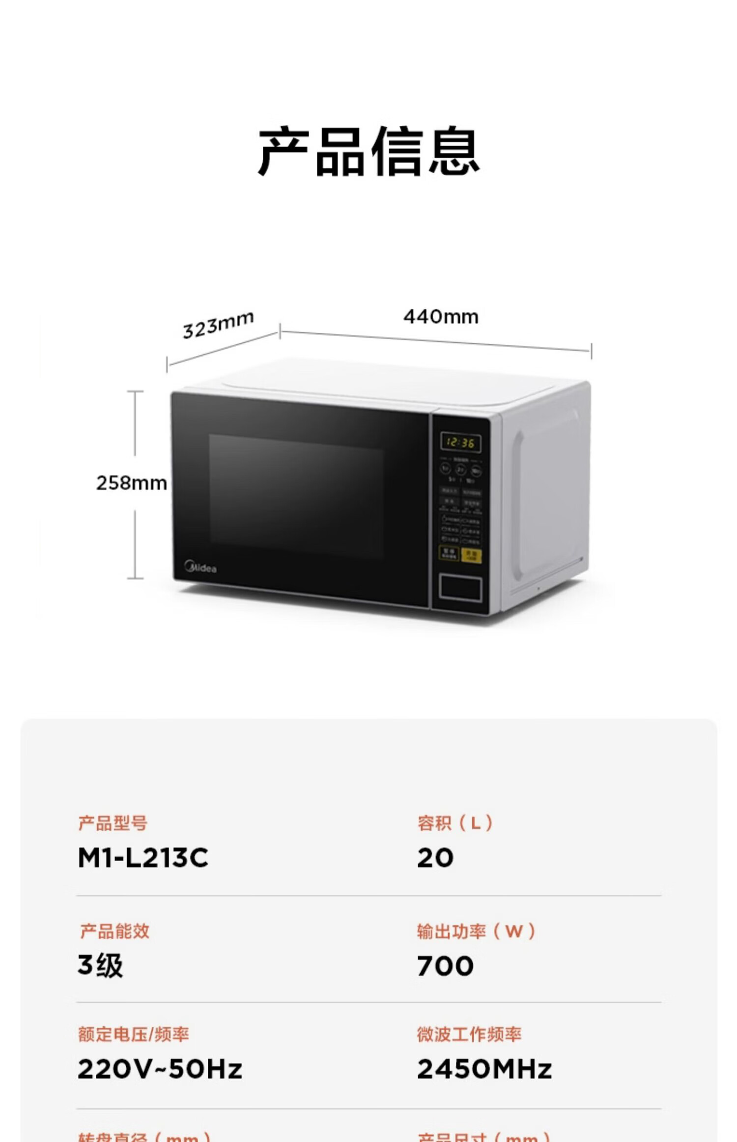 美的(Midea)微波炉家用小型20升转盘加热 智能菜单 一键解冻 杀菌电子除味 薄膜按键(M1-L213C)