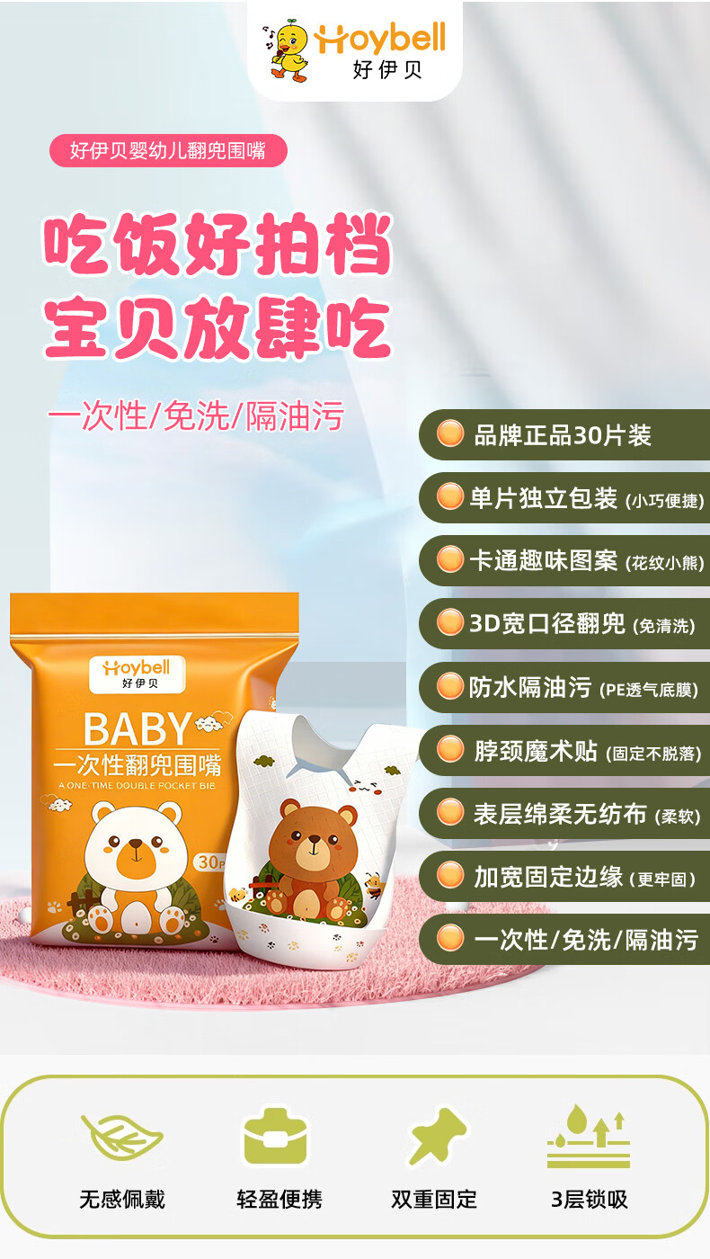 好伊贝(HOY BELL)婴儿一次性围兜30片 宝宝围嘴口水巾免洗饭兜独立包装