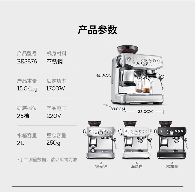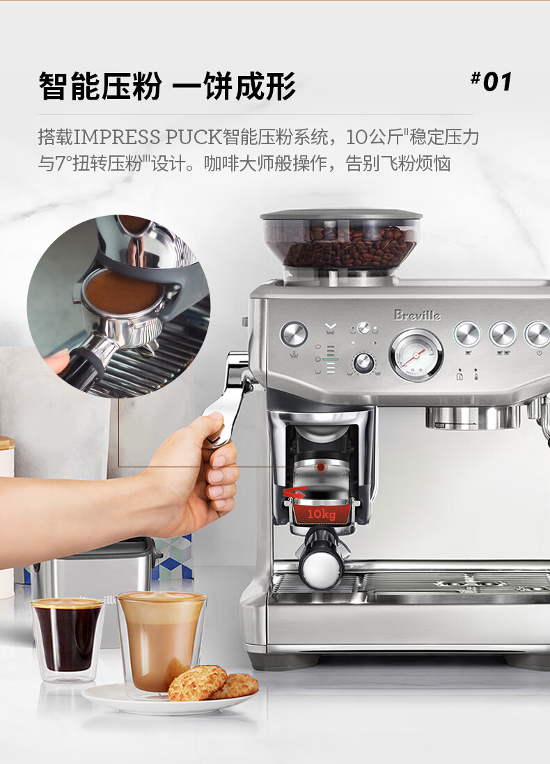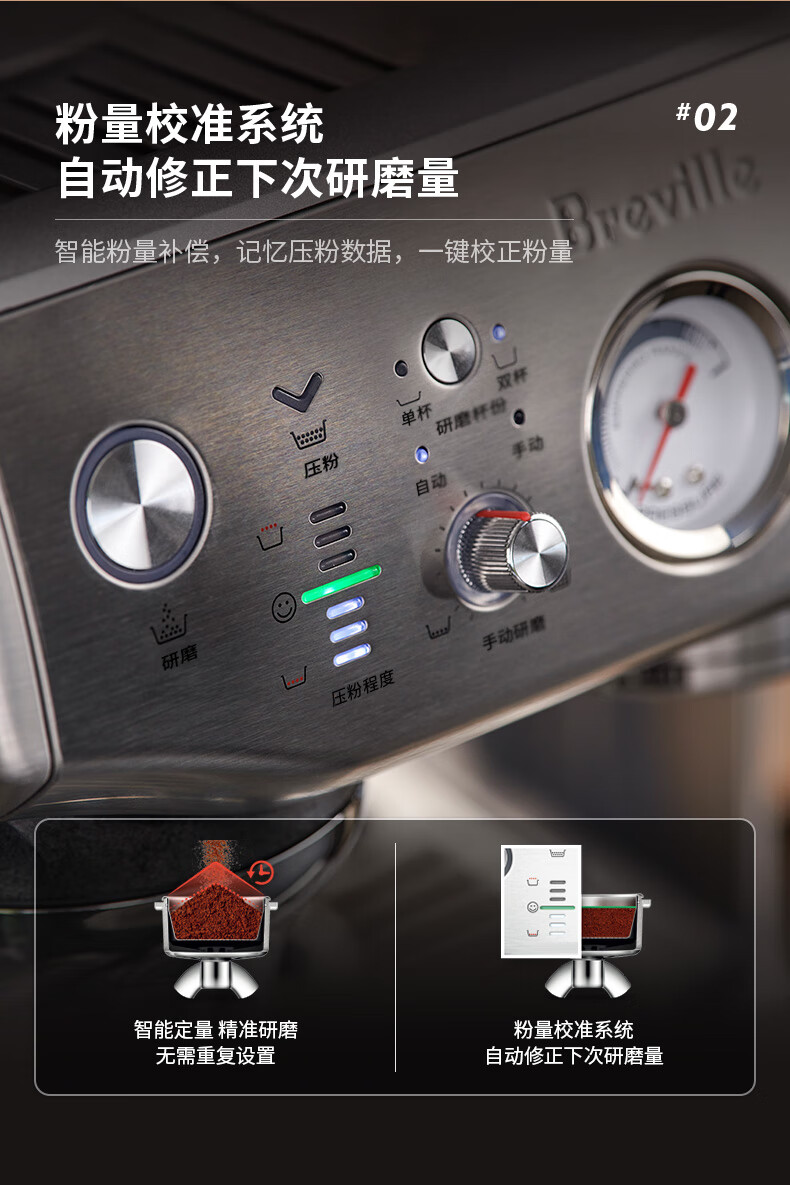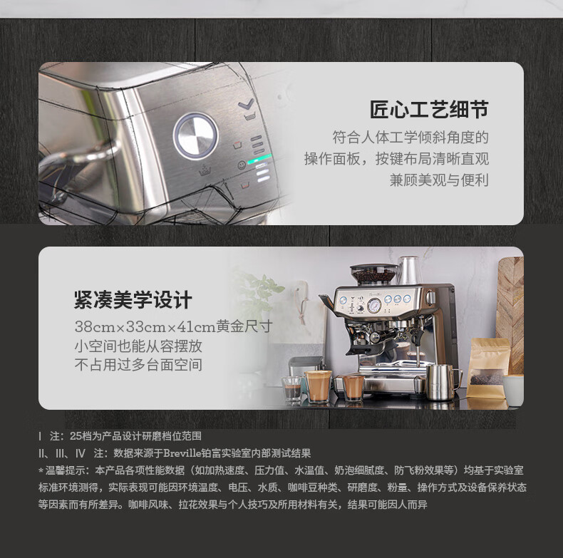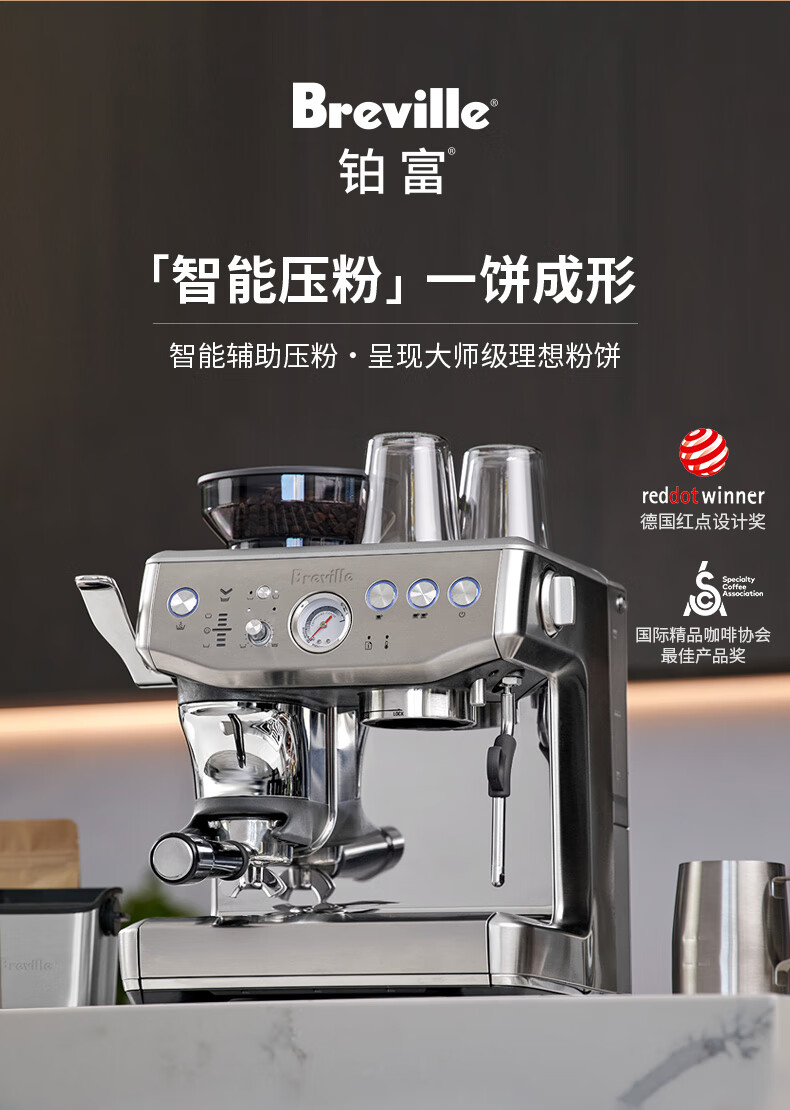 铂富(Breville)BES876 半自动咖啡机 家用意式 研磨奶泡一体式 智能辅助压粉系统 大容量水箱 25挡研磨 锻光银