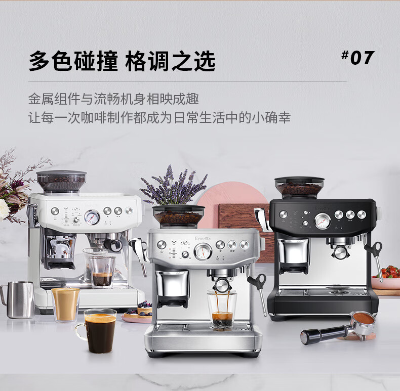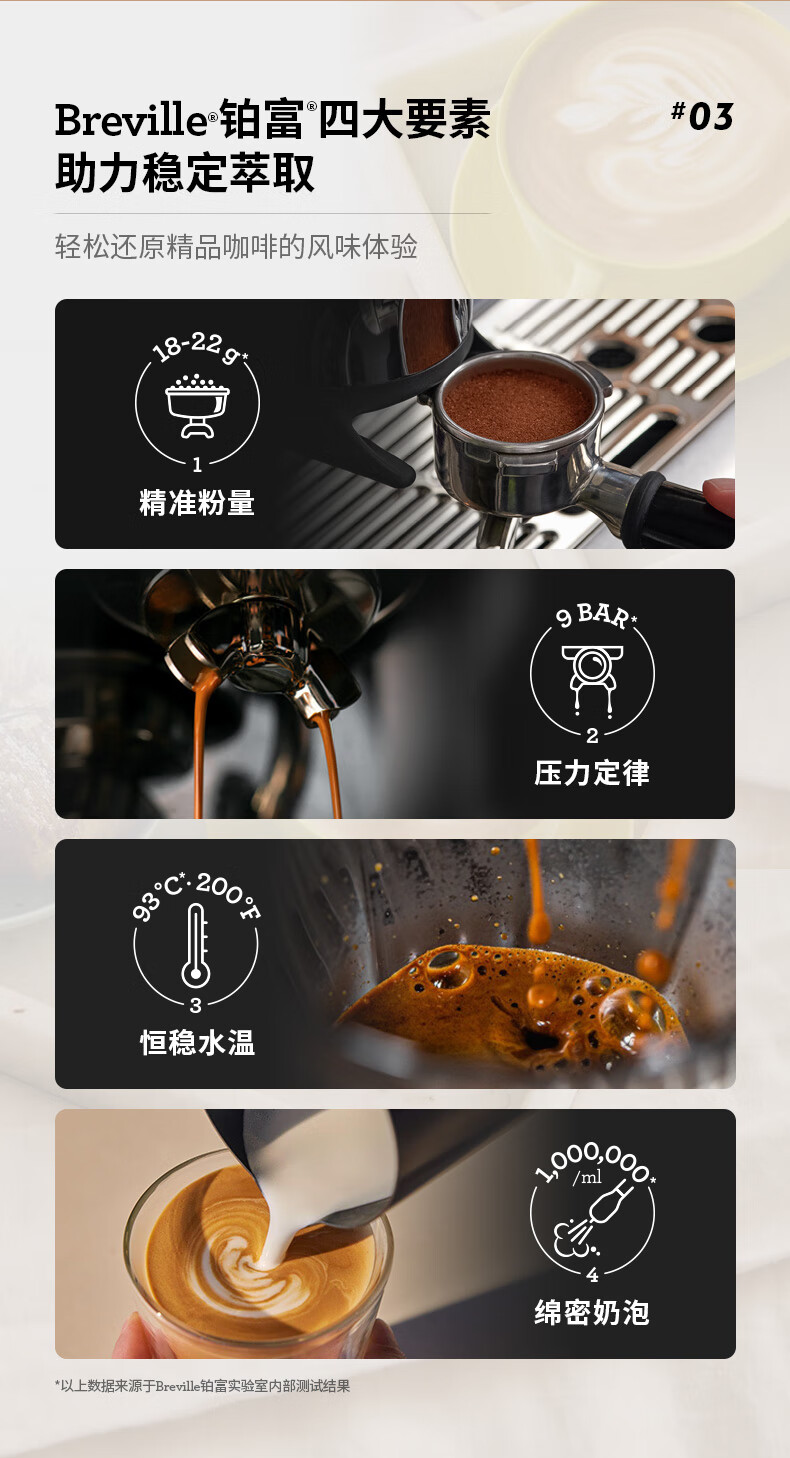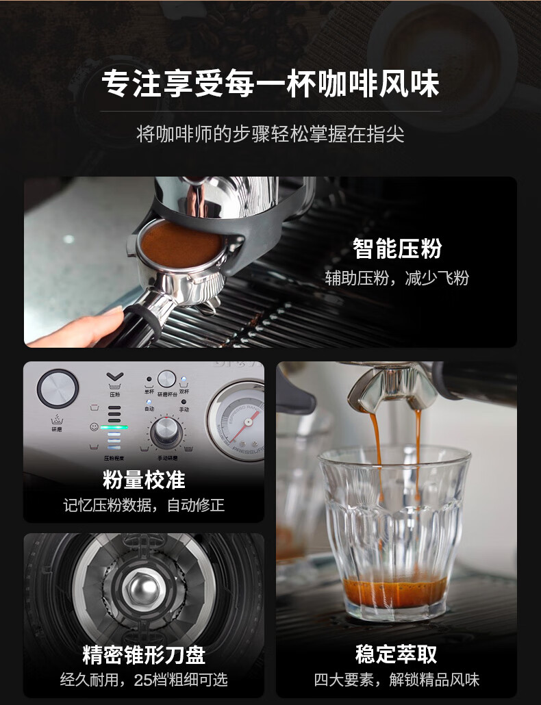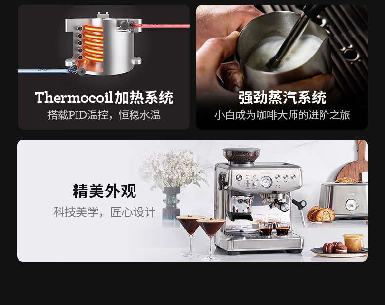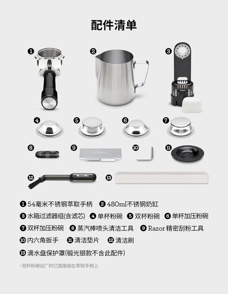 铂富(Breville)BES876 半自动咖啡机 家用意式 研磨奶泡一体式 智能辅助压粉系统 大容量水箱 25挡研磨 锻光银