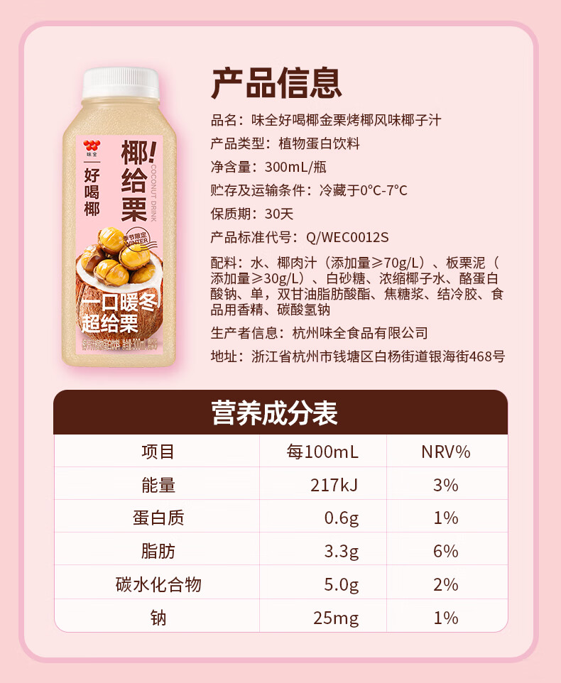 味全 【冬季新品】好喝椰金栗烤椰风味椰子汁300ml*4植物蛋白饮料