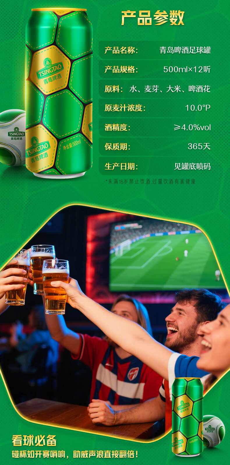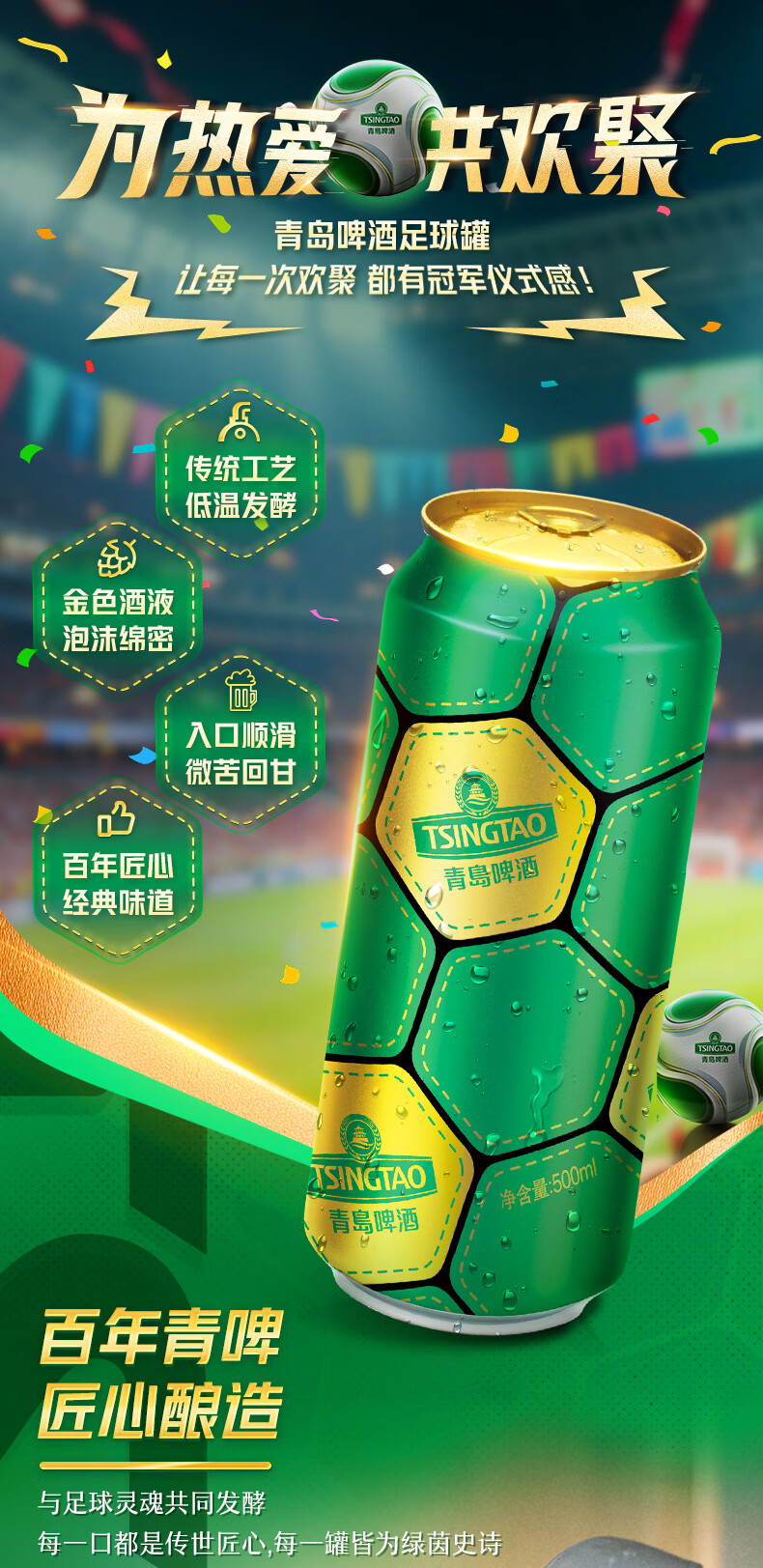 青岛啤酒经典原麦汁浓度10°P啤酒 足球罐啤酒优质原料 500mL 12罐 新版