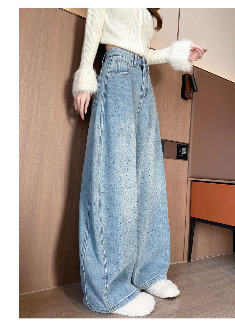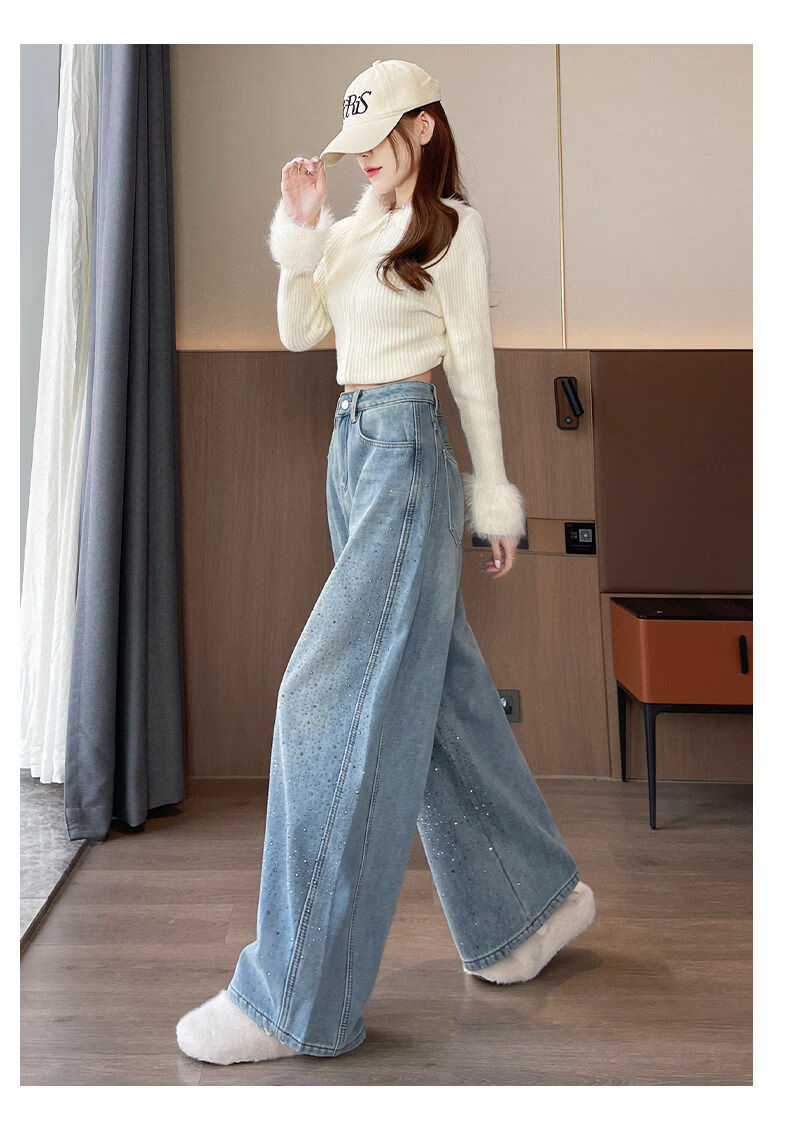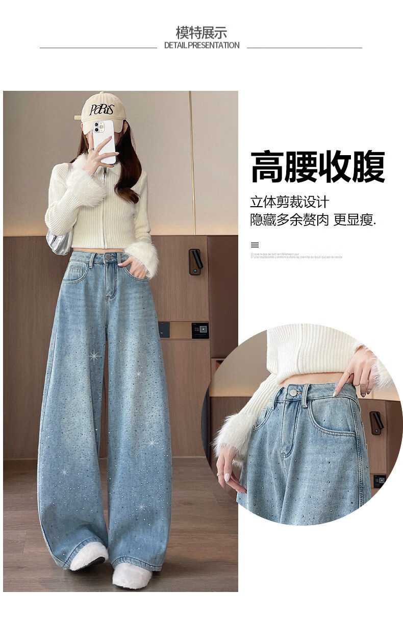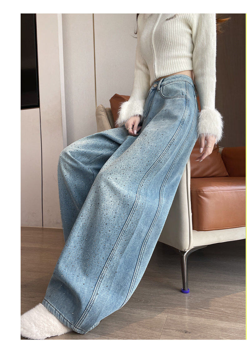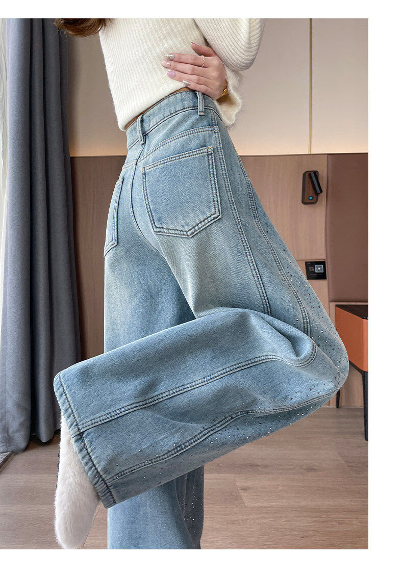 MODX烫钻弯刀牛仔裤2026年新款潮牌女装高腰显瘦显腿长宽松阔腿裤 浅蓝色-加长裤 S