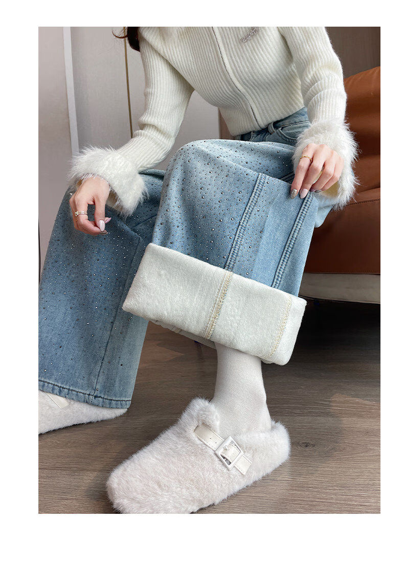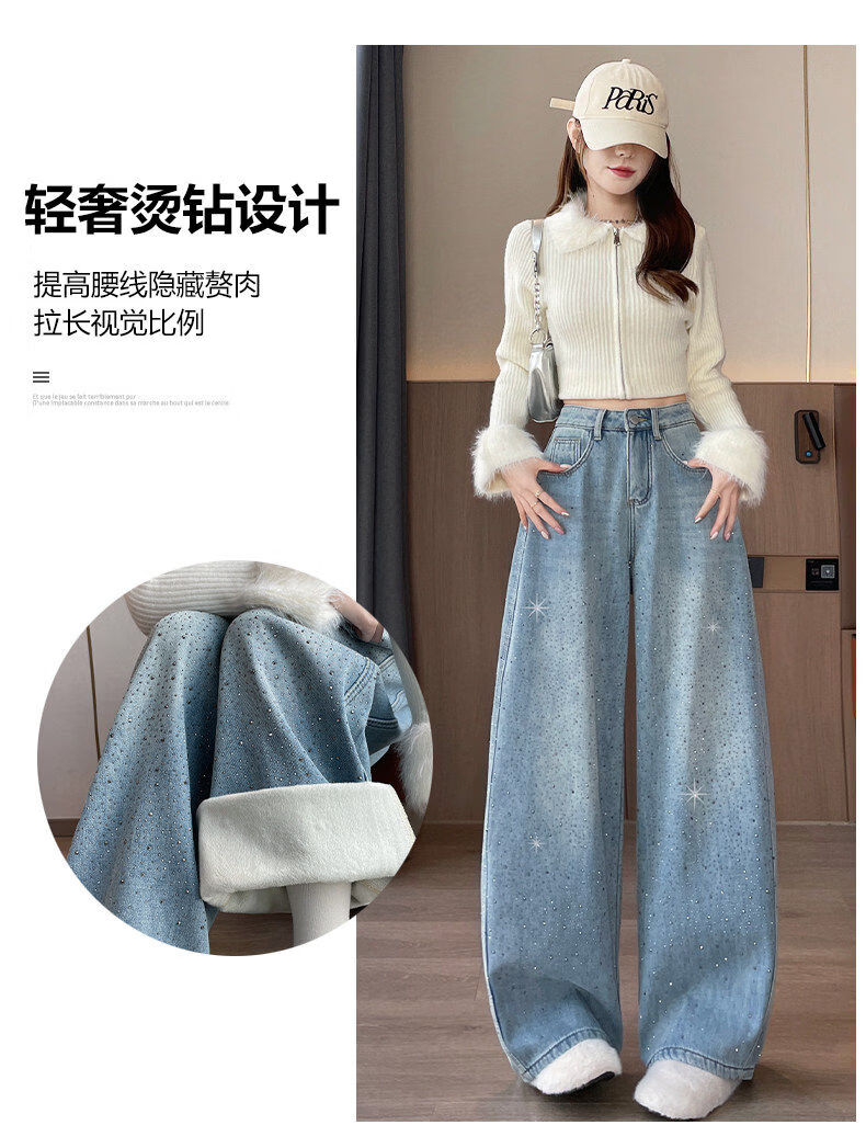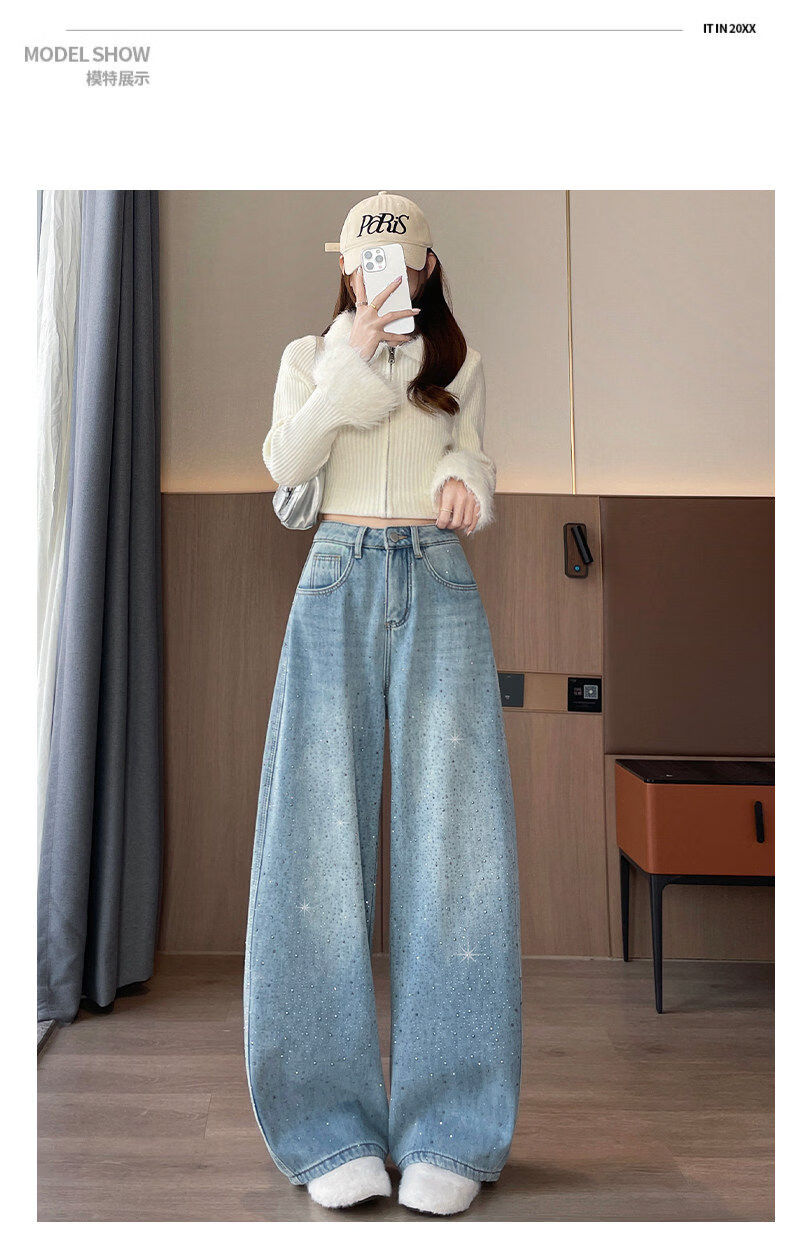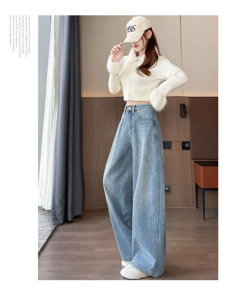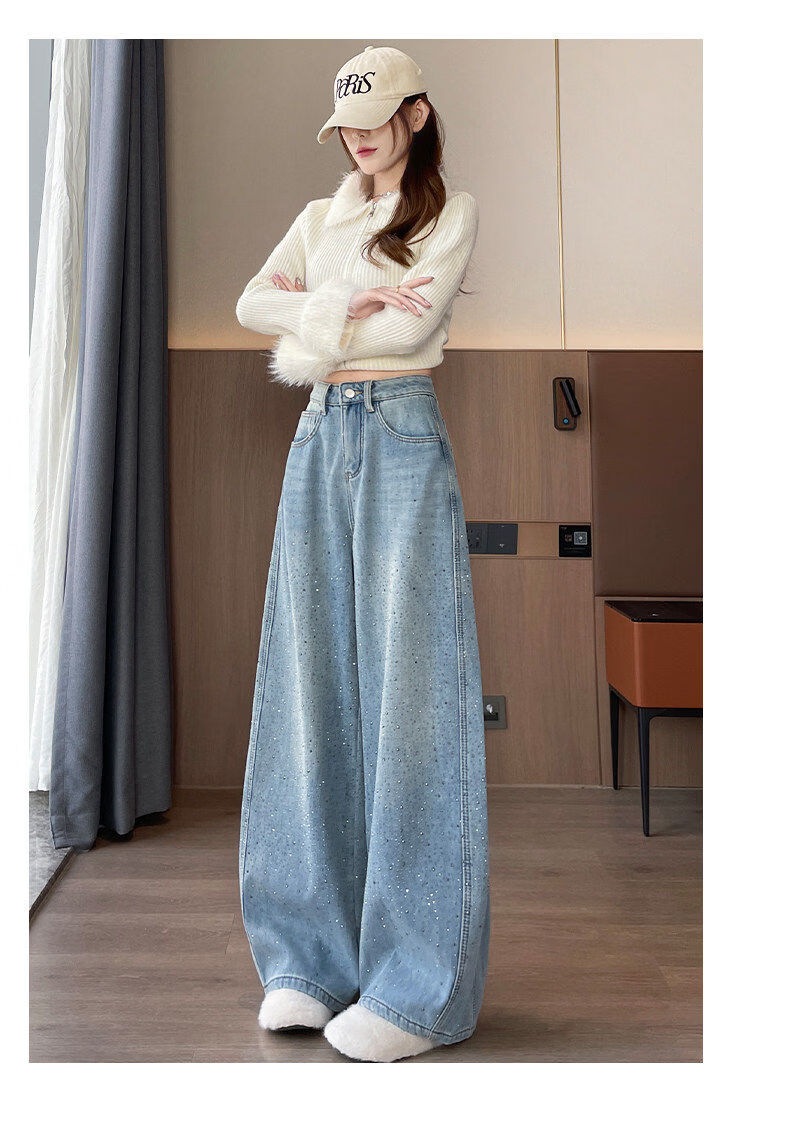 MODX烫钻弯刀牛仔裤2026年新款潮牌女装高腰显瘦显腿长宽松阔腿裤 浅蓝色-加长裤 S