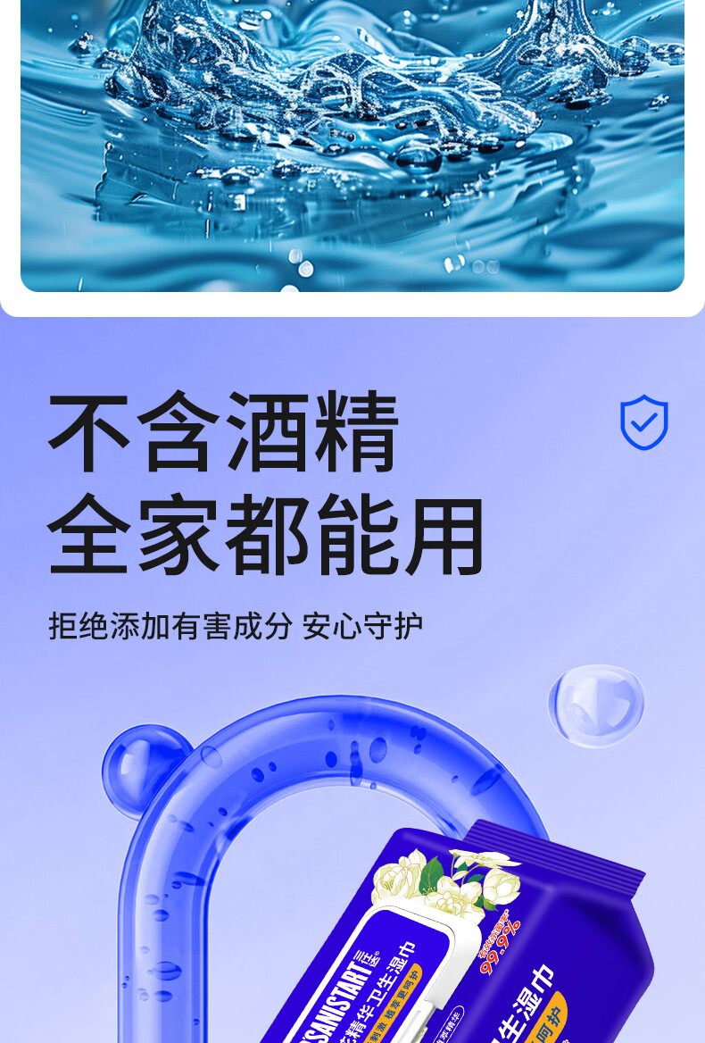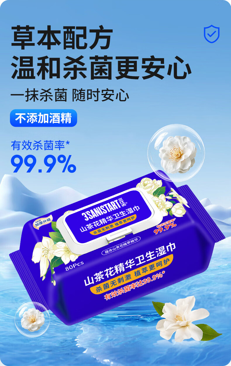 三仕达山茶花杀菌湿巾80片杀菌率99.9%日常卫生消毒湿巾学生在校清洁巾 80片*3包【外出旅行99.9%杀菌】