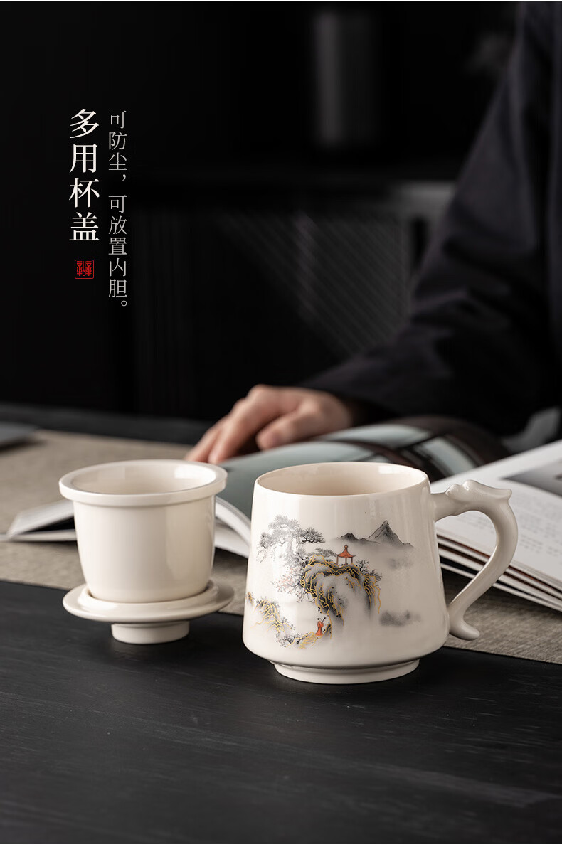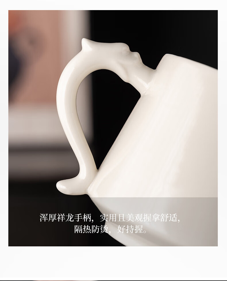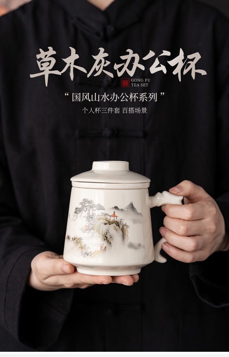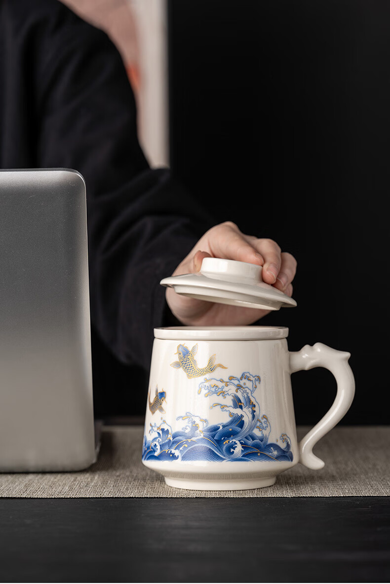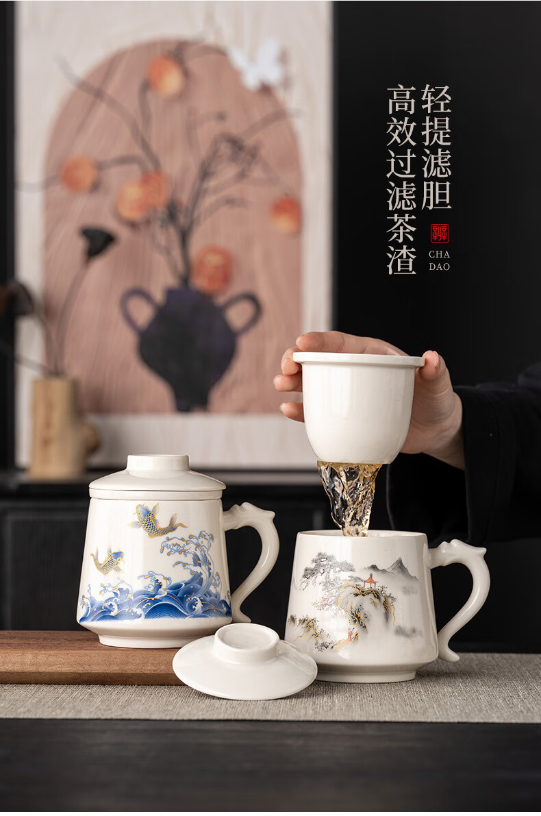 韵化【精选百货】茶杯茶水分离陶瓷个人专用马克水杯高档办公杯公司活 草木灰【鱼跃】龙把办公杯三件套