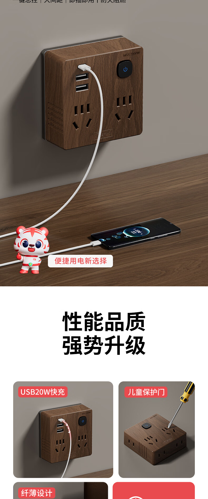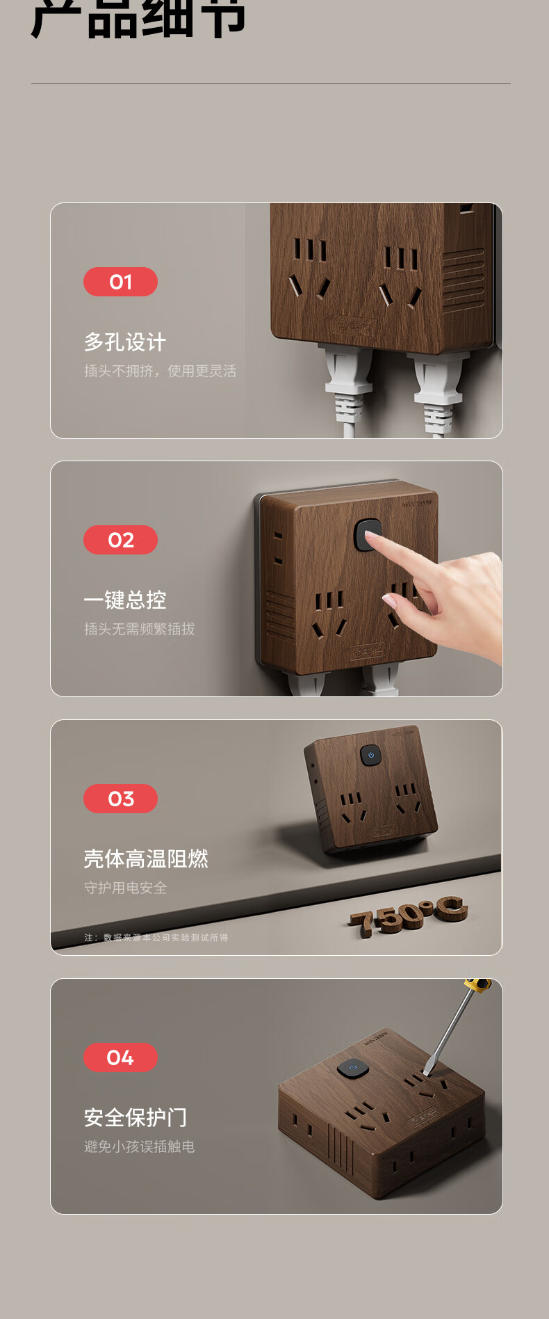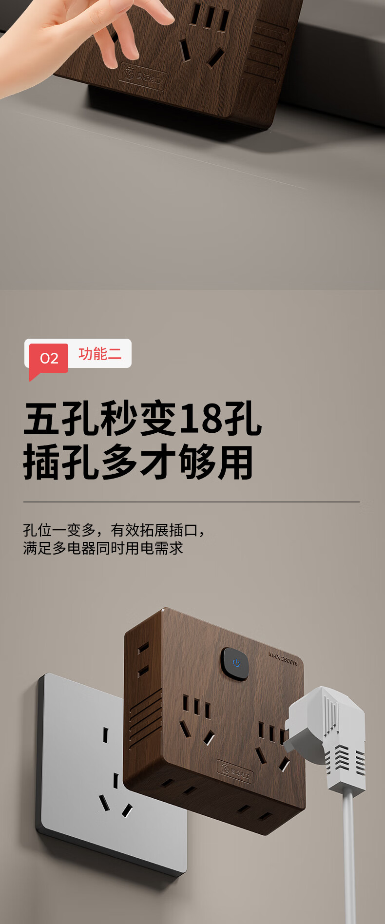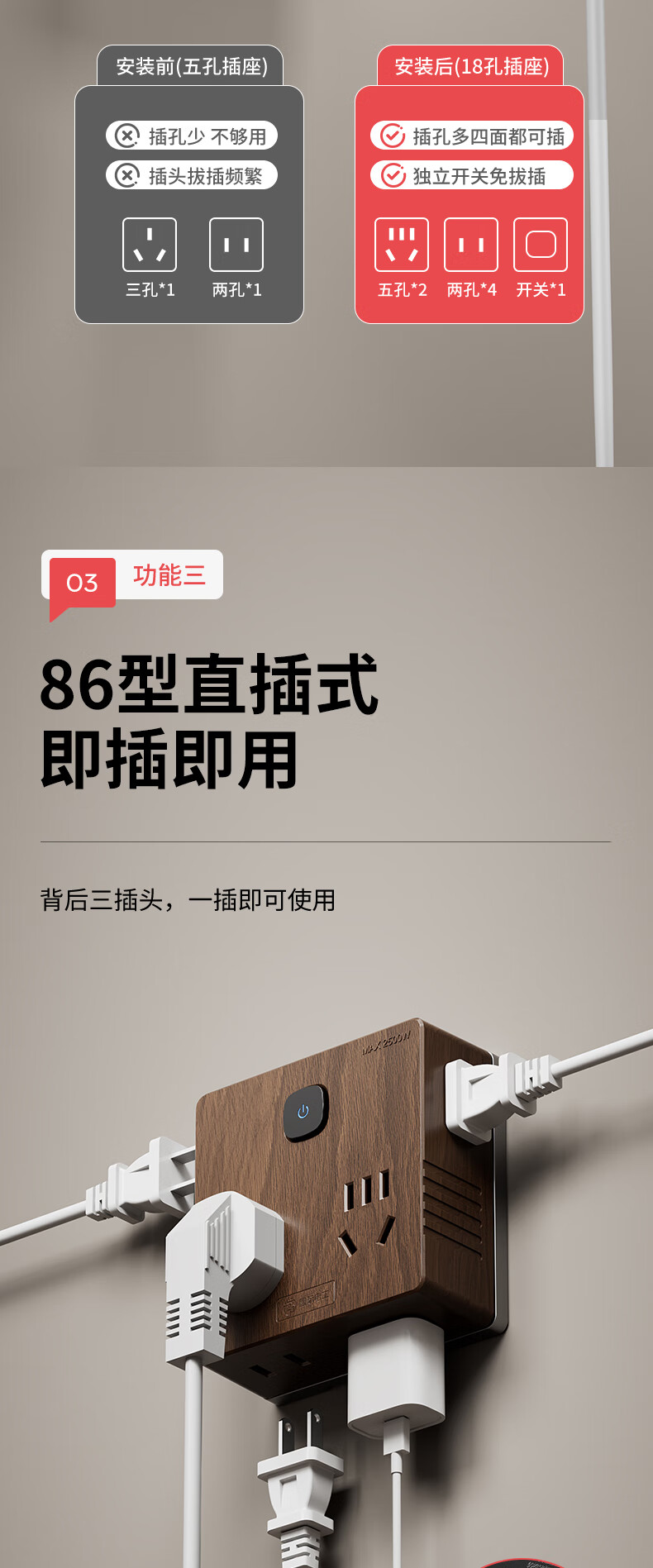 国际电工86型扩展插座一转多功能墙壁转换插头床头书桌直插式拓展插座 胡桃木色丨一转四插座(14孔)