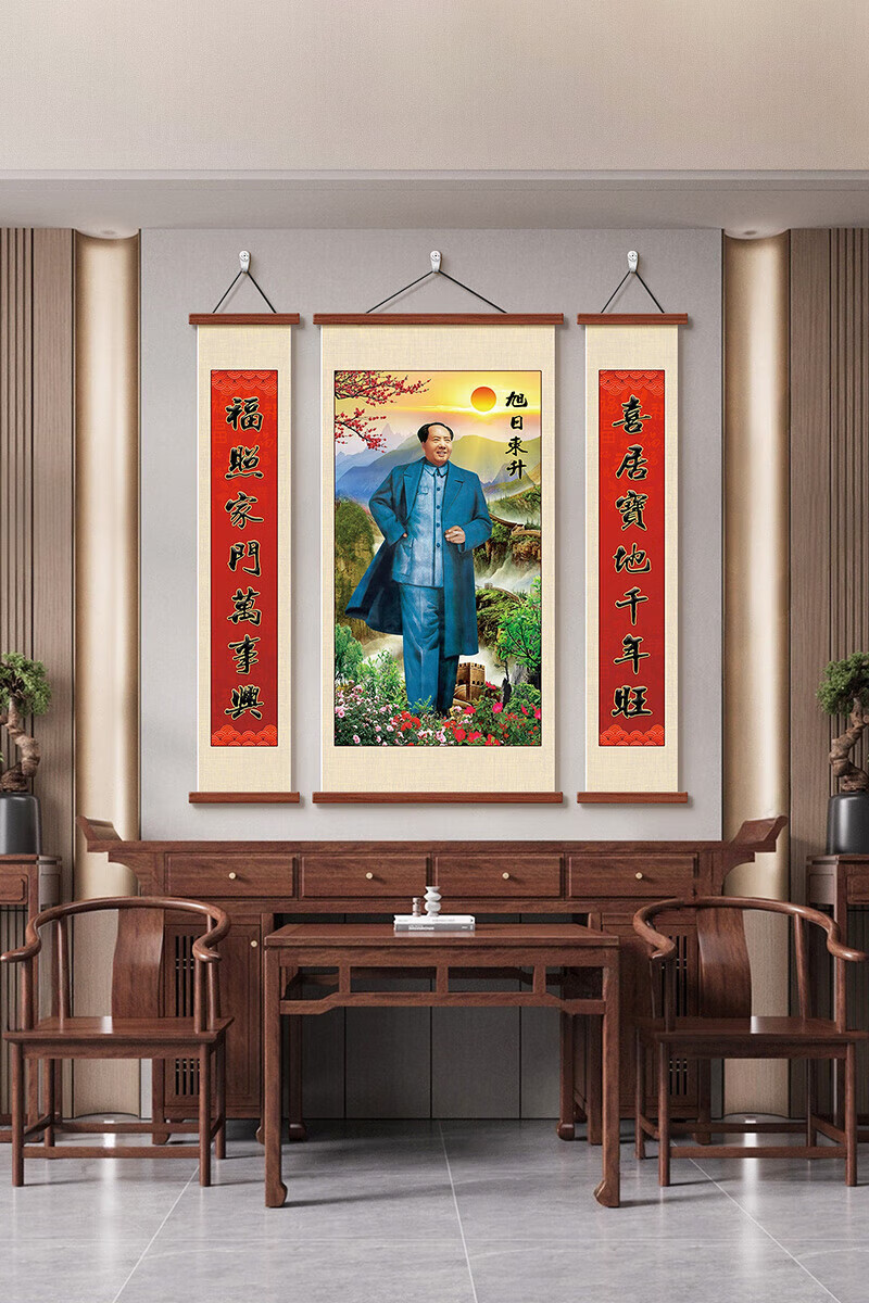 翰鸥斐毛泽东挂画中堂画客厅挂画画像农村堂屋背景墙画伟人毛主席 8234毛主席D 中间宽80*160cm 左右宽40*高160cm 红木色(红花梨木挂轴)+黑色麻绳