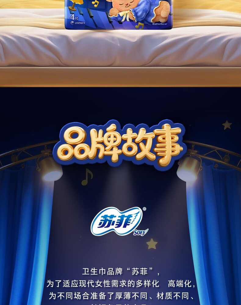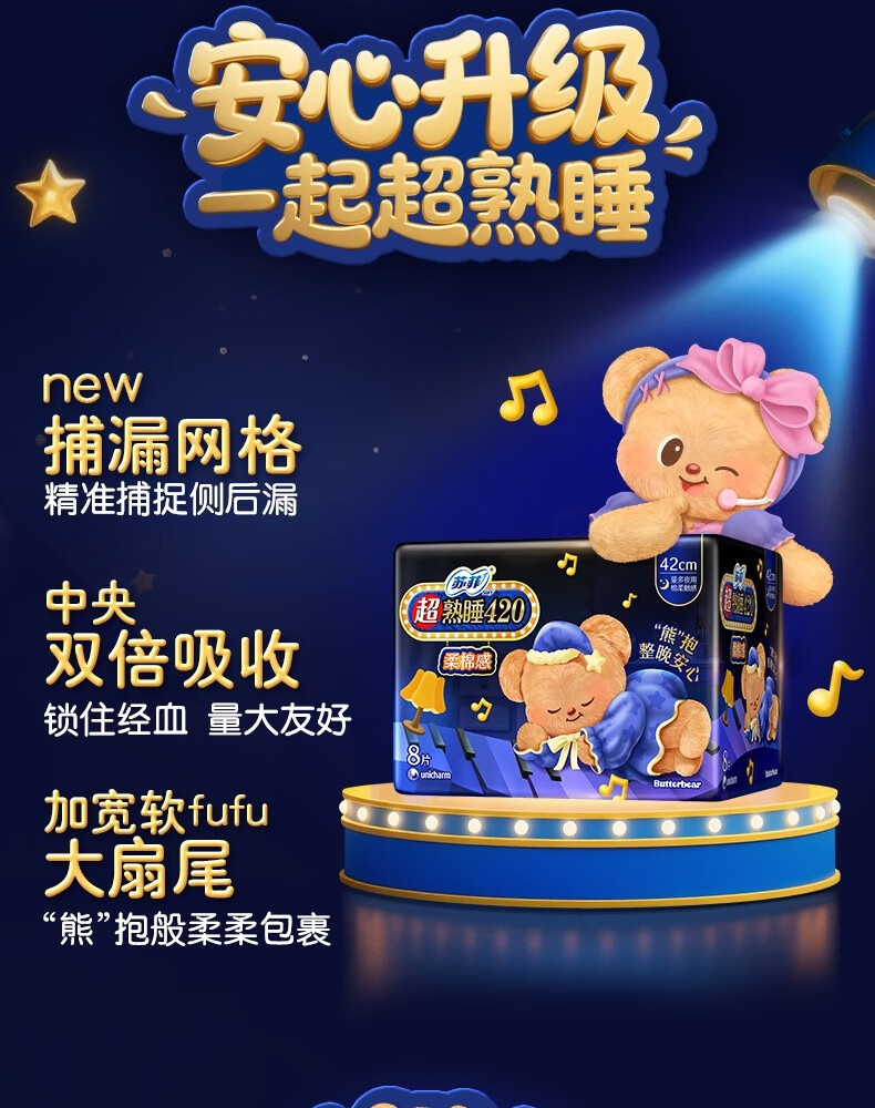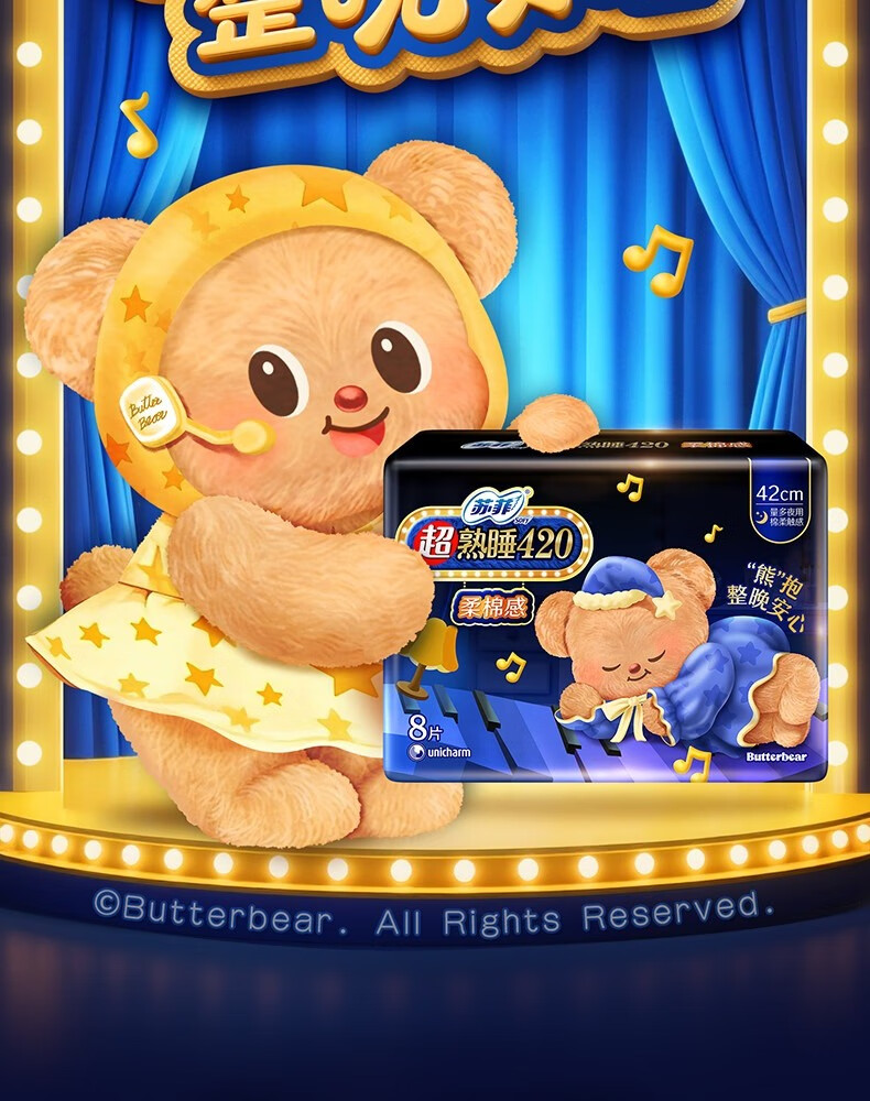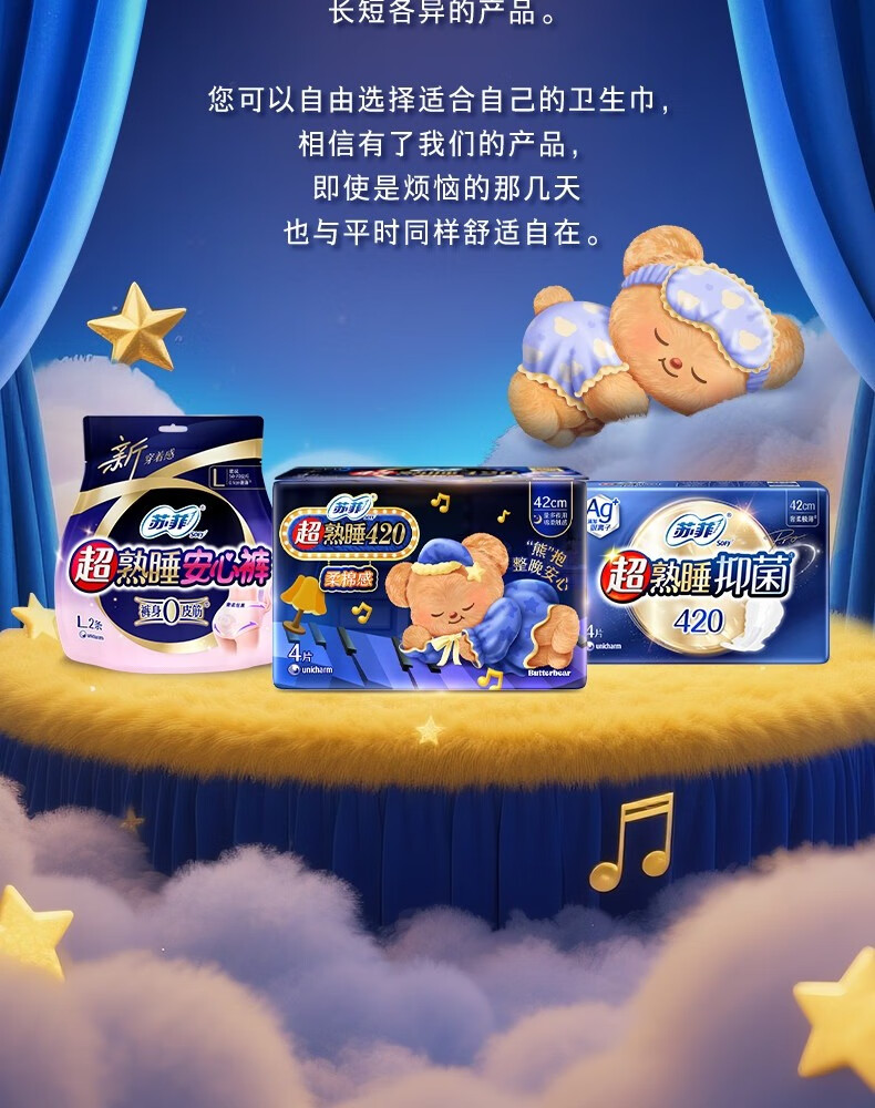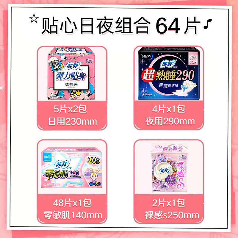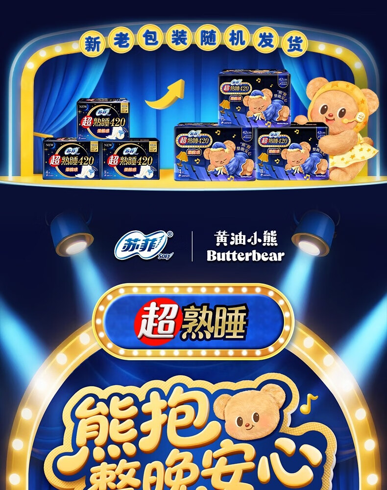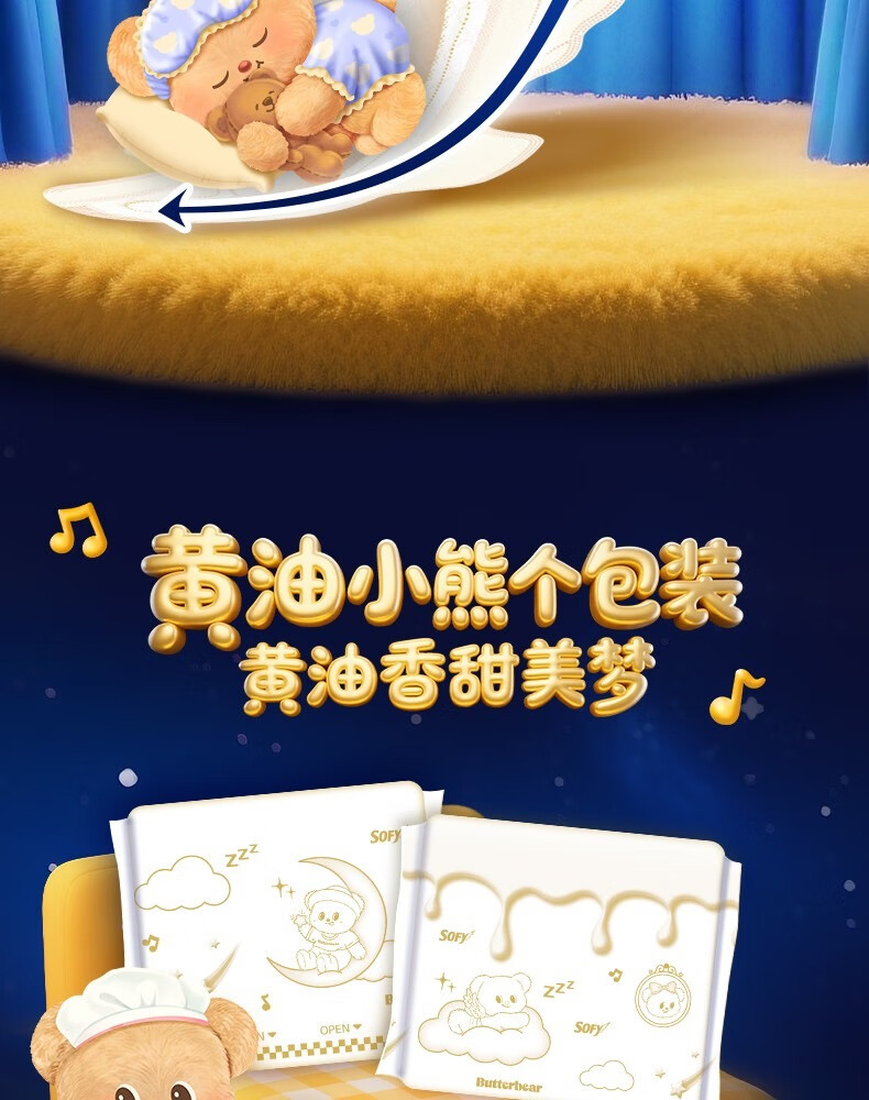 苏菲卫生巾黄油小熊夜用超熟睡420mm柔棉感超长整箱组合装姨妈巾 苏菲日夜组合64片