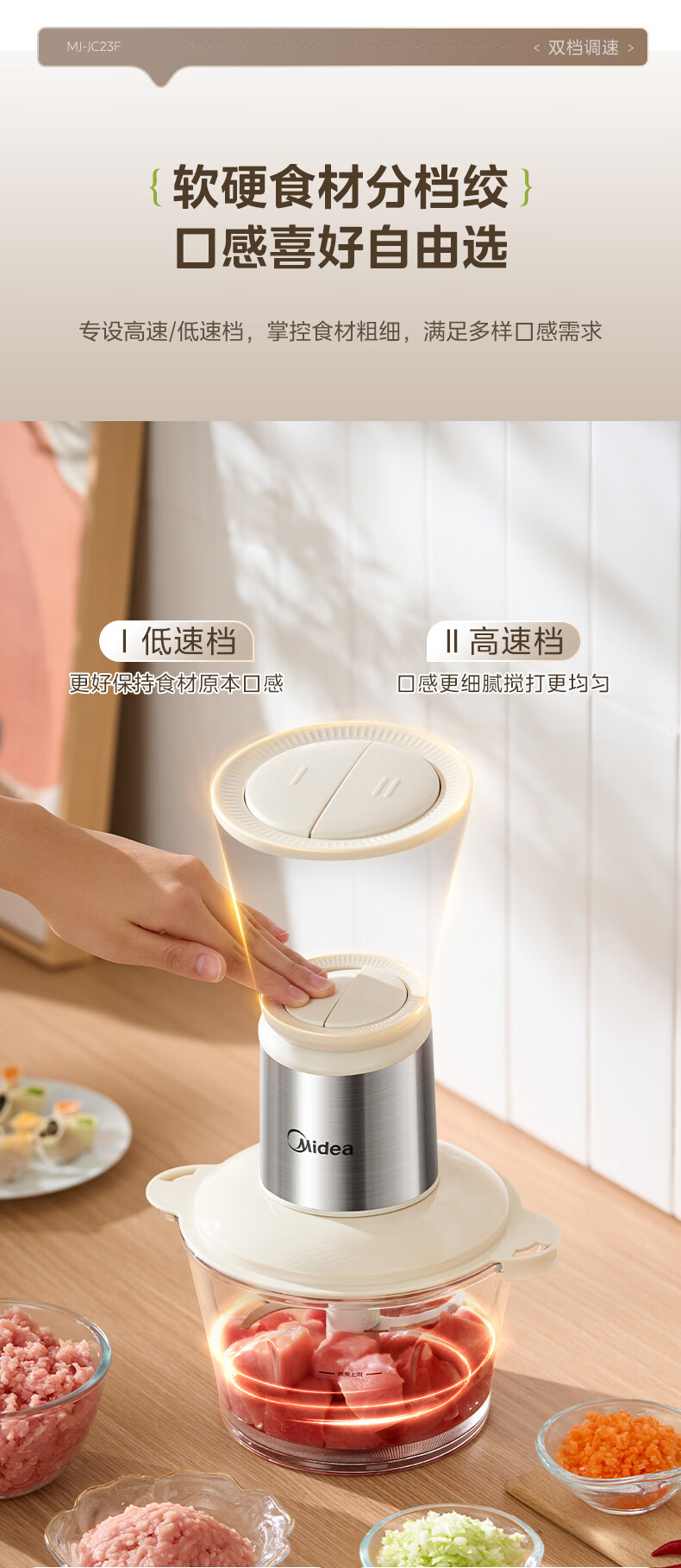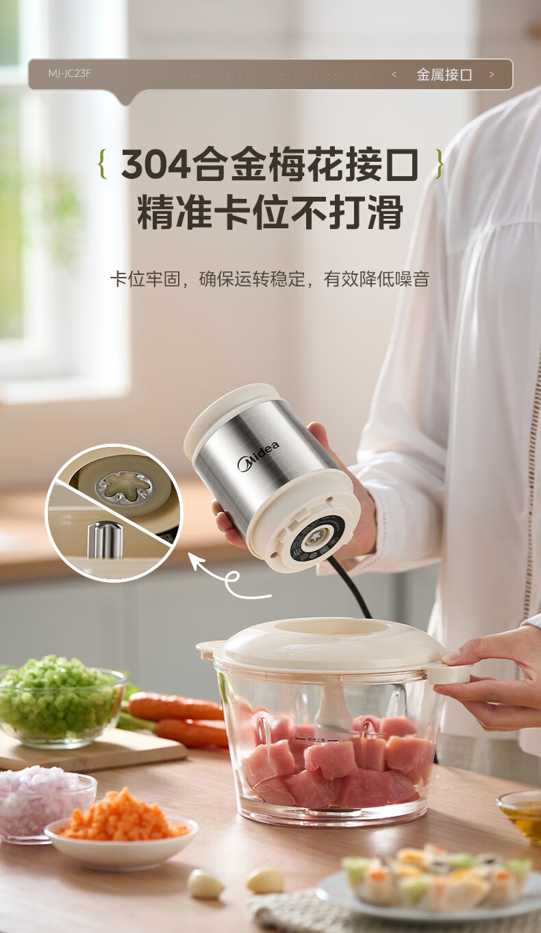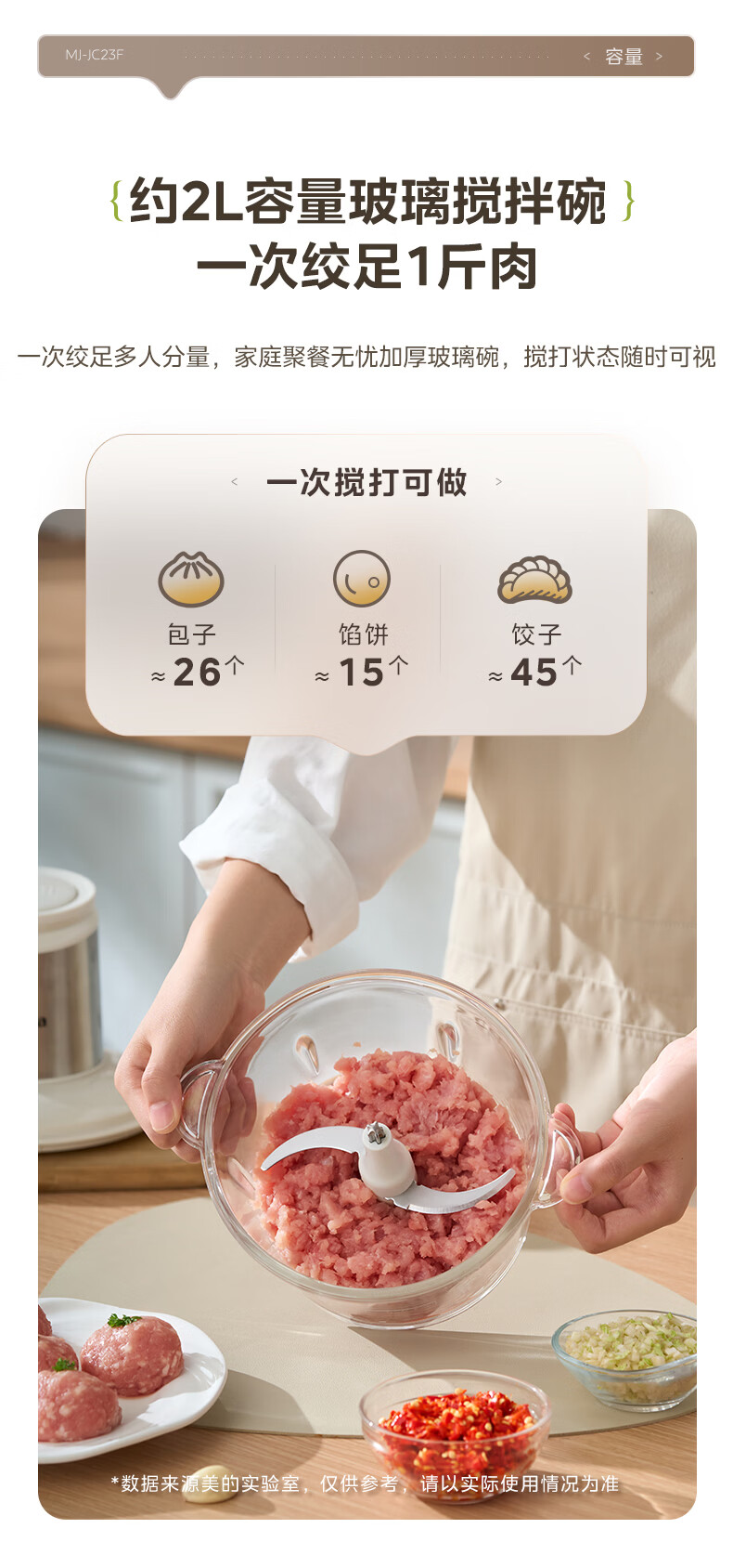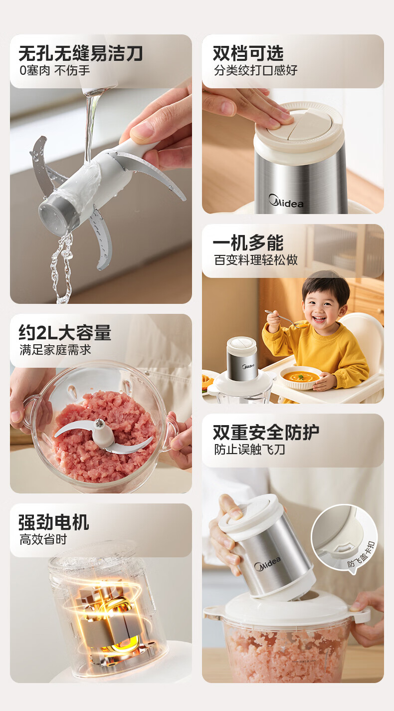 美的(Midea)绞肉机家用 多功能电动碎肉机 小型家庭搅馅机切肉机 料理机搅拌机搅打机 打蒜器婴儿辅食机 【单刀双档+无孔易洁】 2L JC23F