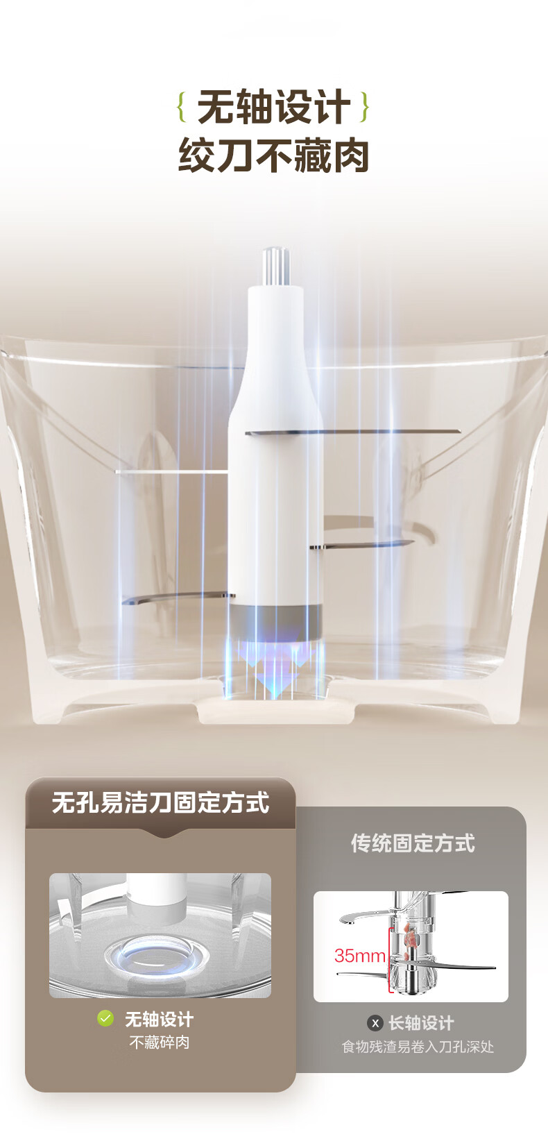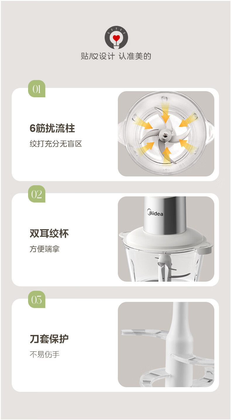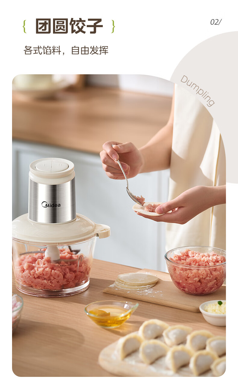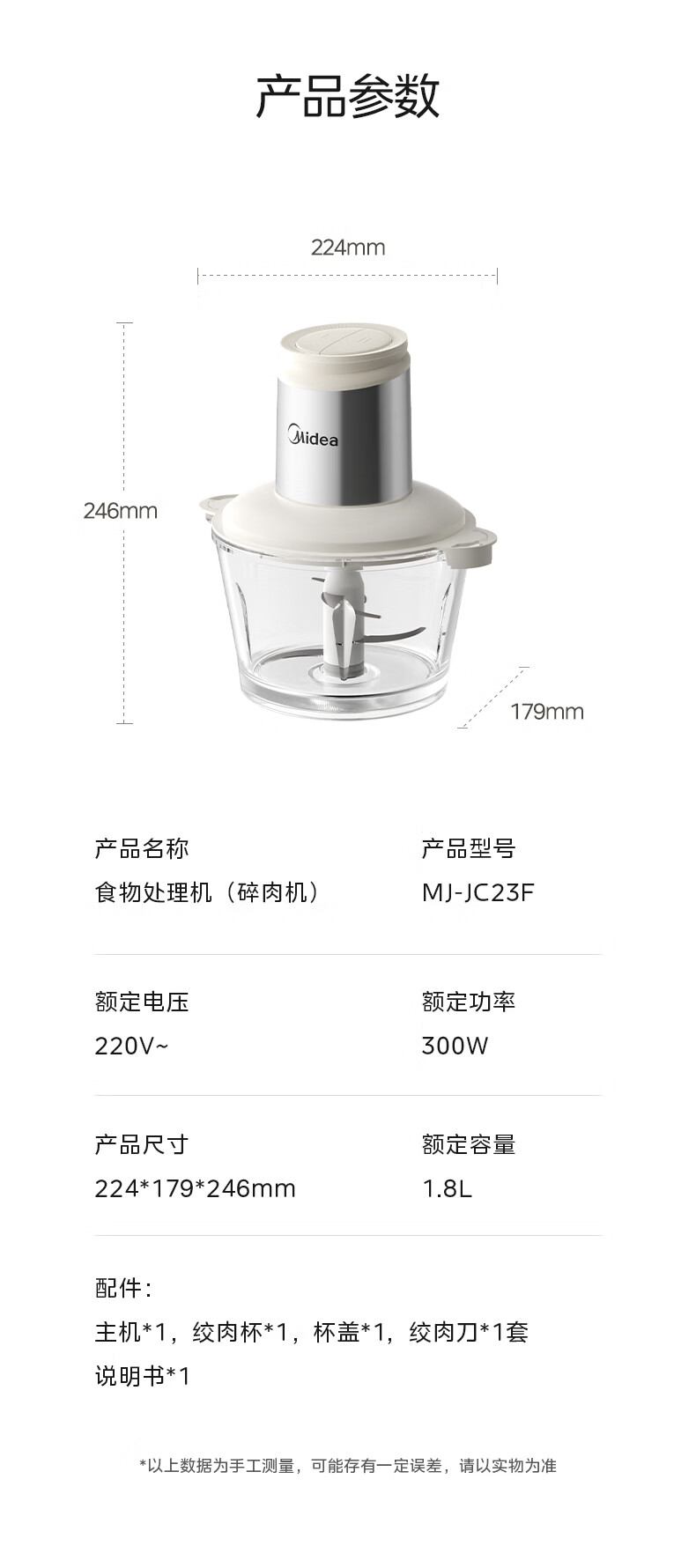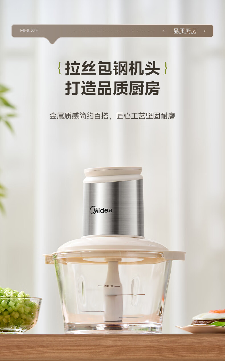 美的(Midea)绞肉机家用 多功能电动碎肉机 小型家庭搅馅机切肉机 料理机搅拌机搅打机 打蒜器婴儿辅食机 【单刀双档+无孔易洁】 2L JC23F