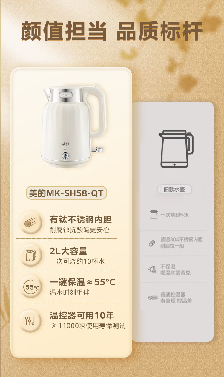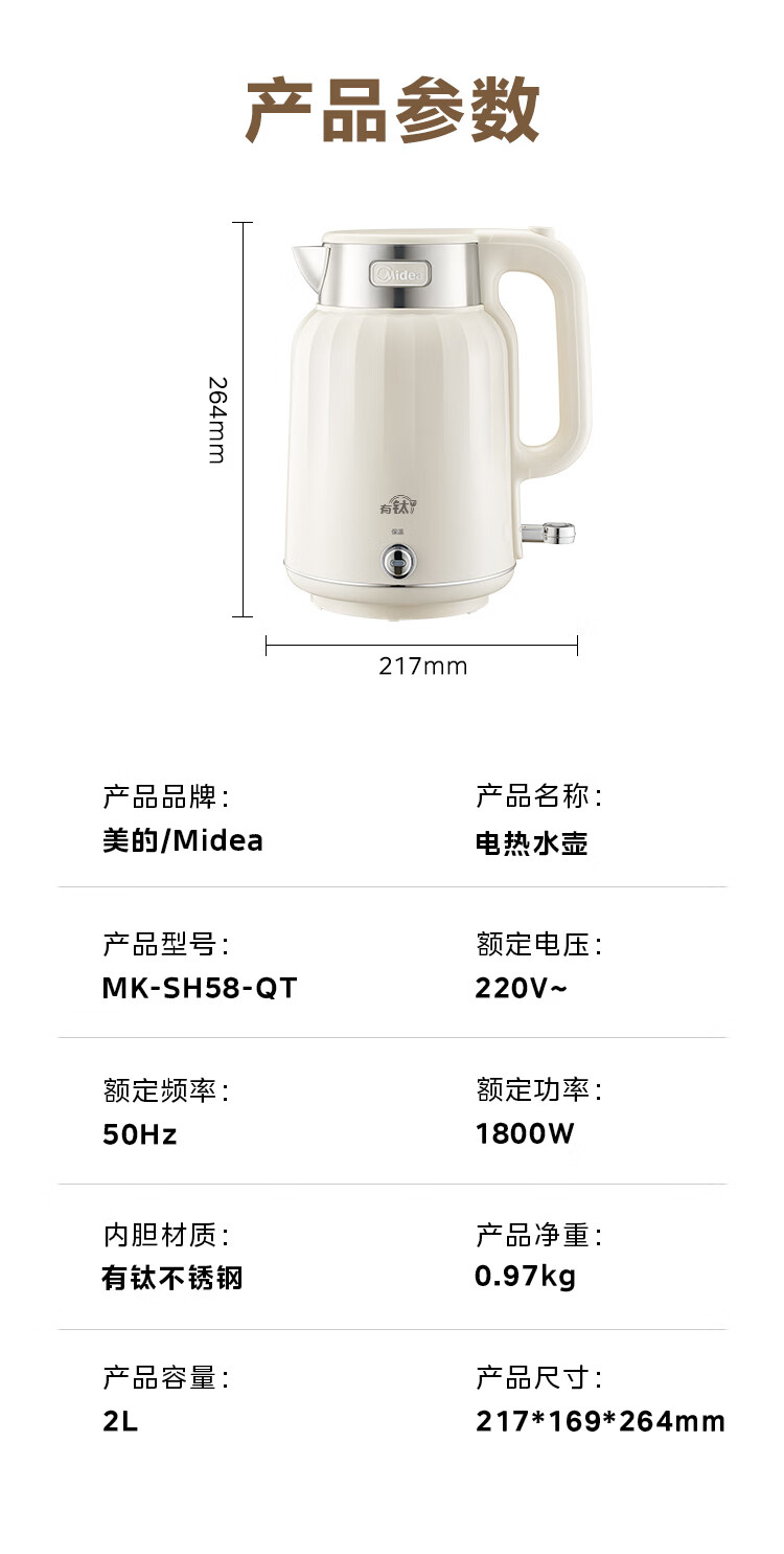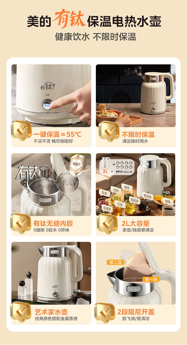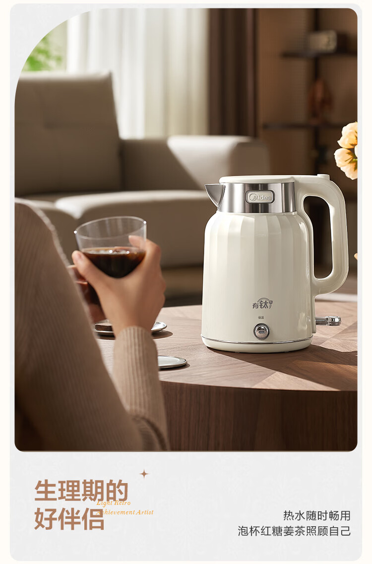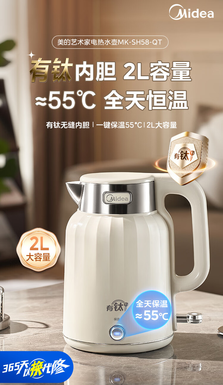 美的(Midea)电热水壶有钛材质艺术家恒温烧水壶自动断电保温一体2L大容量不锈钢无缝一体内胆MK-SH58-QT