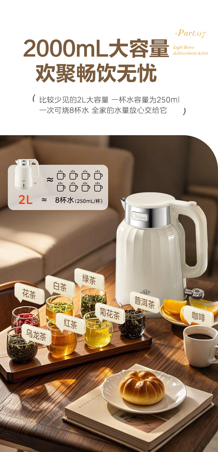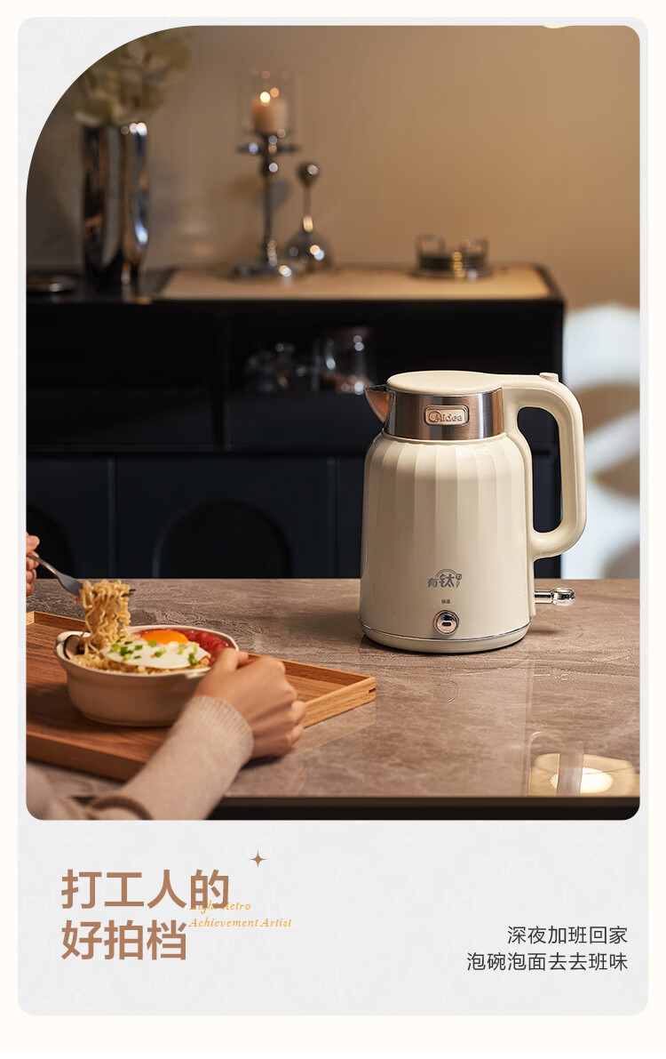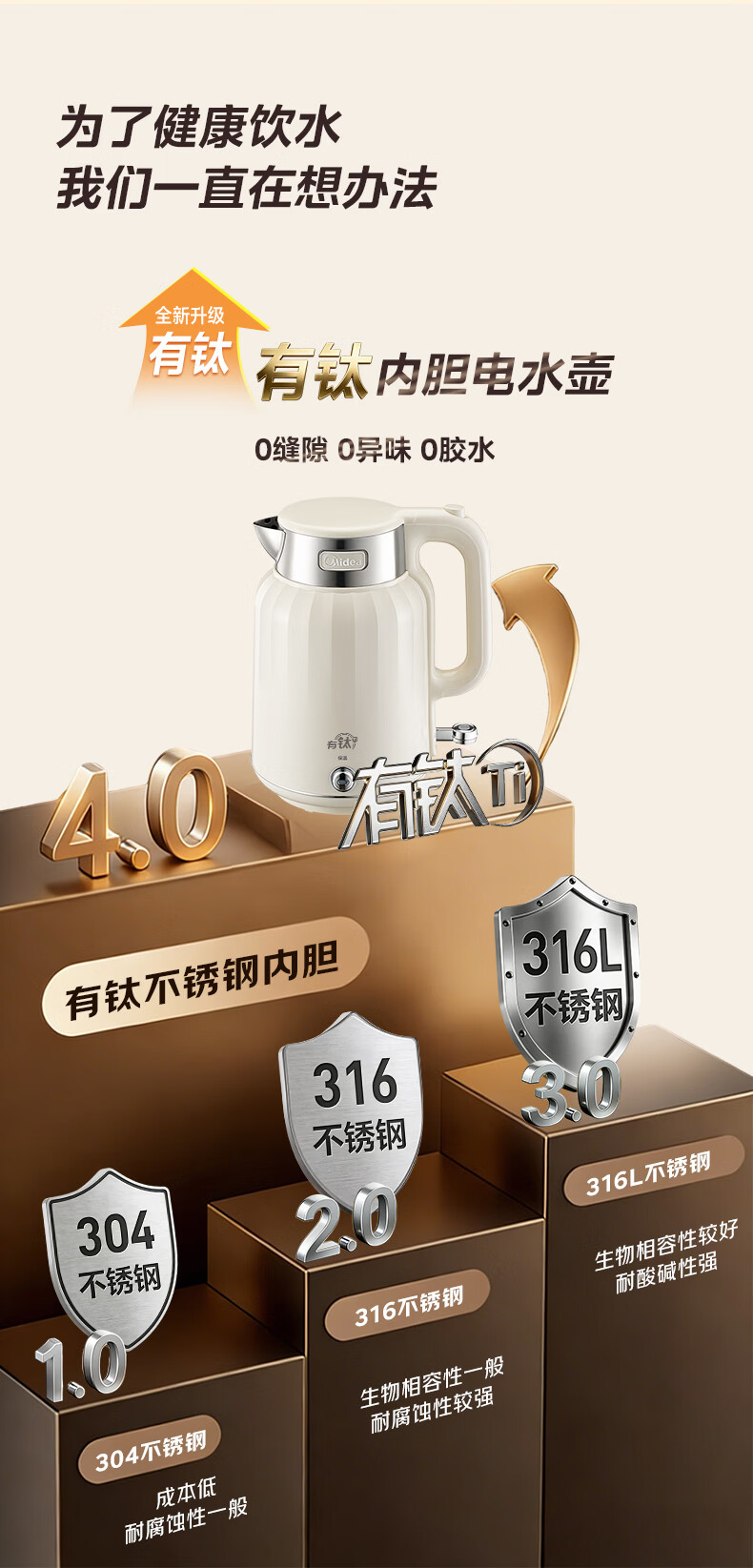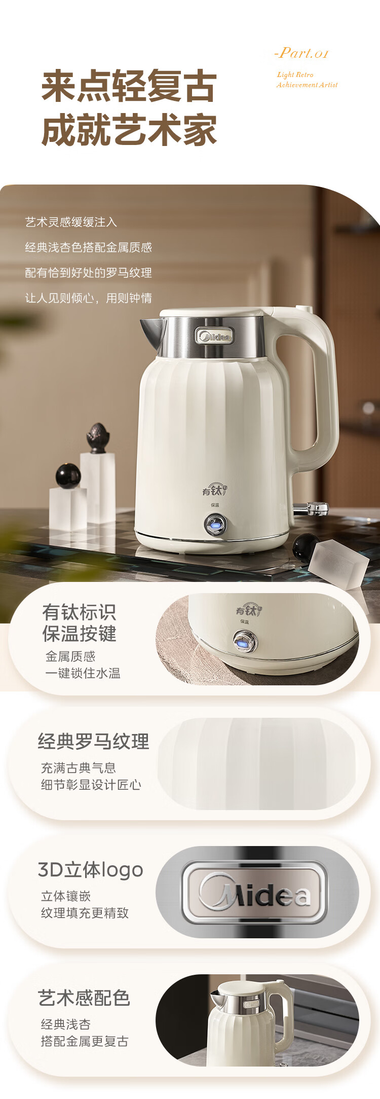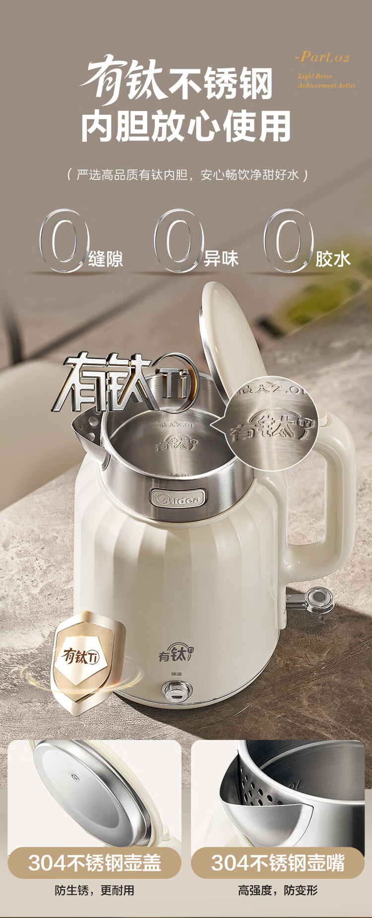 美的(Midea)电热水壶有钛材质艺术家恒温烧水壶自动断电保温一体2L大容量不锈钢无缝一体内胆MK-SH58-QT