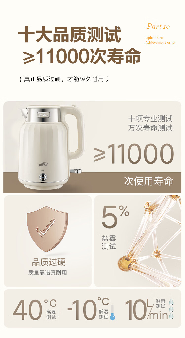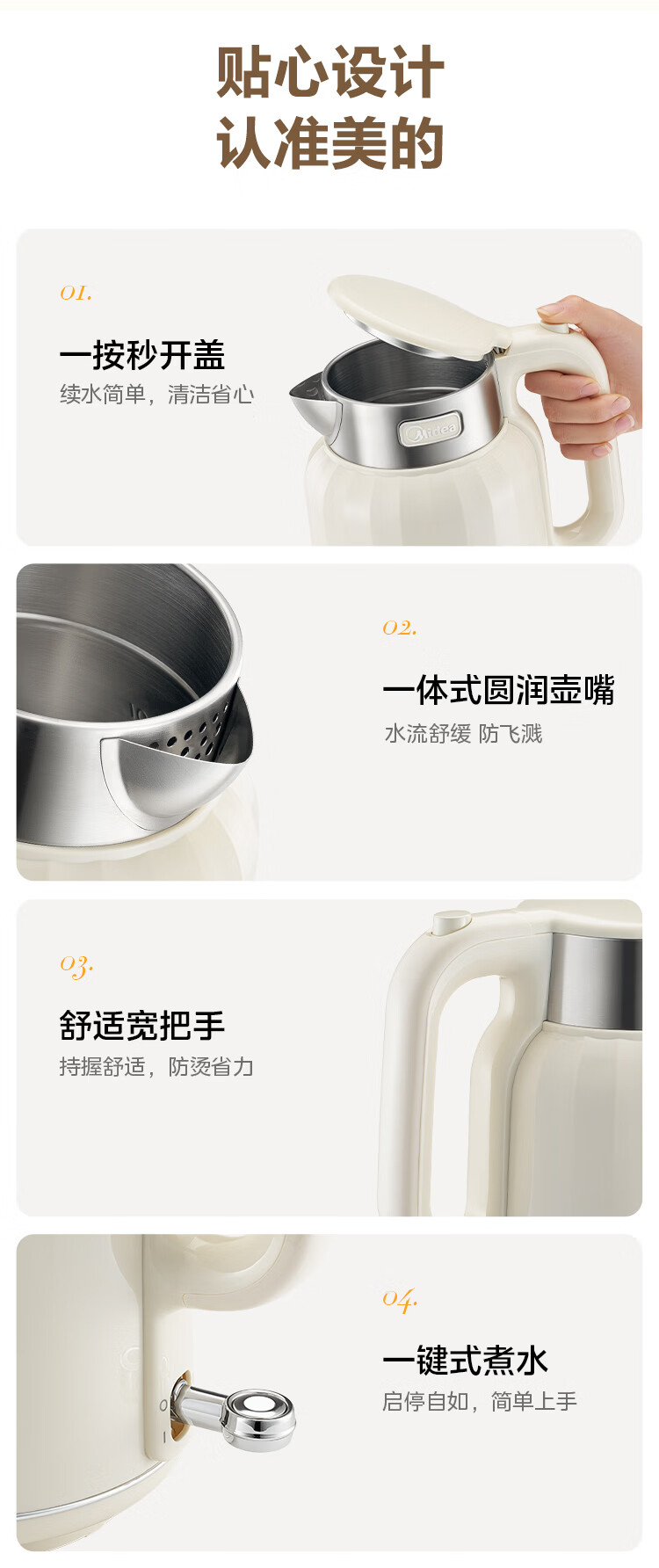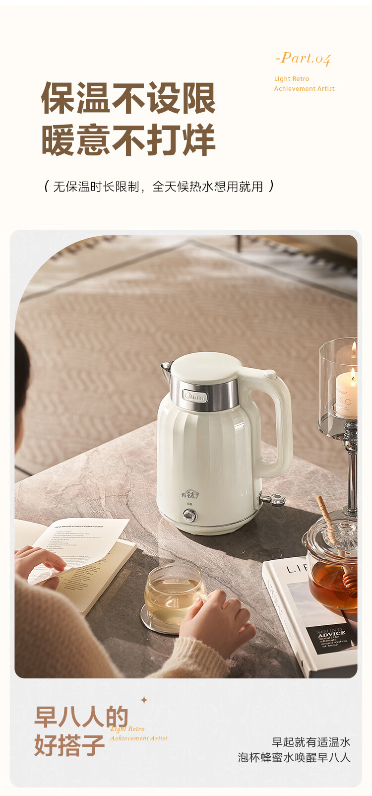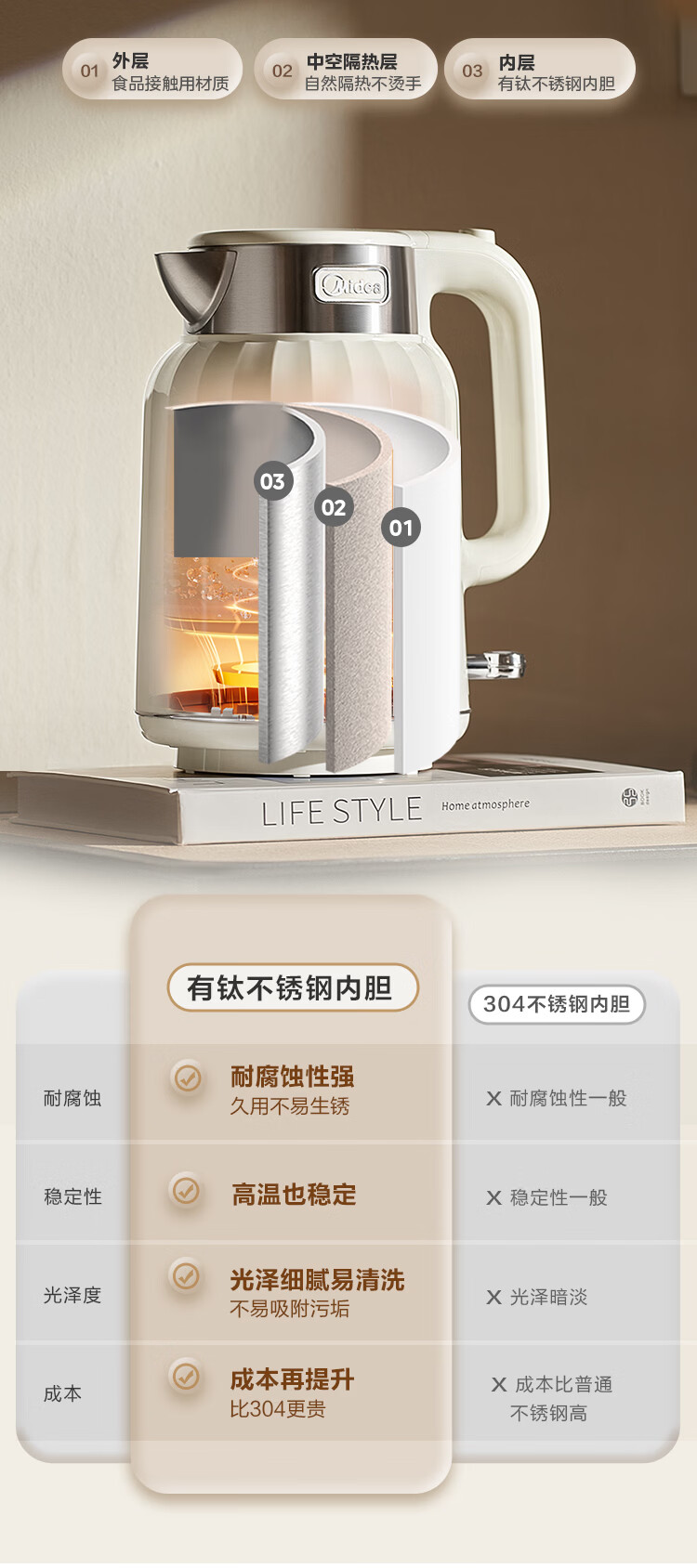 美的(Midea)电热水壶有钛材质艺术家恒温烧水壶自动断电保温一体2L大容量不锈钢无缝一体内胆MK-SH58-QT