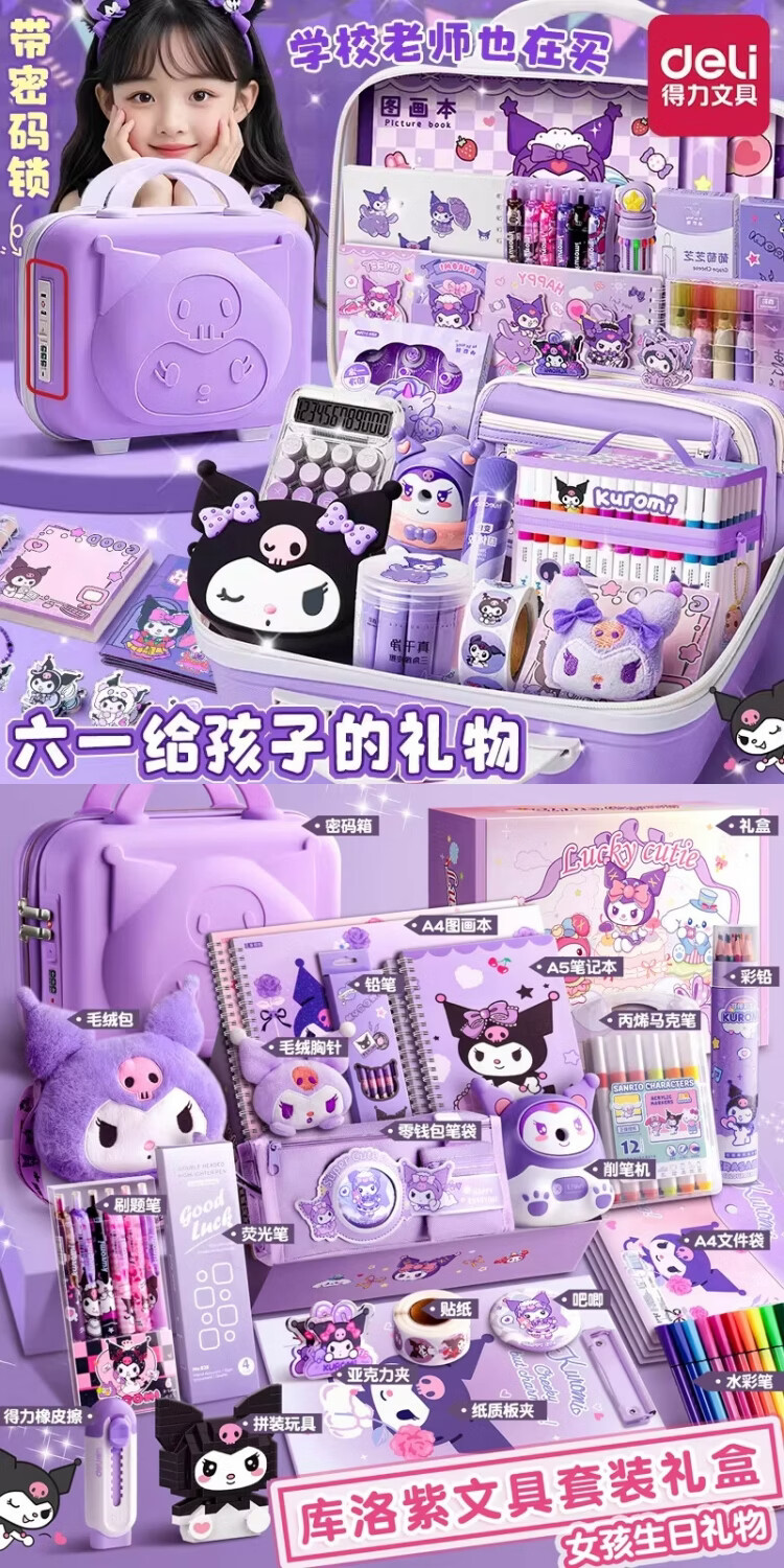 得力库洛米文具套装礼盒盲盒大礼包学习用品女孩小学生一年级学霸儿童铅笔套盒文具用品女生高颜值 【库洛紫】奢华款+3D密码箱