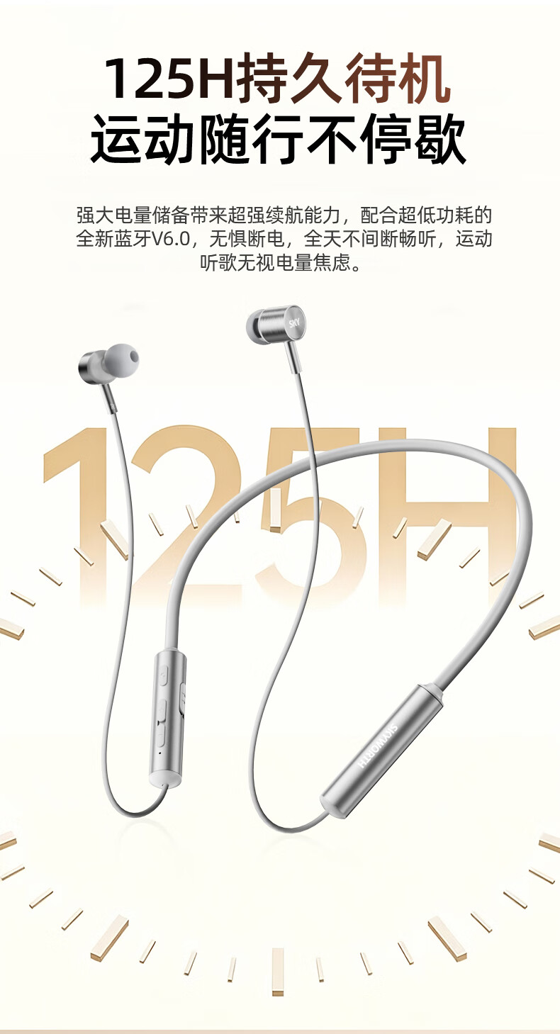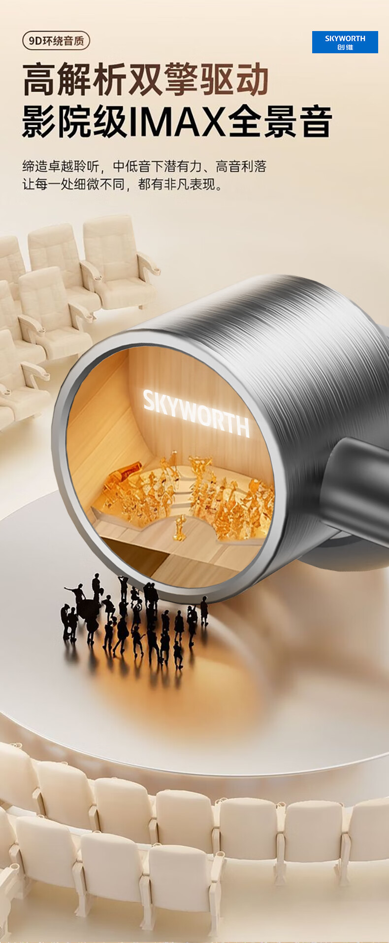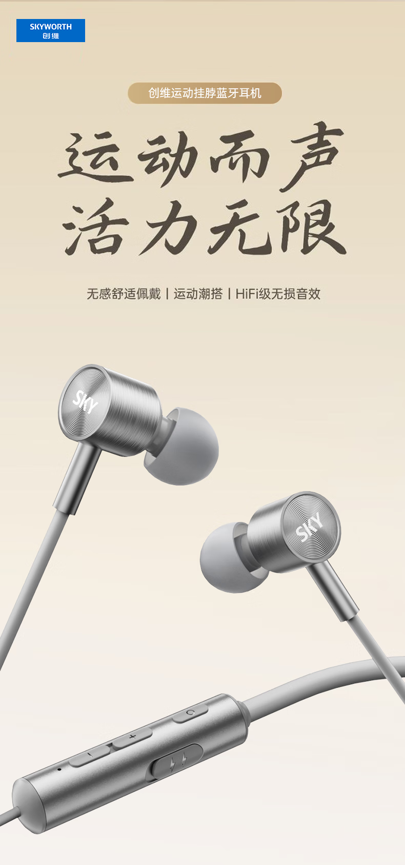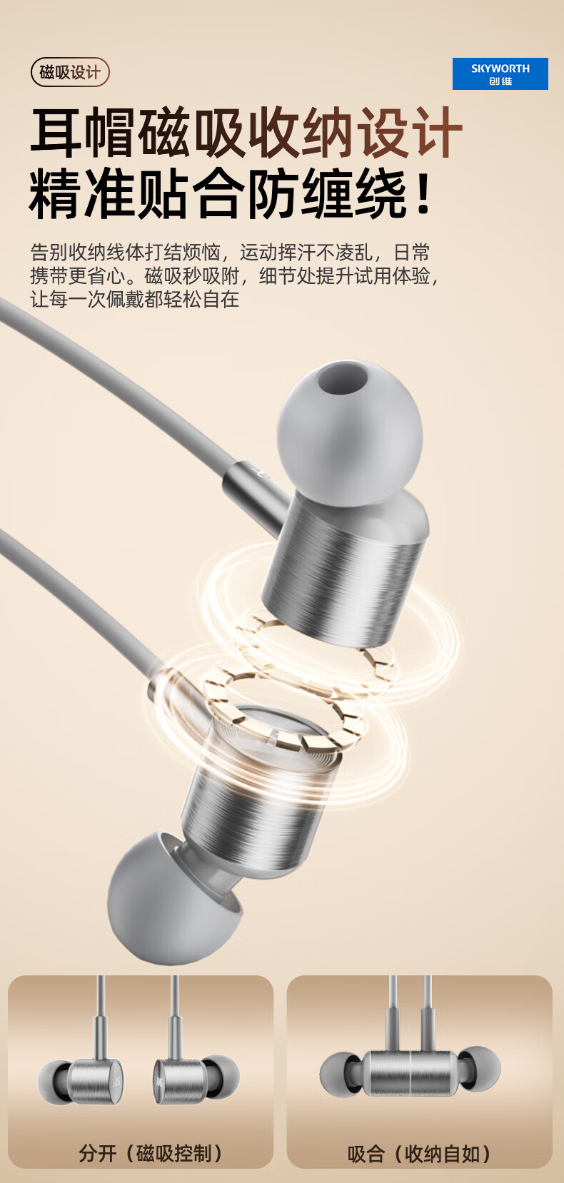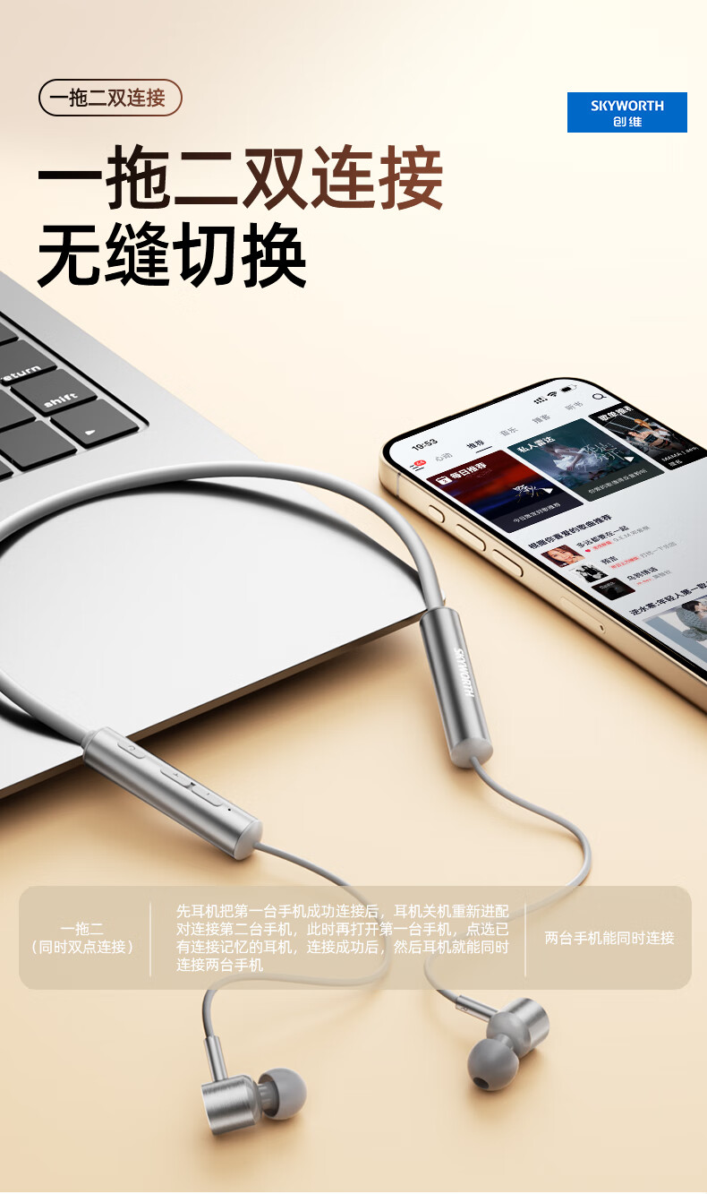 创维(Skyworth)重磅首发丨千元级音质】W5 Lite银色 蓝牙耳机挂脖式颈挂式无线大电量待机运动降噪挂耳式新年送礼