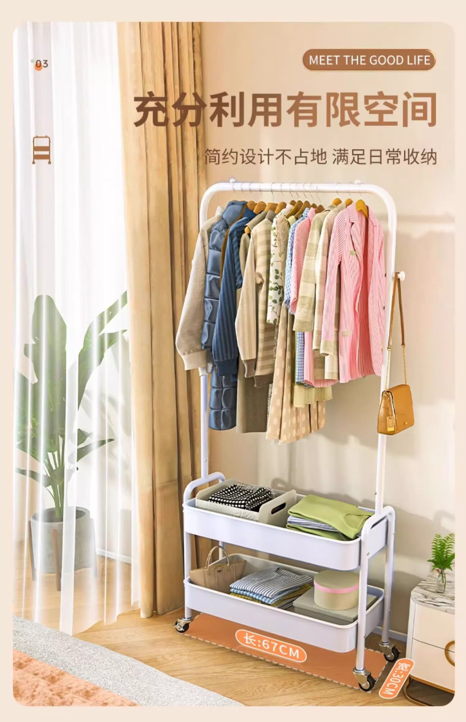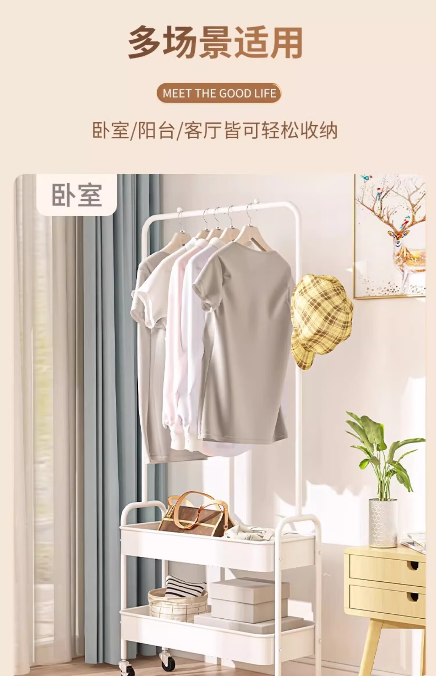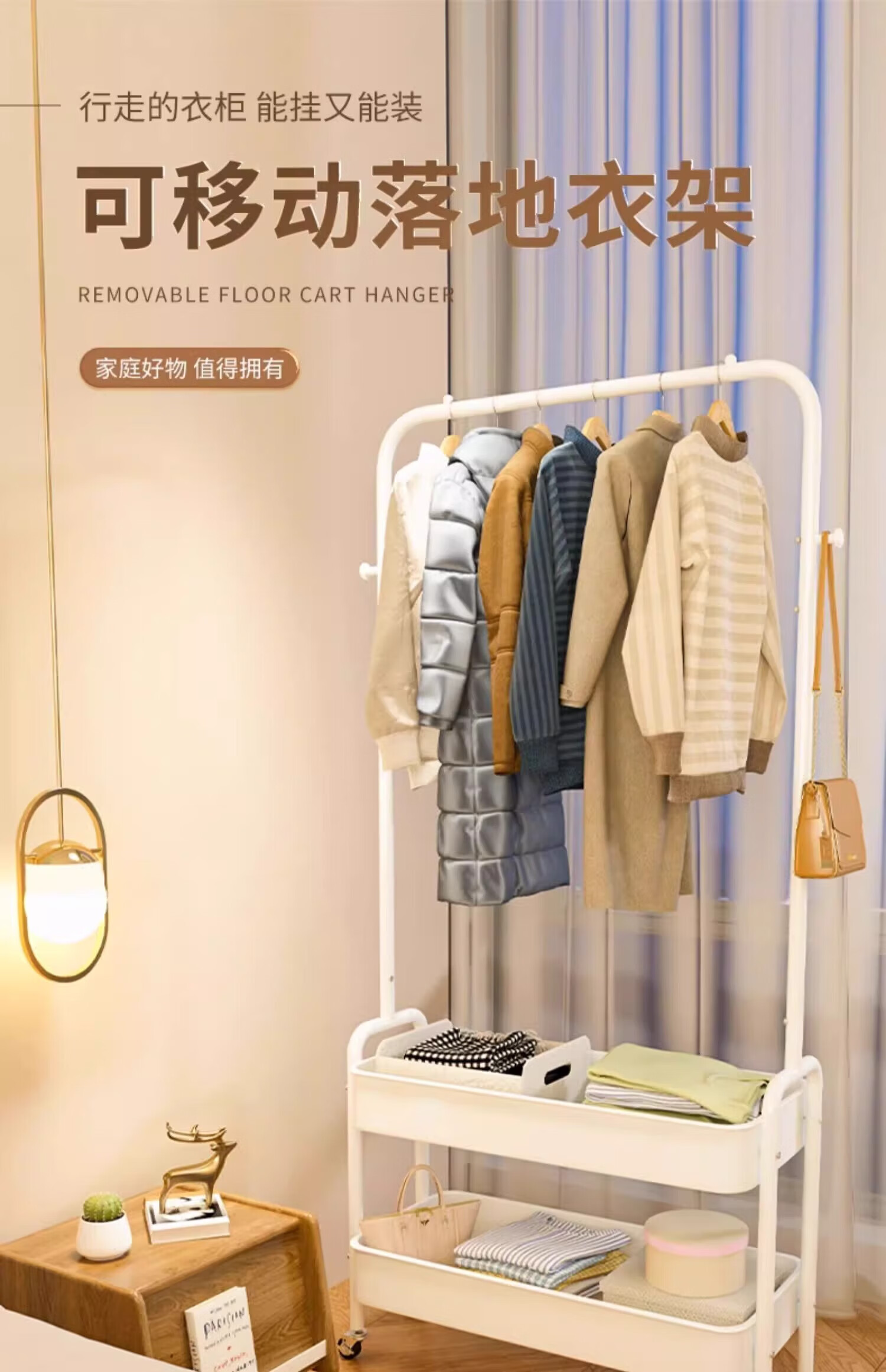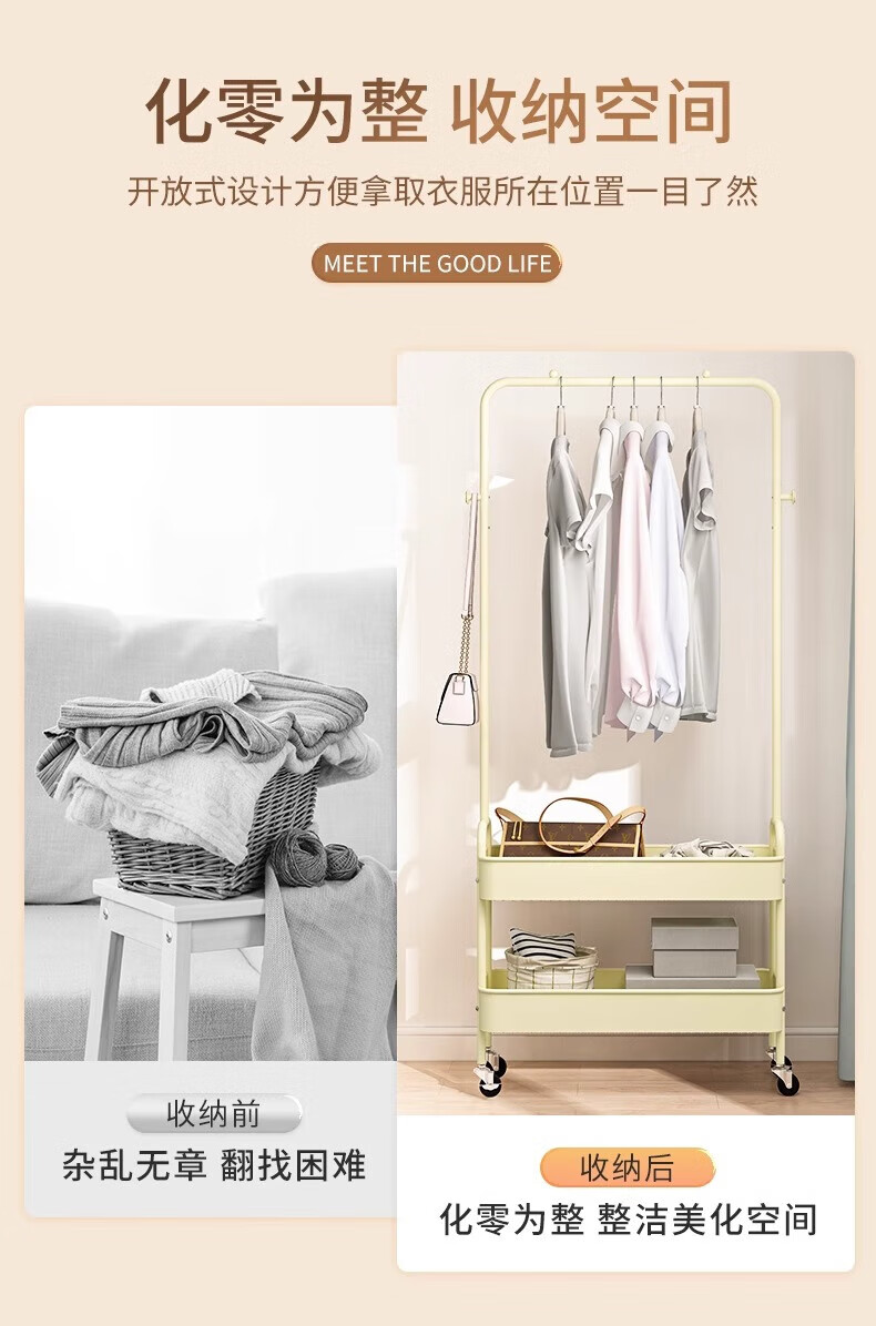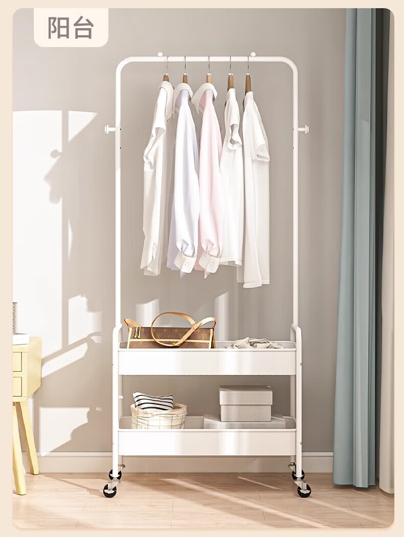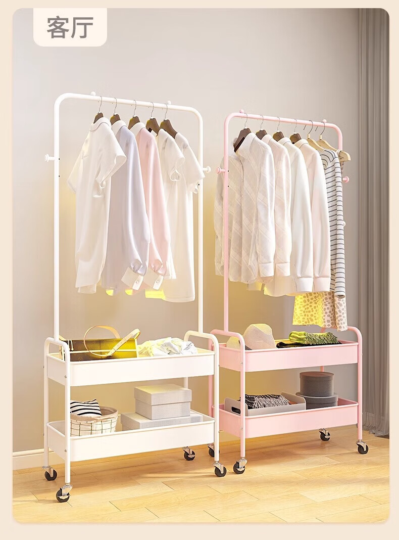 馨婺家衣帽架落地卧室挂衣可移动室内收纳置物架客厅多功能晾衣服挂衣架 白色-单层网框【塑料款】