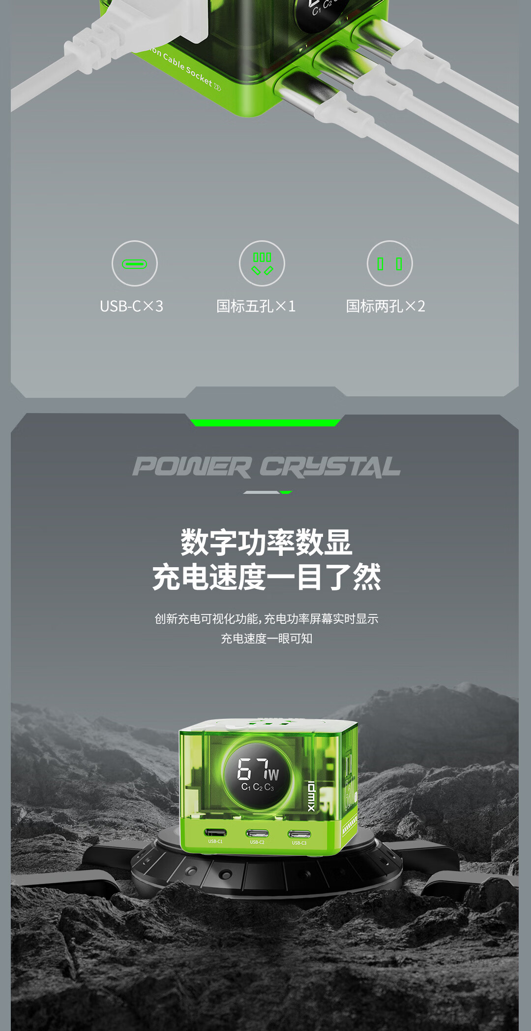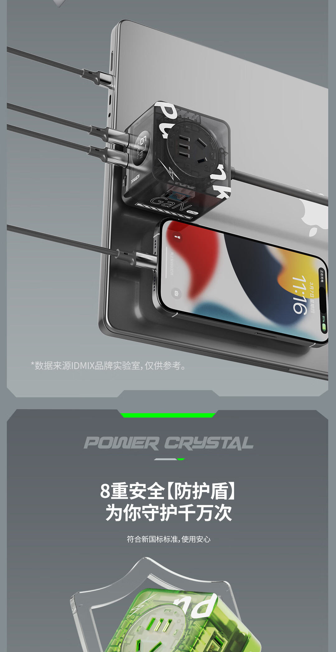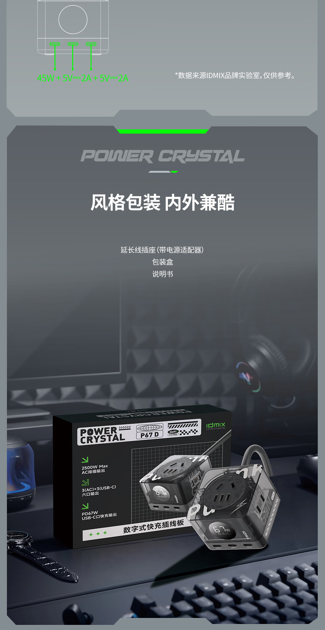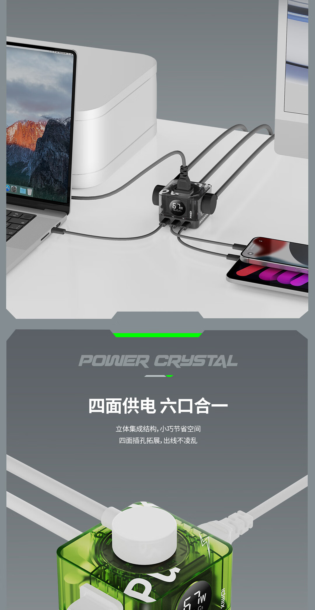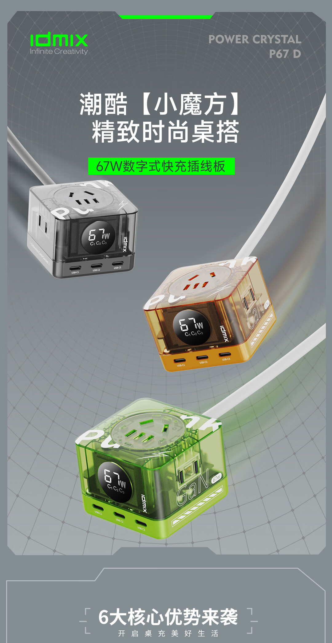 IDMIX67W氮化镓桌面充电器自带线 多口快充头排插 MacBook Pro联想笔记本平板手机通用 【透明绿】PD67W多口快充桌面充电器