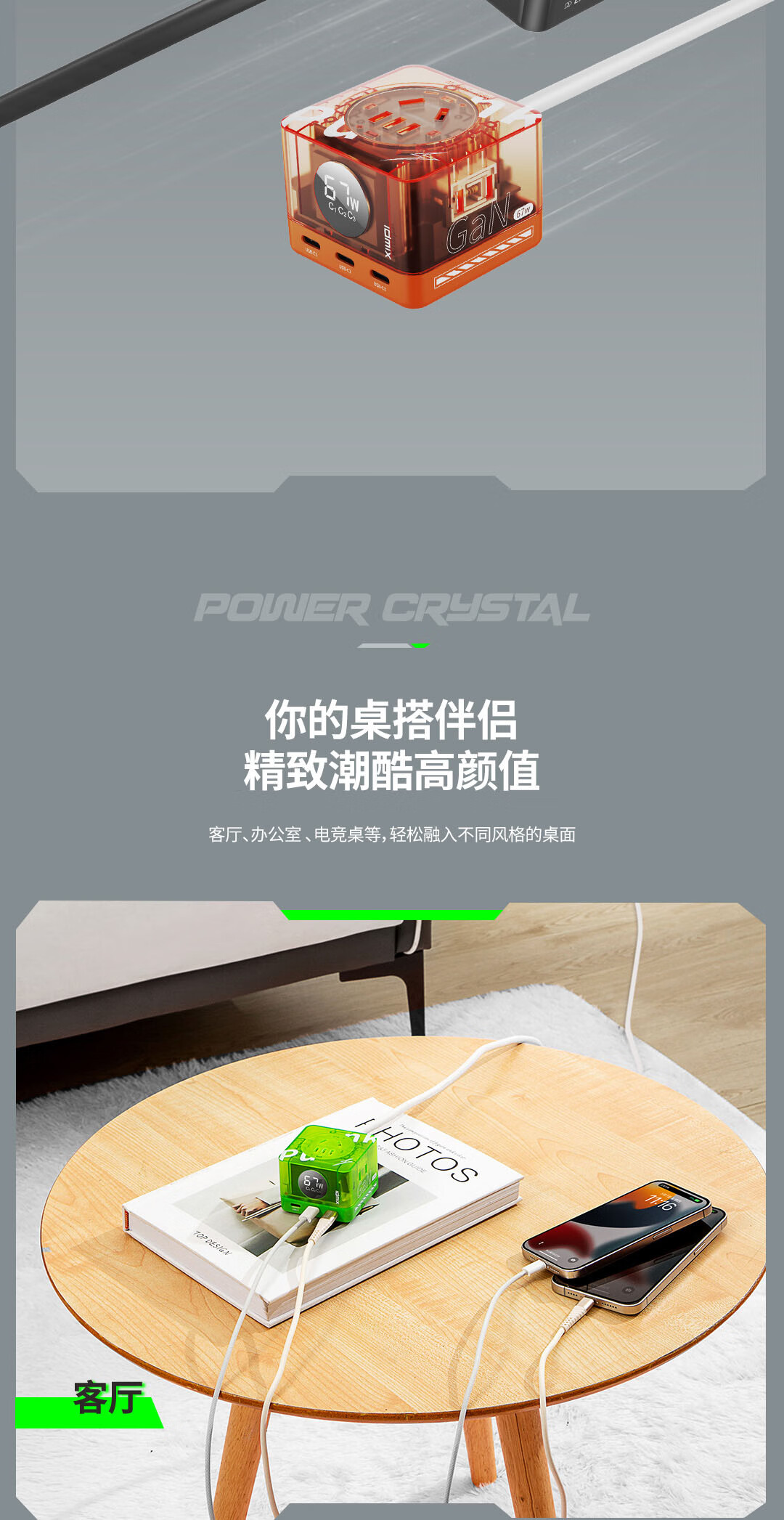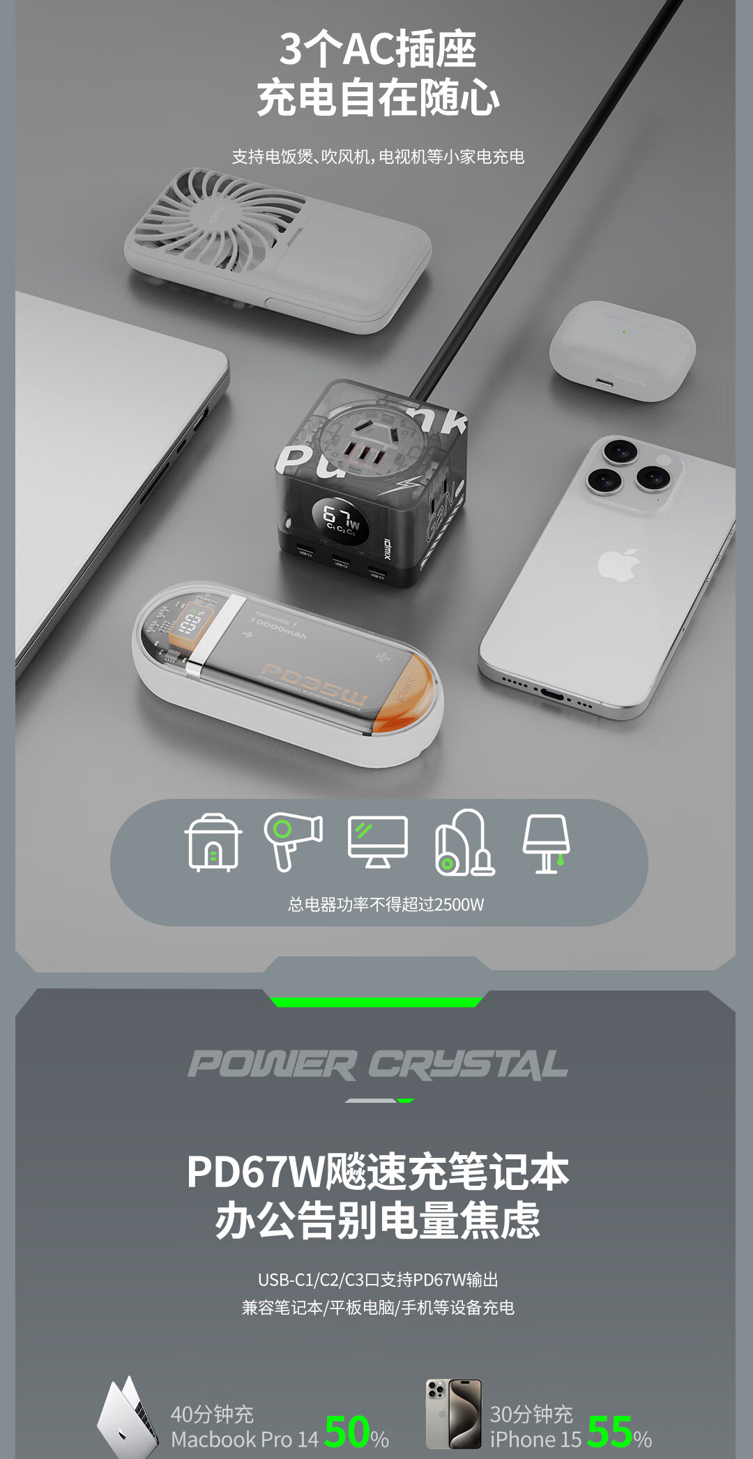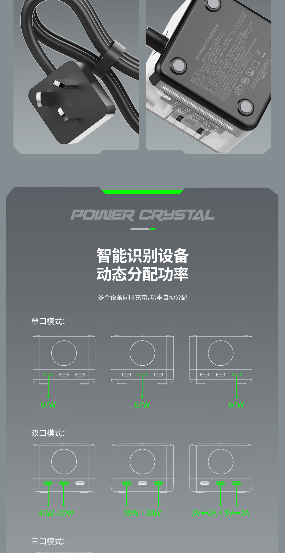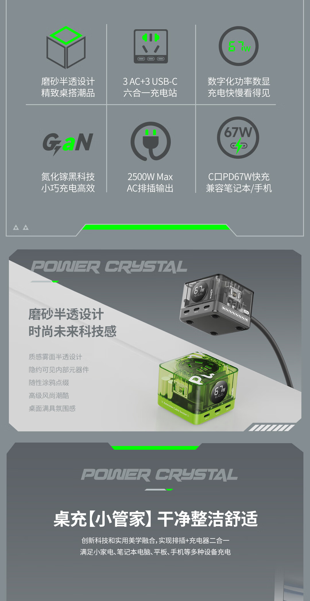 IDMIX67W氮化镓桌面充电器自带线 多口快充头排插 MacBook Pro联想笔记本平板手机通用 【透明绿】PD67W多口快充桌面充电器