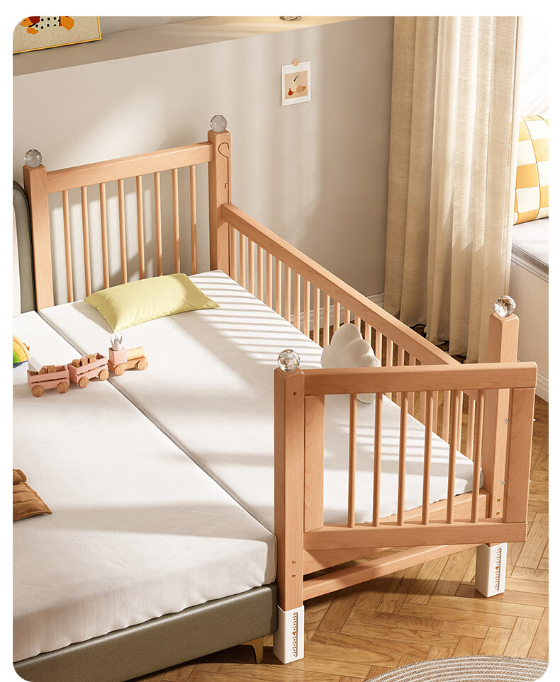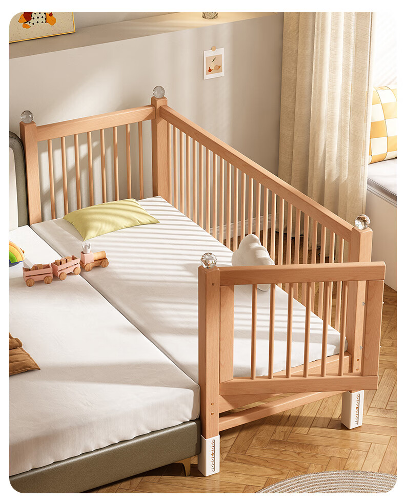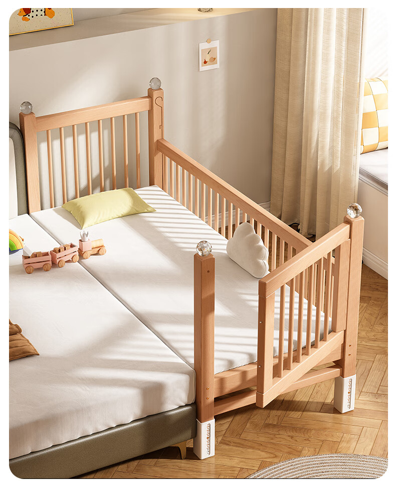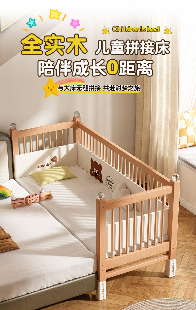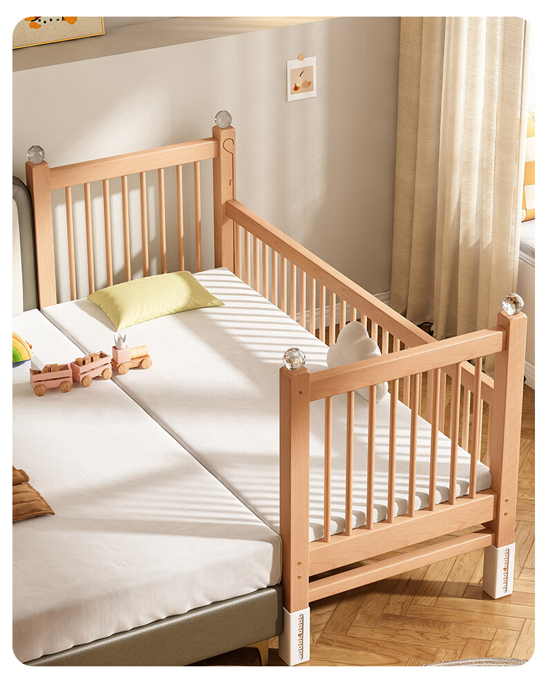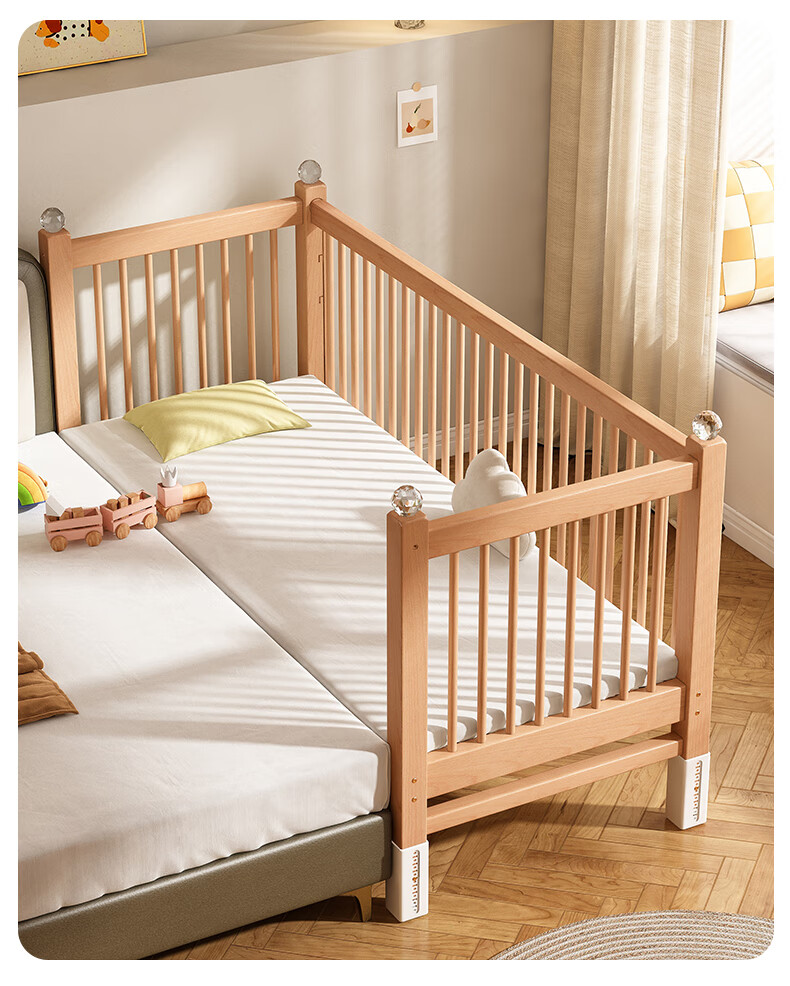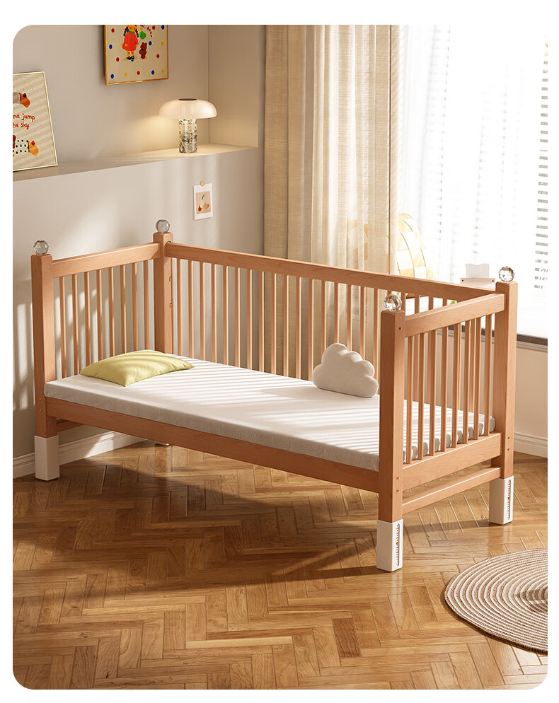 贝幸福 BAYLUCK可升降榉木拼接床实木儿童床婴儿床加宽拼接大床小孩床边床拼接床 侧升尾门款+10cm空气纤维垫+床围 200*100cm【可升降】