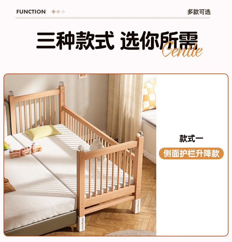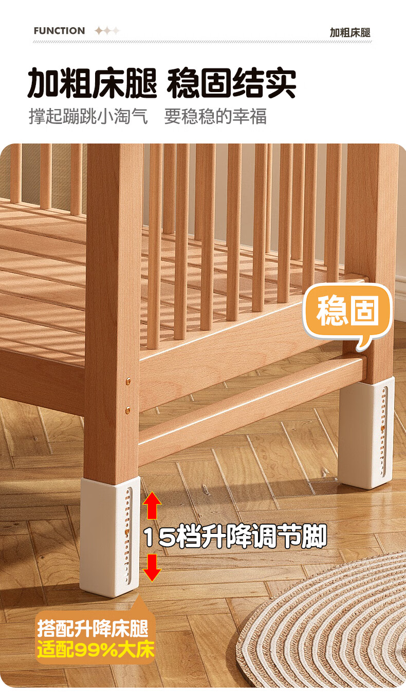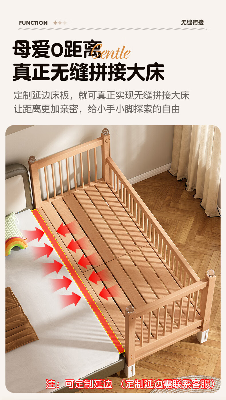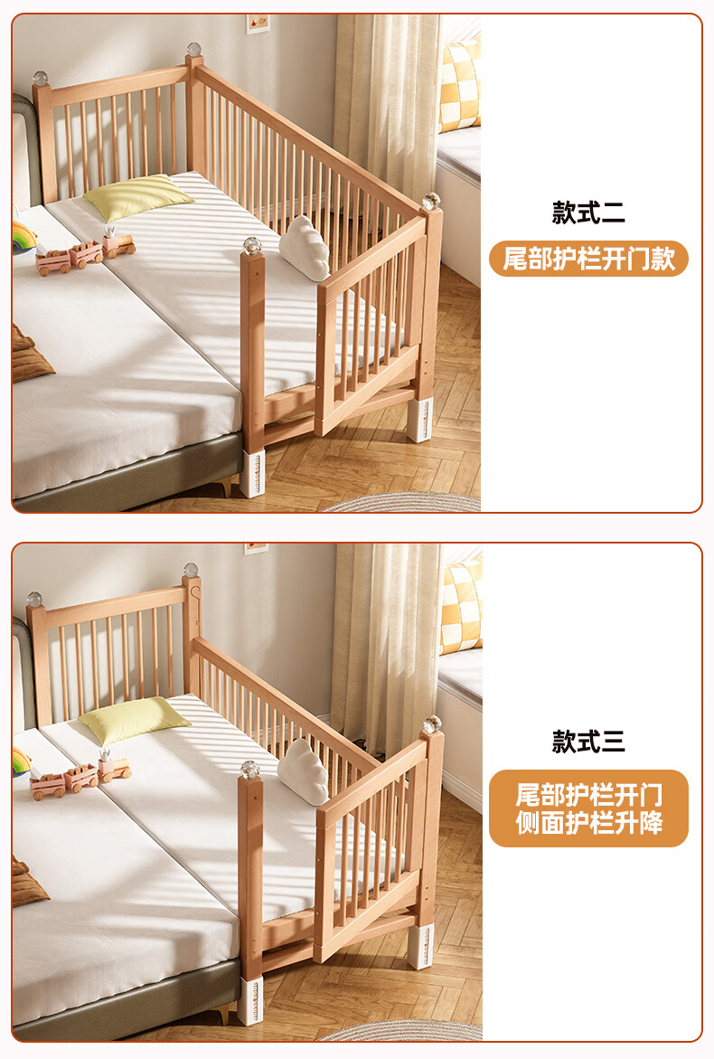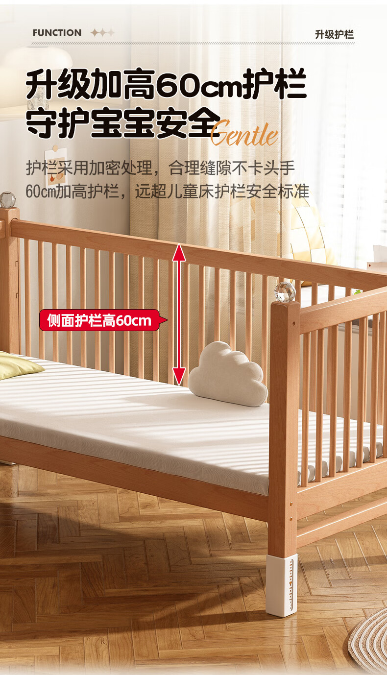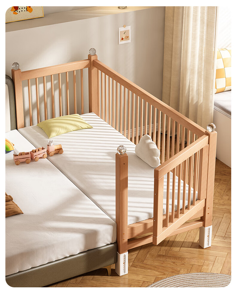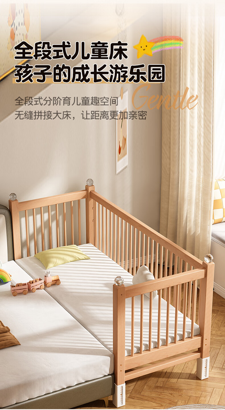 贝幸福 BAYLUCK可升降榉木拼接床实木儿童床婴儿床加宽拼接大床小孩床边床拼接床 侧升尾门款+10cm空气纤维垫+床围 200*100cm【可升降】