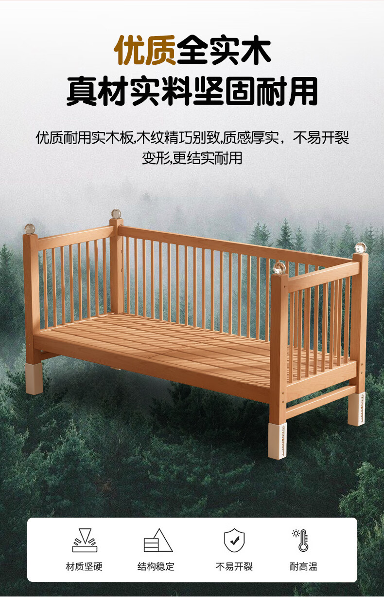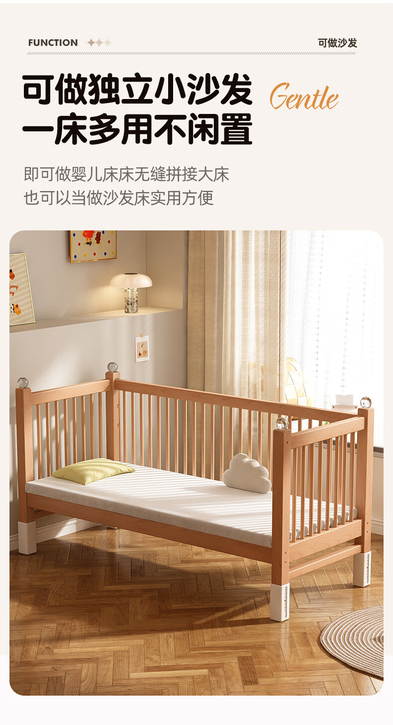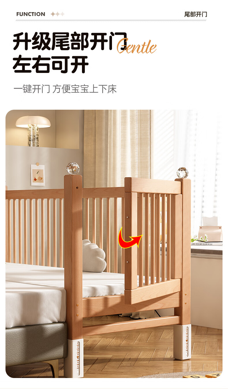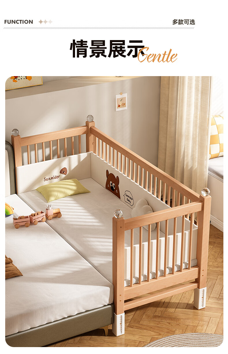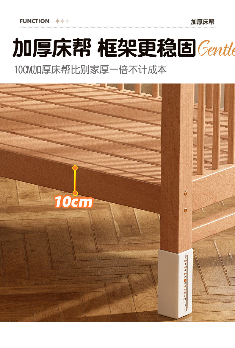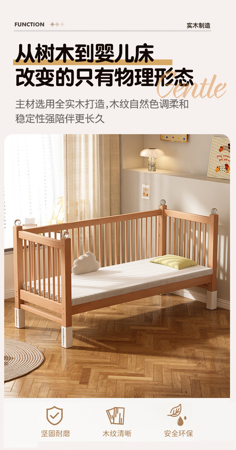 贝幸福 BAYLUCK可升降榉木拼接床实木儿童床婴儿床加宽拼接大床小孩床边床拼接床 侧升尾门款+10cm空气纤维垫+床围 200*100cm【可升降】