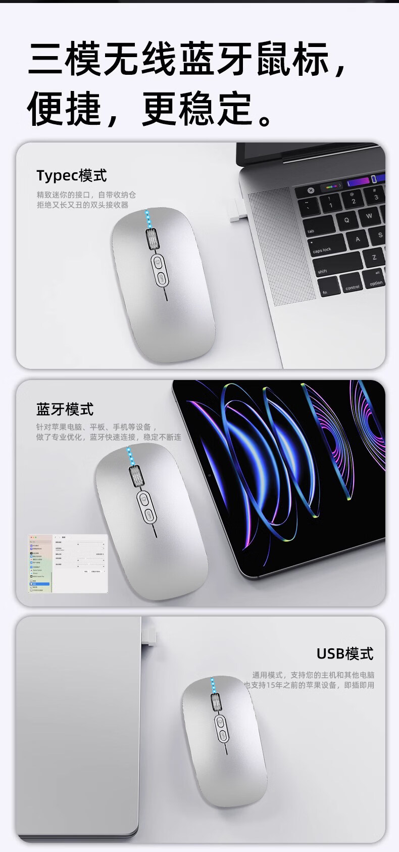 适用2025款苹果电脑笔记本MacBook Pro/Air M5M4M3M2无线蓝牙鼠标type-c接口办公静音充电iPad平板 【太空灰】蓝牙+USB+Typec接口