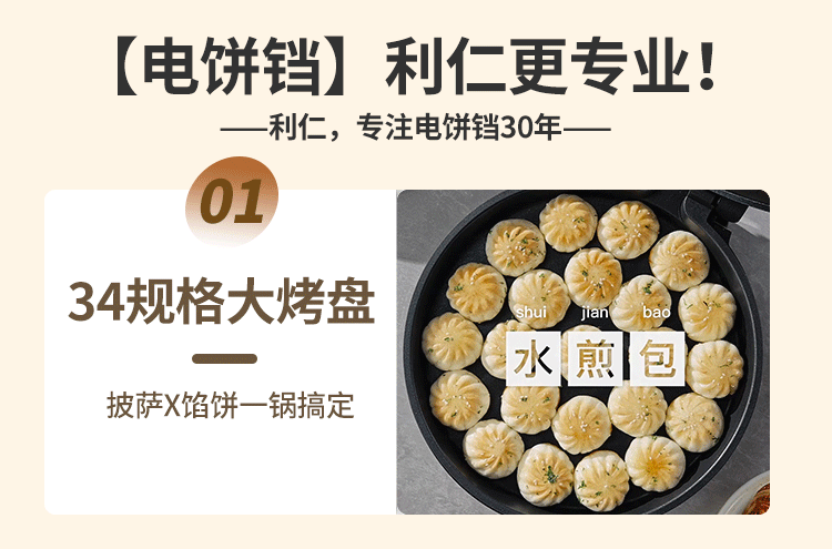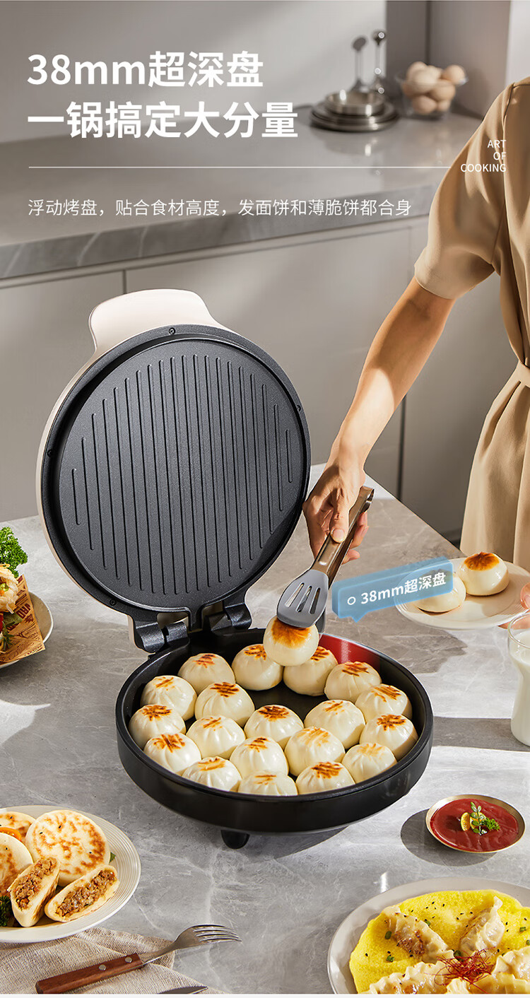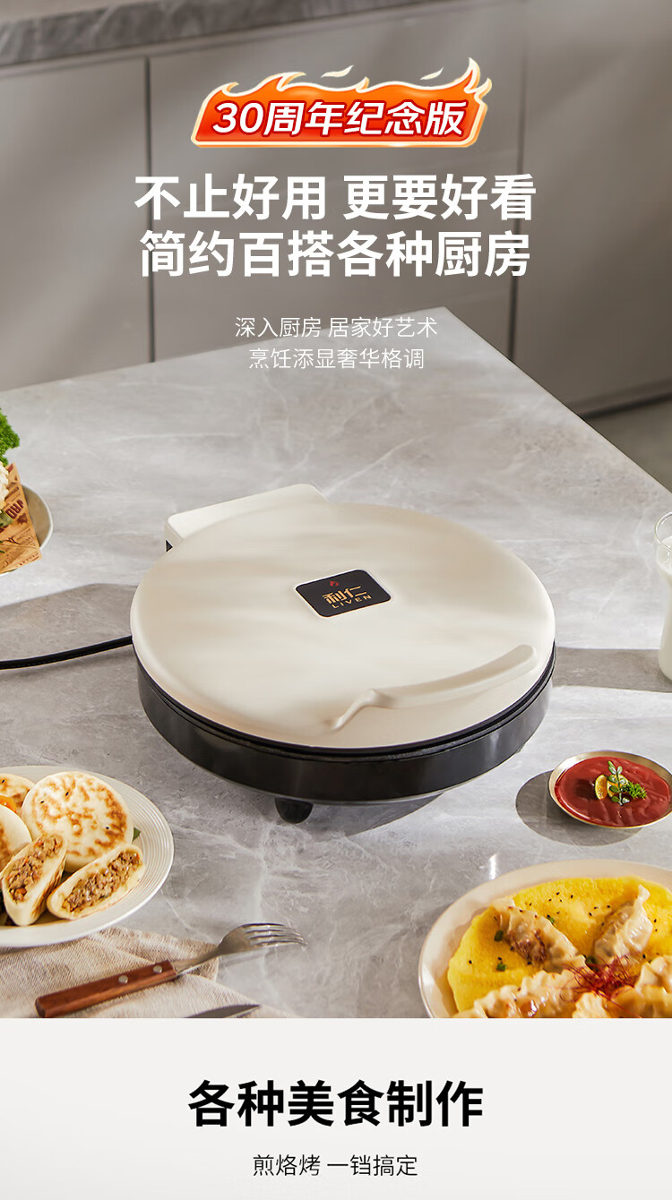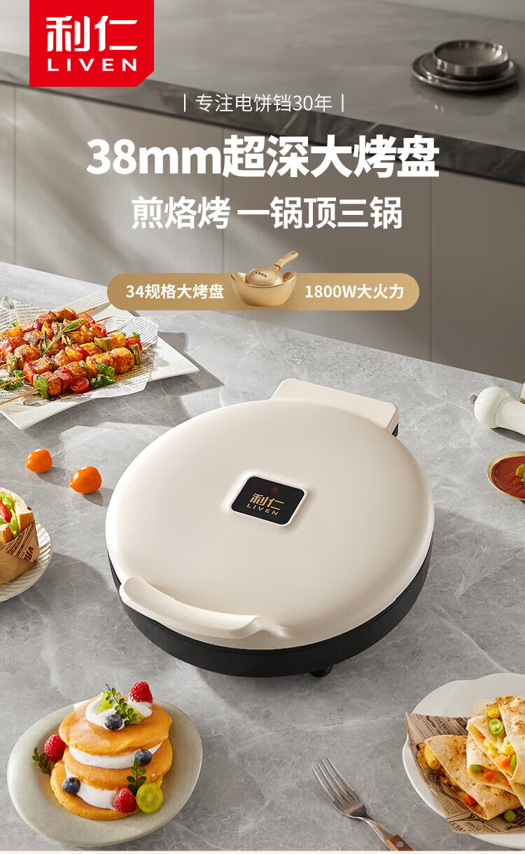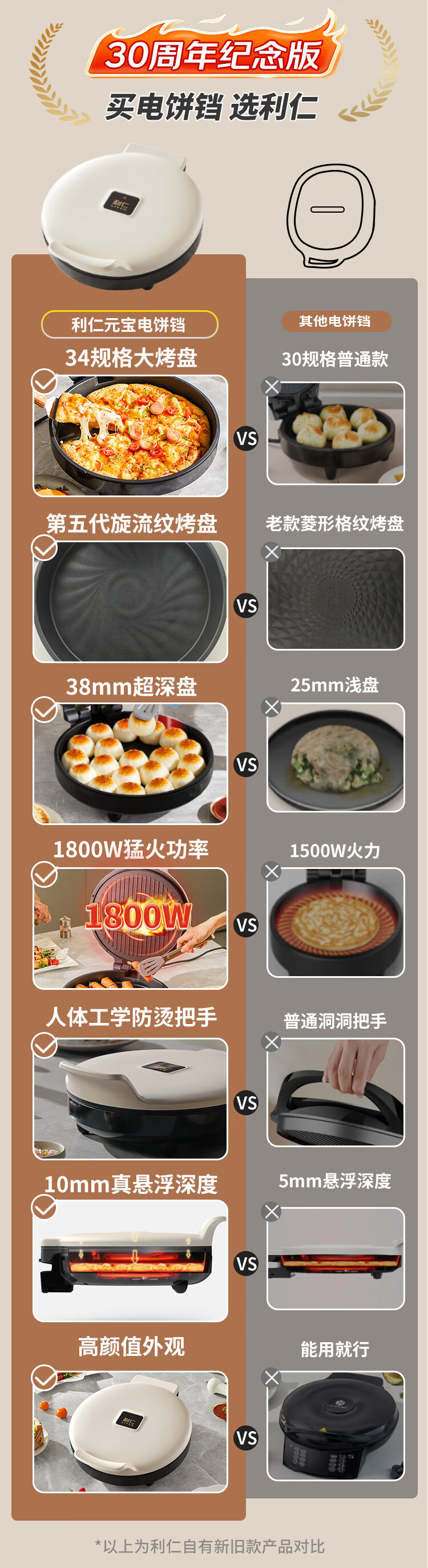 利仁新款元宝电饼铛家庭用加大加深38mm深烤盘1800W双面加热电饼档烙饼锅煎饼锅烤肉锅早餐机LR-J3436