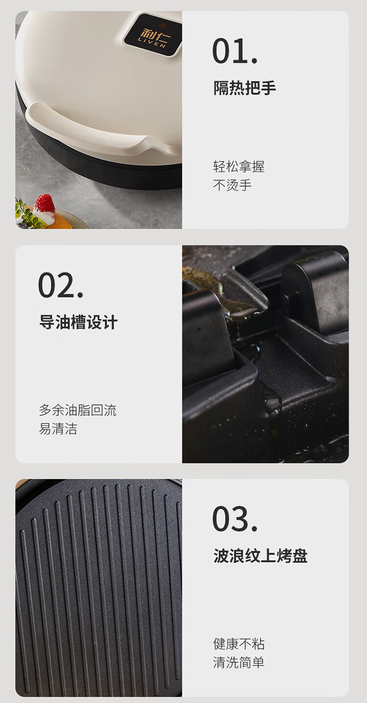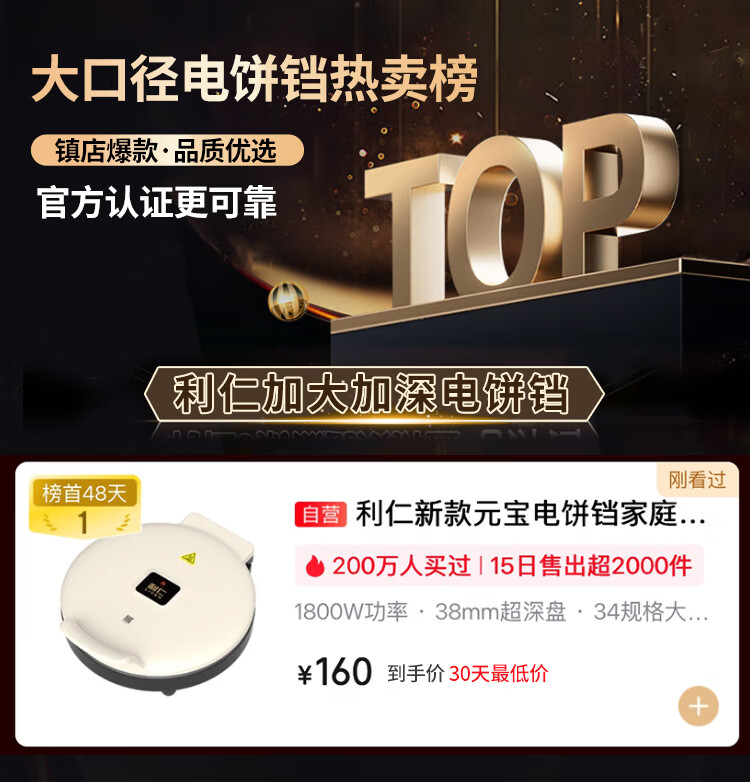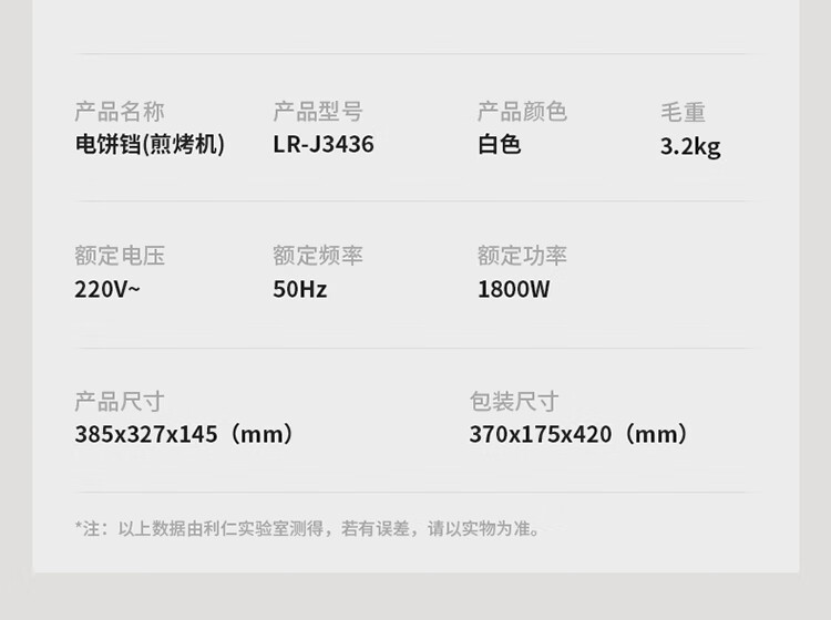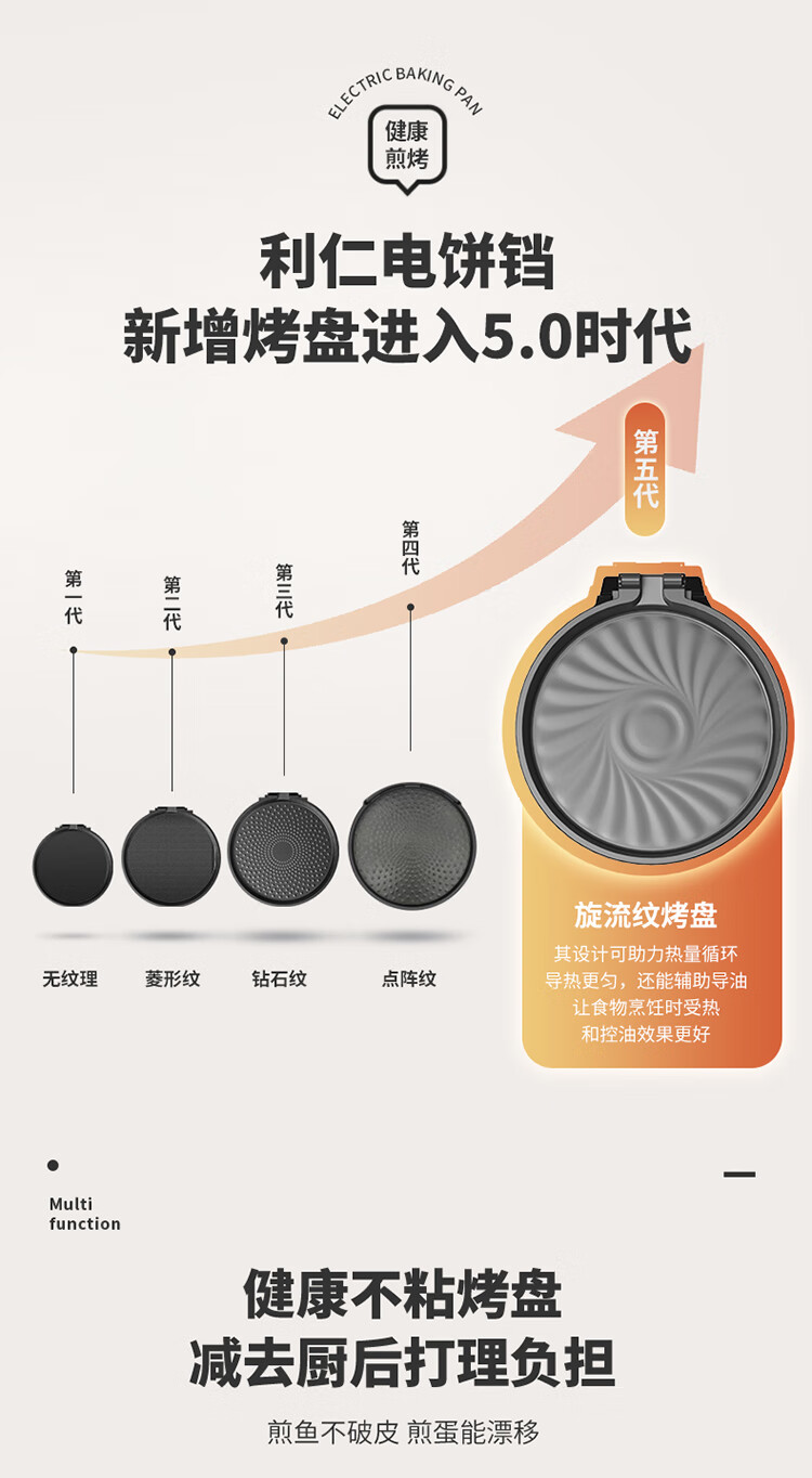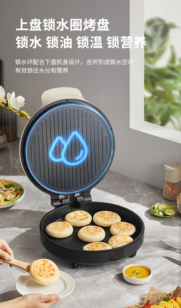 利仁新款元宝电饼铛家庭用加大加深38mm深烤盘1800W双面加热电饼档烙饼锅煎饼锅烤肉锅早餐机LR-J3436