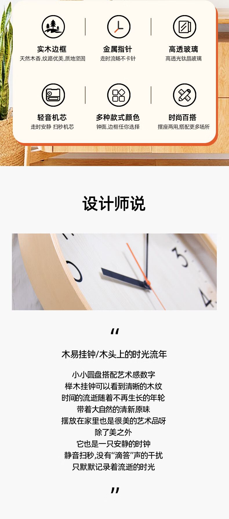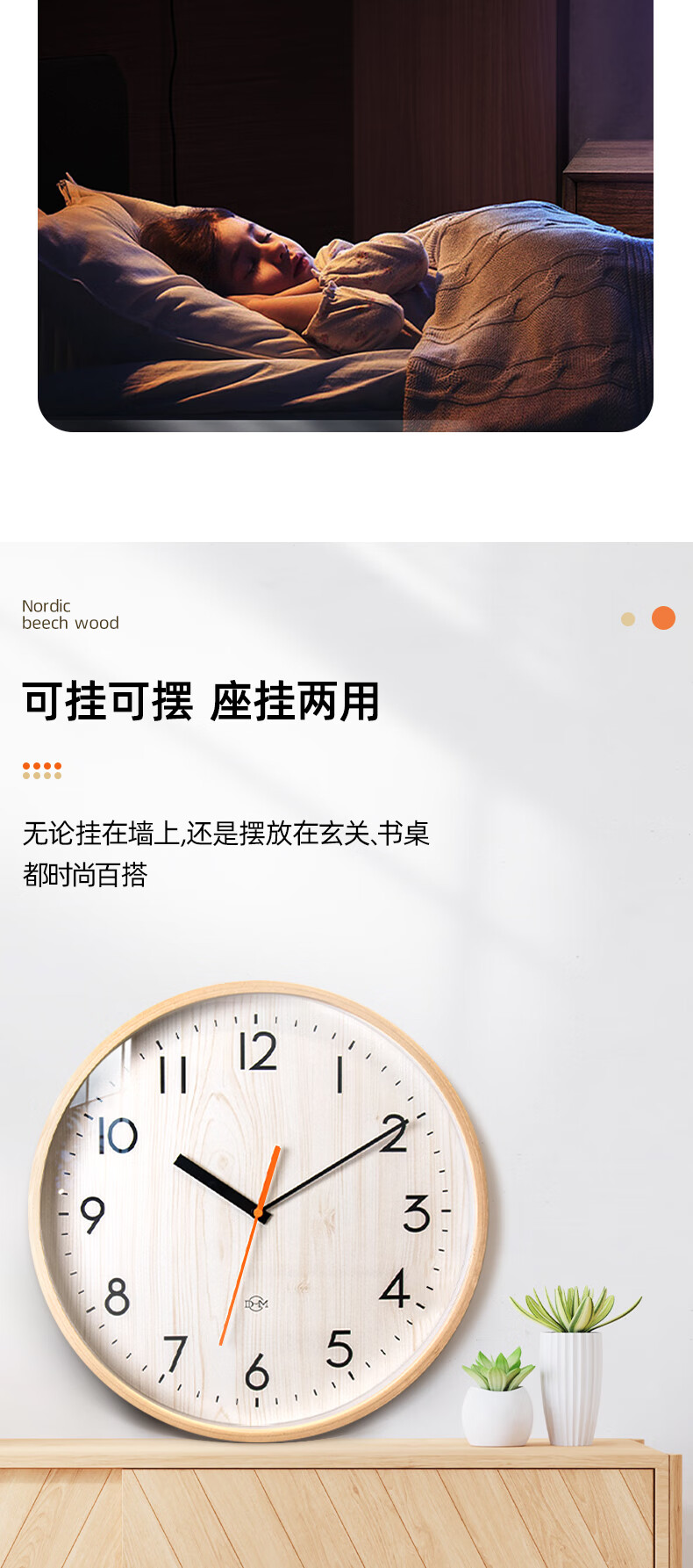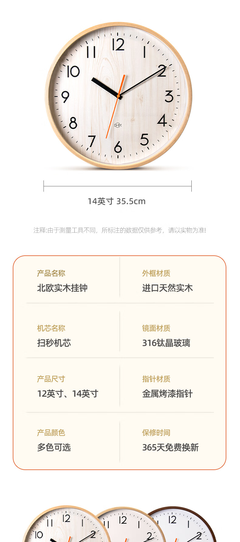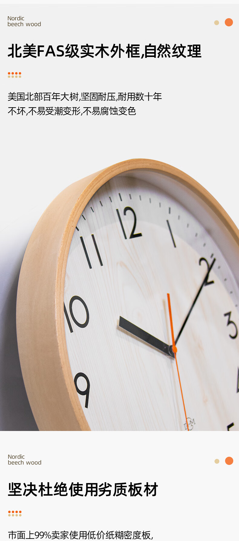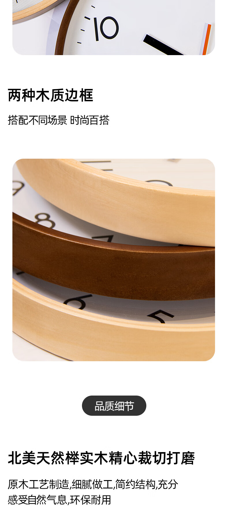 Timess挂钟客厅钟表2025新款原木时钟表挂墙免打孔简约石英挂表36cm
