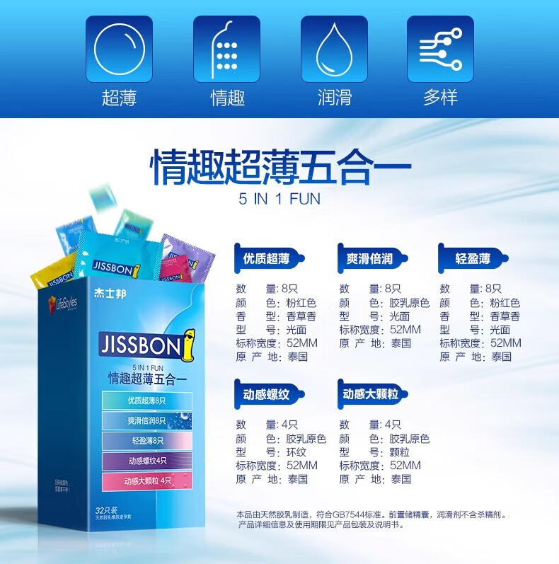 杰士邦(JISSBON)避孕套情趣进口男用套套润滑安全套螺纹颗粒计生用品 薄五合一32只*1盒【隐私发货 防伪可查】