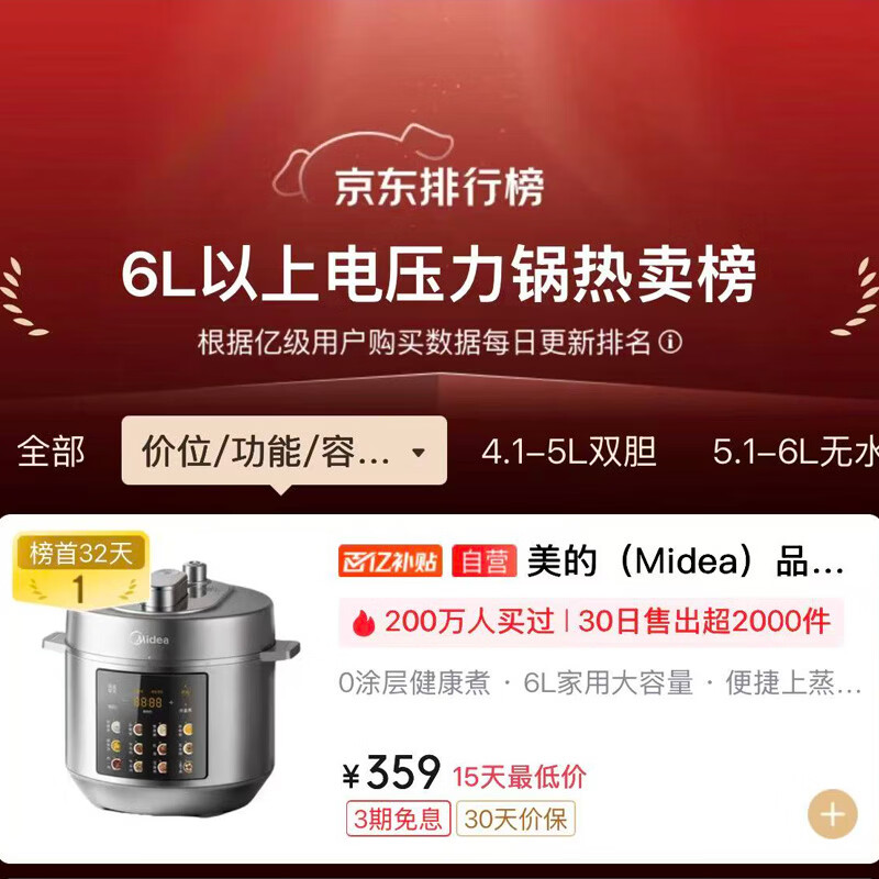 美的(Midea)【京东自营】0涂层 健康煮 6L大容量 全自动家用电压力锅高压锅煮小米饭锅MY-E6010G适用6-8人