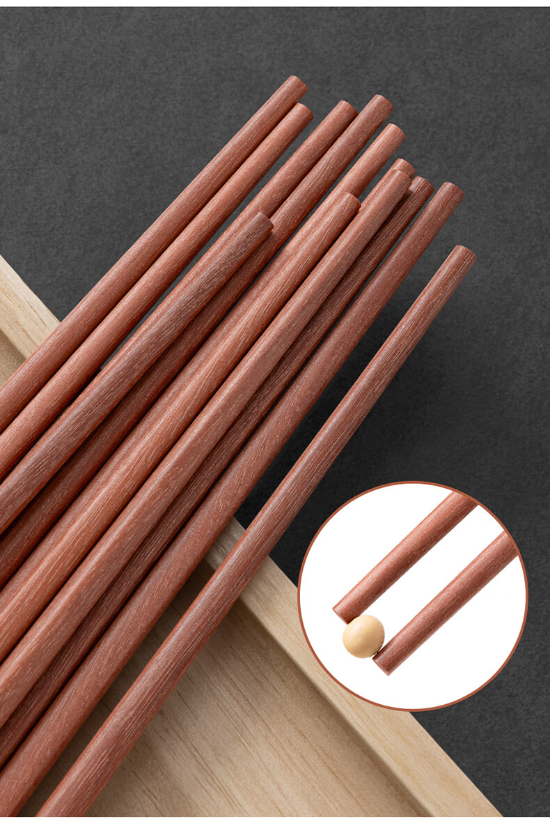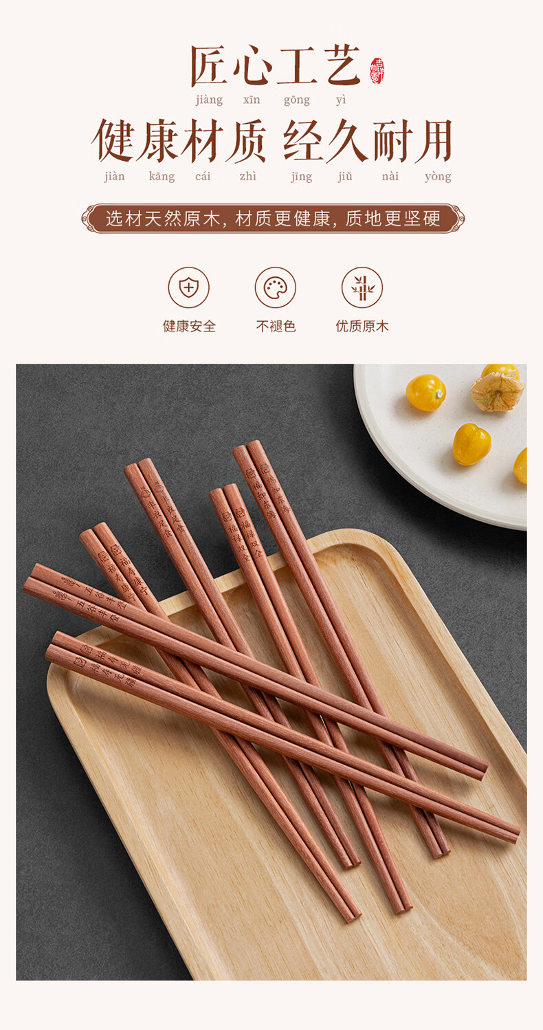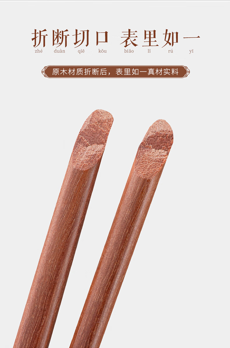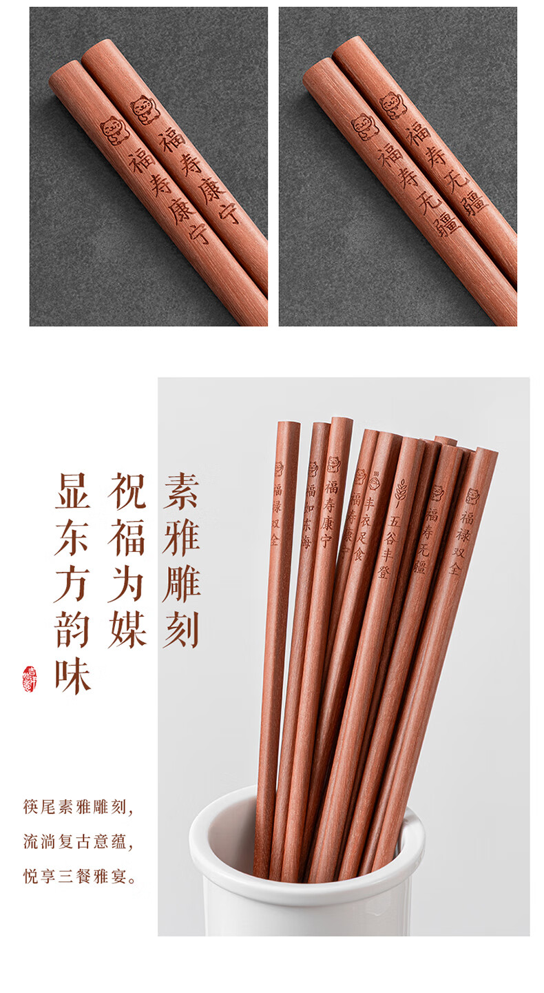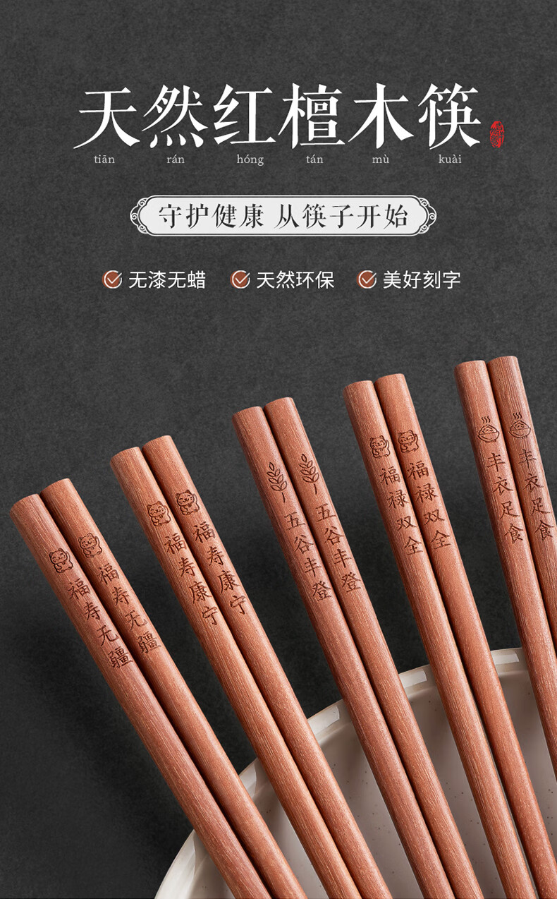 千年恋木家用高档实木质红檀木筷防滑耐高温家庭餐具无漆无蜡餐具 红木平切筷刻福禄双全【10双】