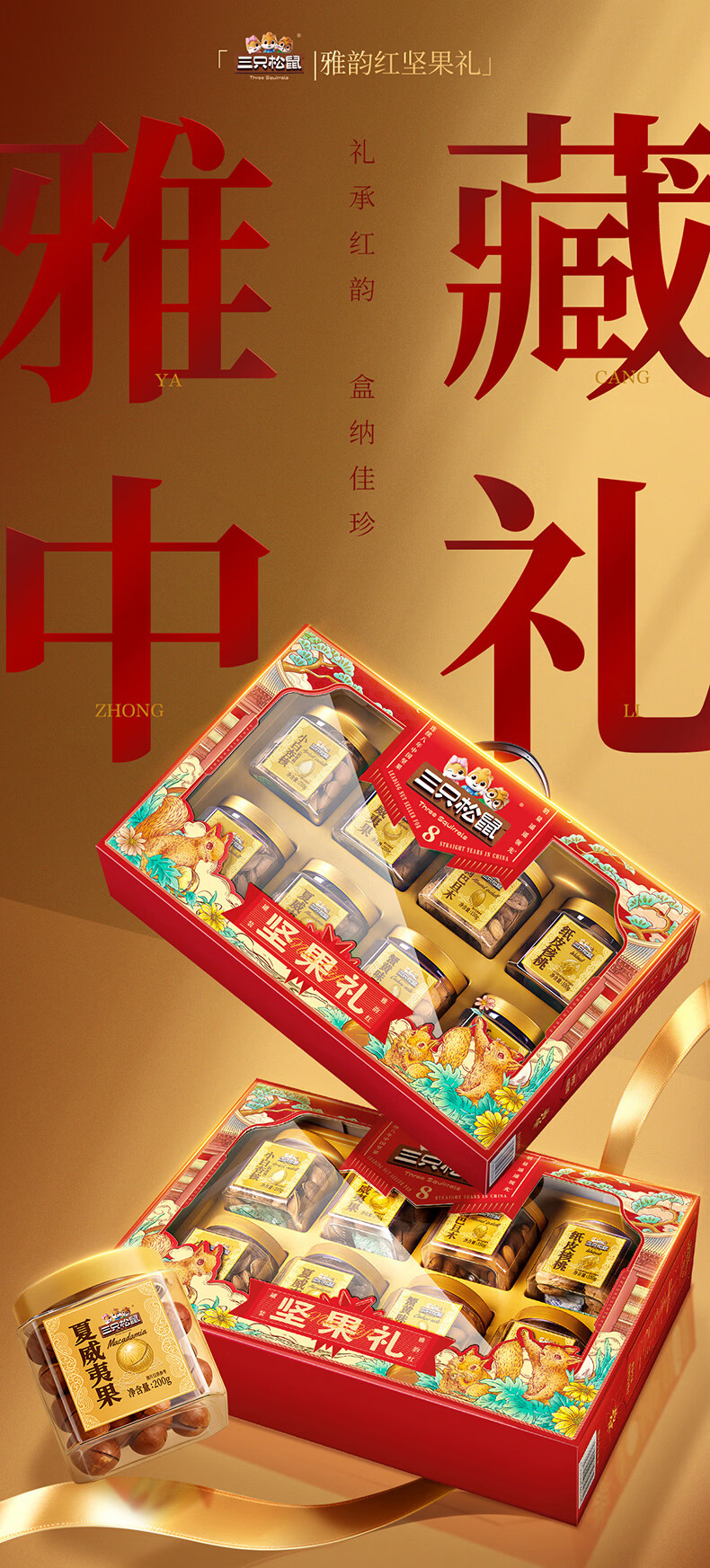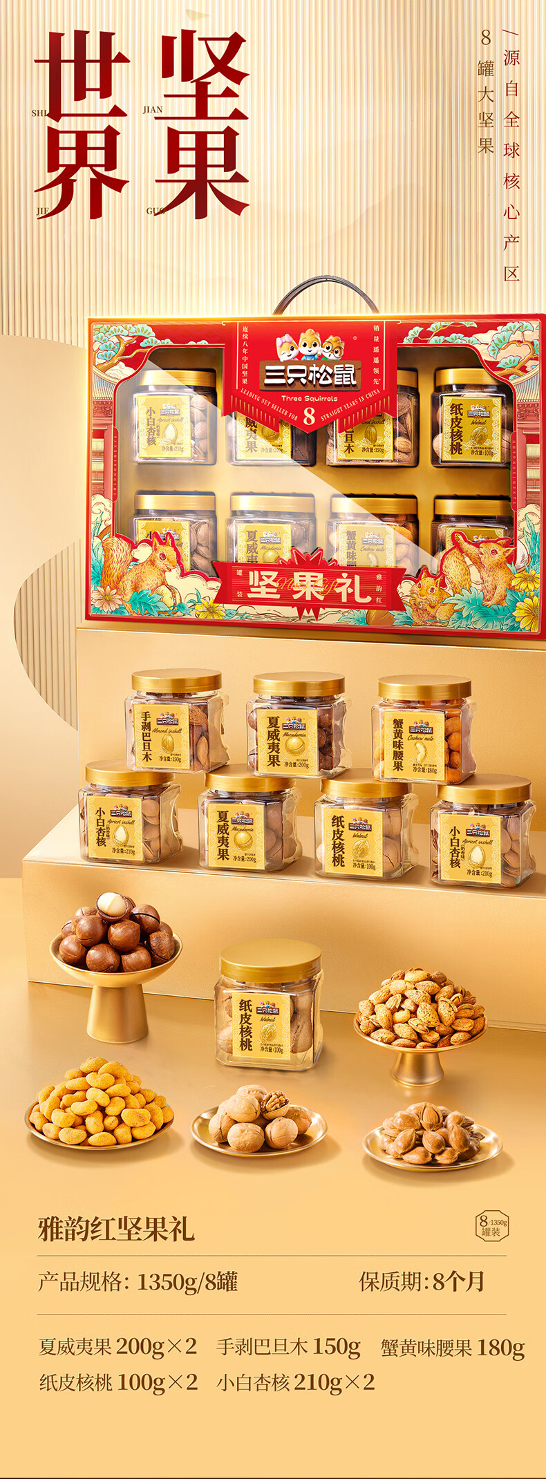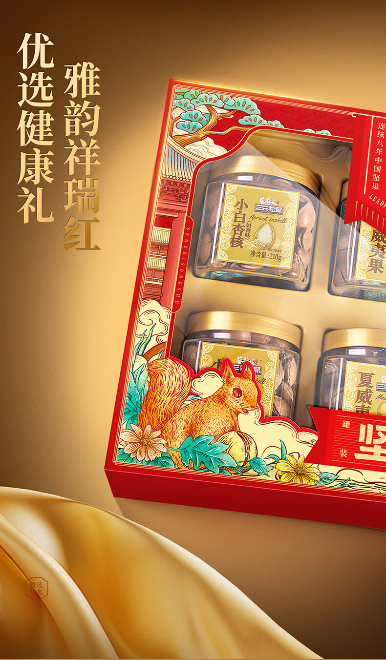 三只松鼠罐装坚果礼盒零食年货节日送礼送长辈坚果干果年货礼盒团购 【8罐坚果】雅韵红罐装坚果礼1350g