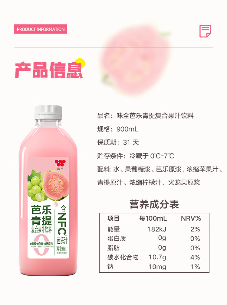 味全芭乐青提稀释果汁饮料含NFC芭乐汁900ml*1瓶聚会聚餐冷藏饮料