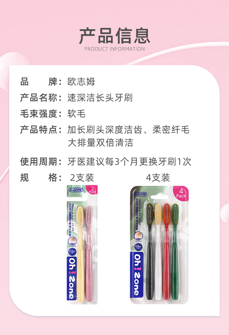 欧志姆(O-ZONE)软毛牙刷速深洁长头牙刷2支舒净护龈双倍洁净温和清洁不伤牙龈