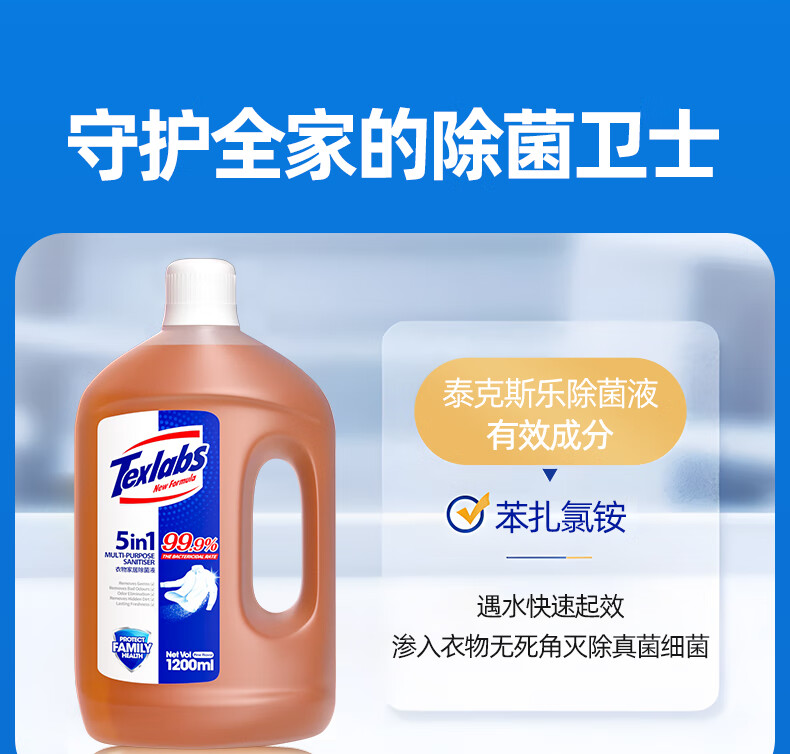 泰克斯乐(Texlabs)衣物除菌液 衣物洗衣机除菌消毒剂 家居地板玩具除菌液 衣物除菌液2260ml