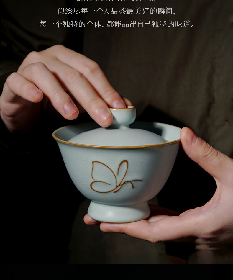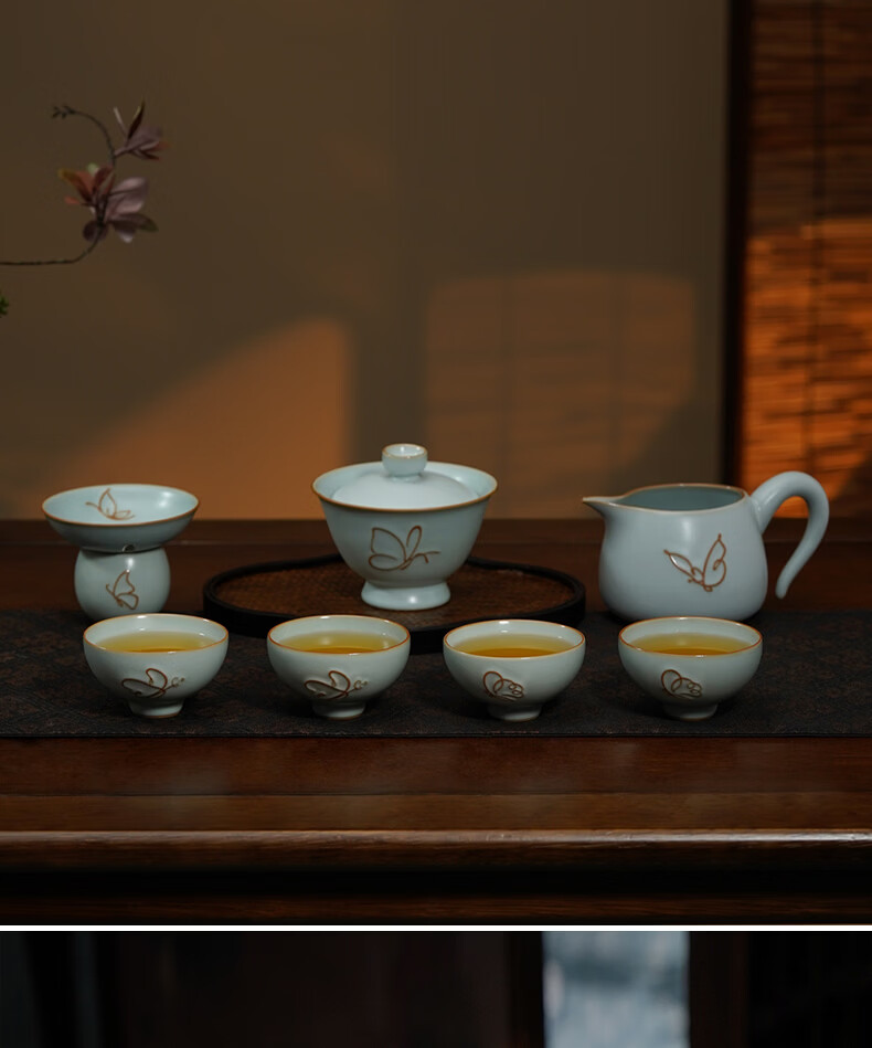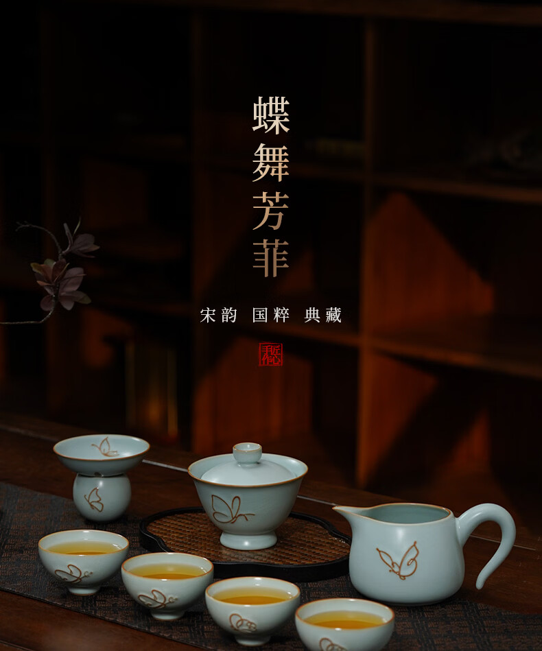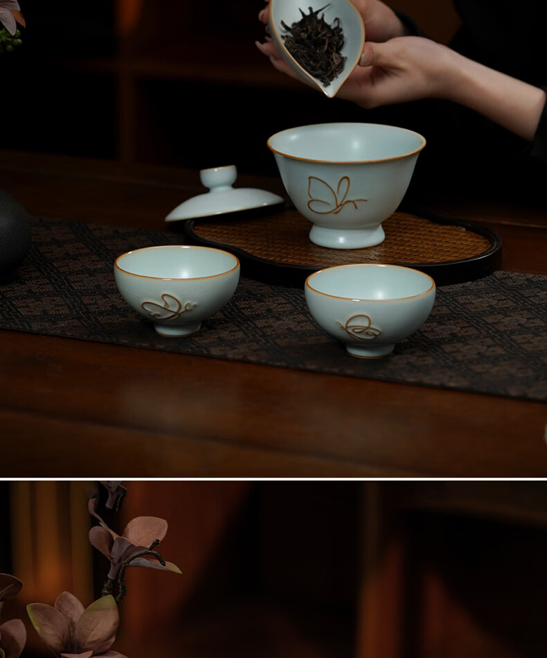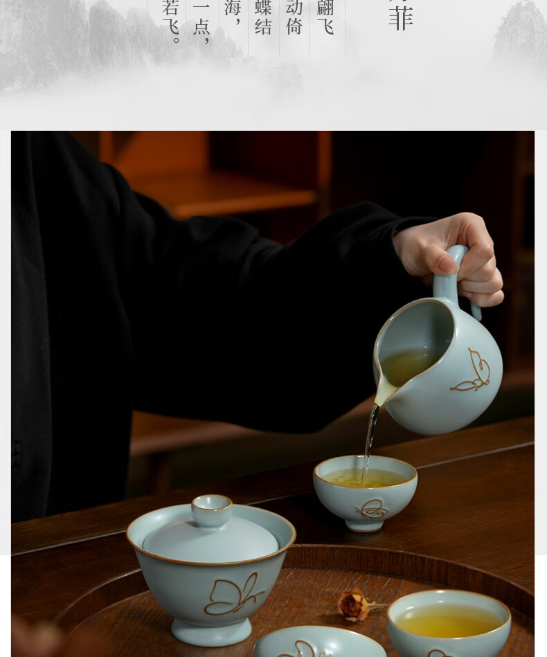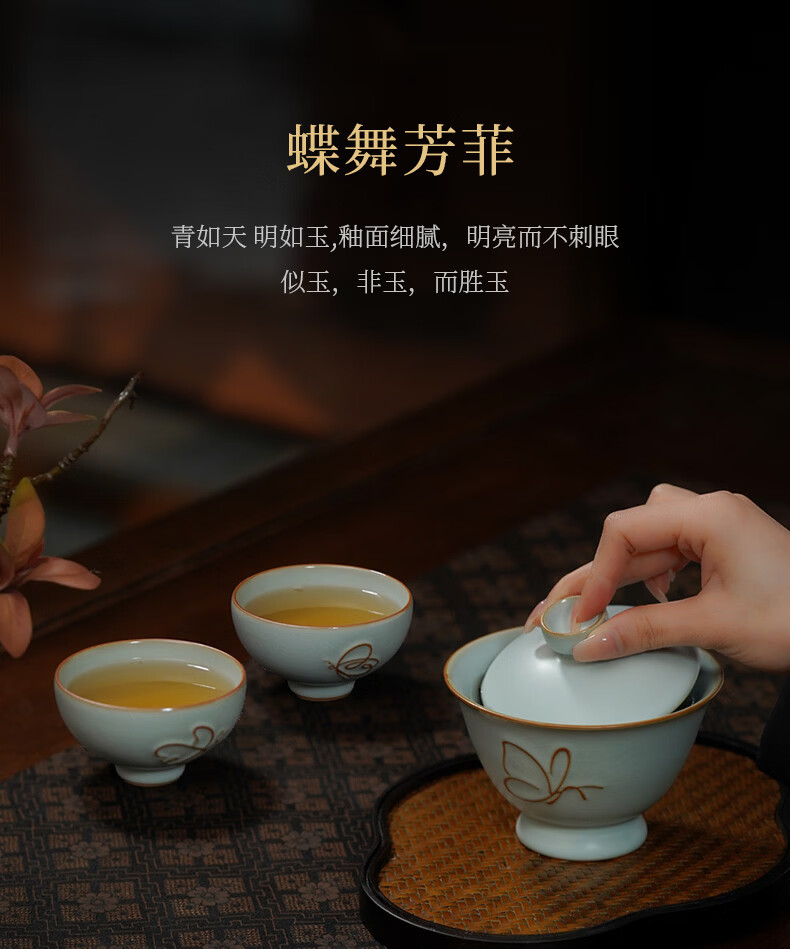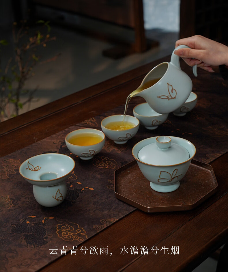 青澹墨雅青澹汝窑茶具套装礼品冰裂釉汝瓷整套茶杯茶壶礼盒装陶瓷盖碗茶具 青澹蝶舞芳菲7件套