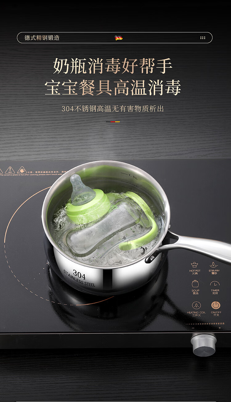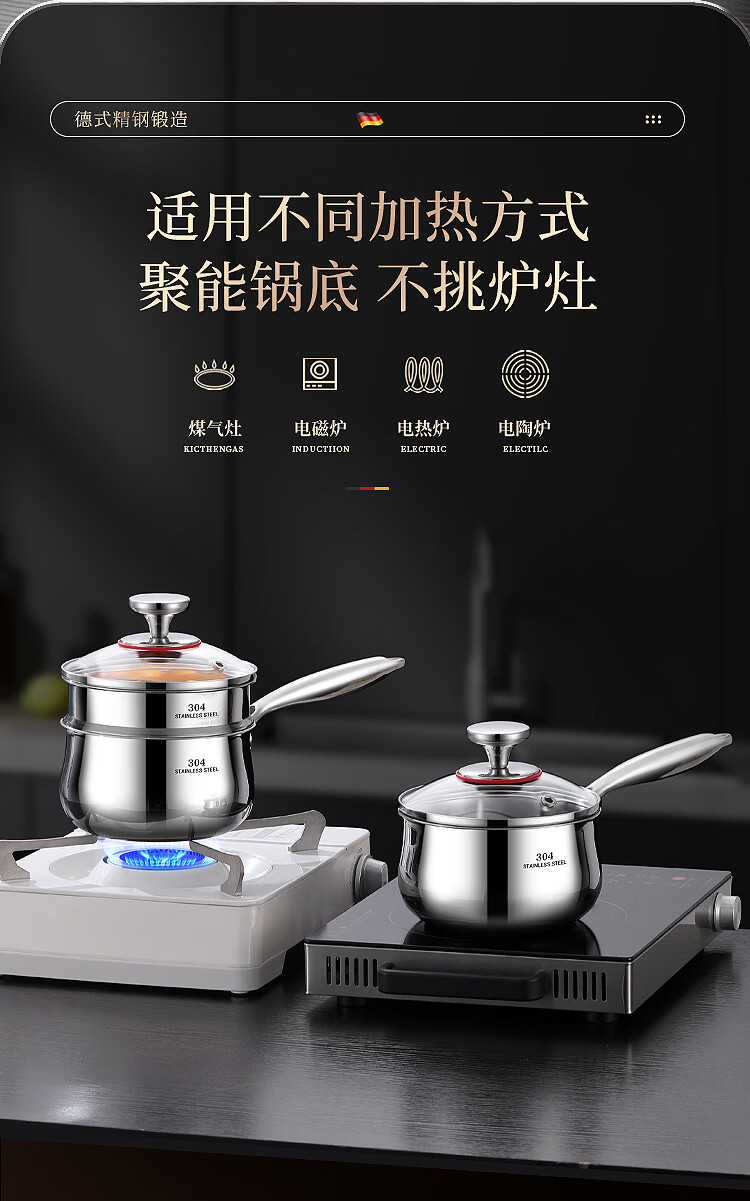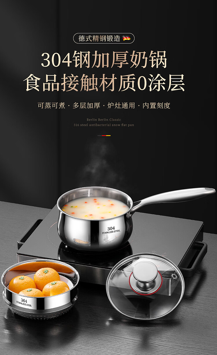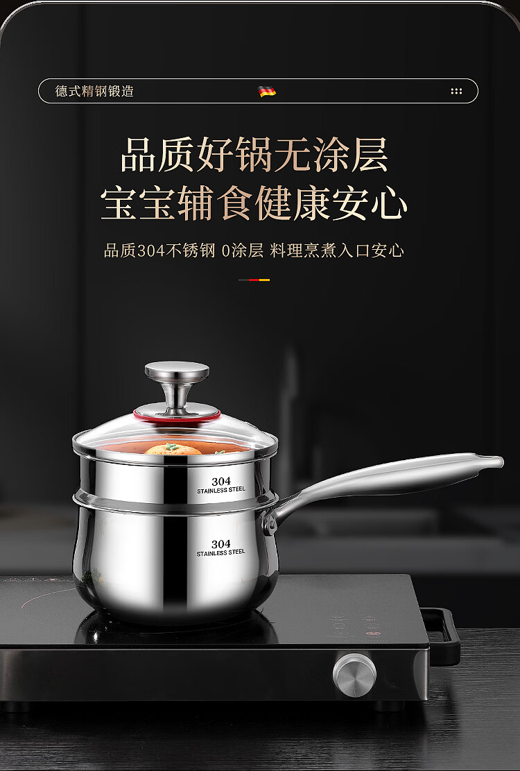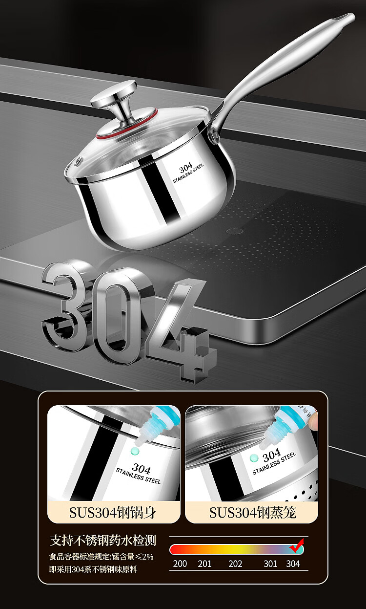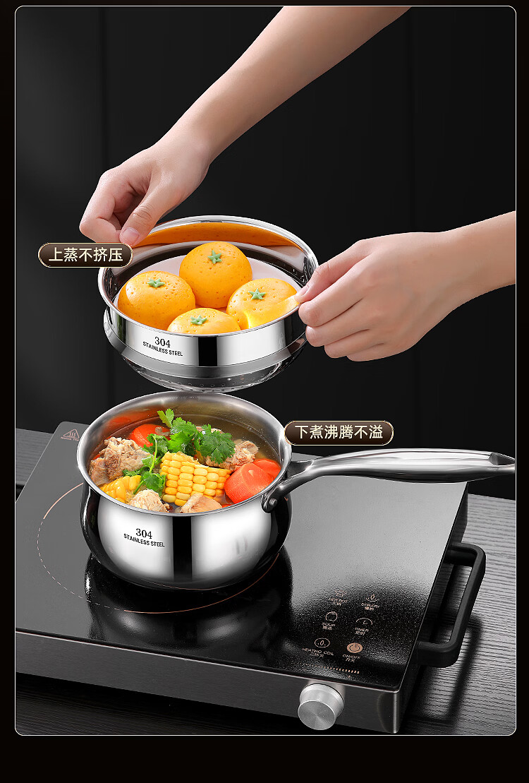 思美雅奶锅304不锈钢小奶锅不粘锅无涂层食品级婴儿辅食锅蒸煮一体+蒸笼 【母婴级奶锅+蒸格】 双层 18cm