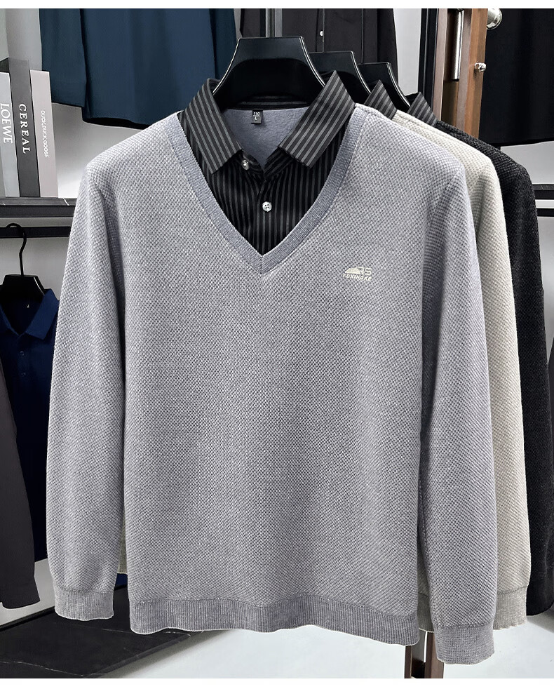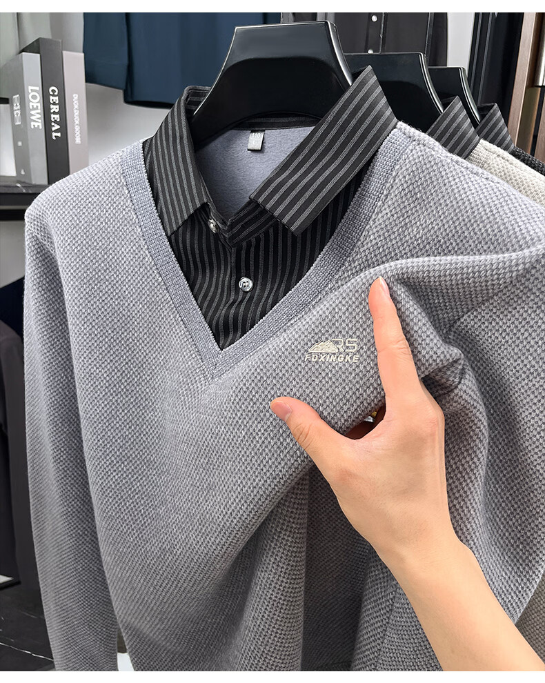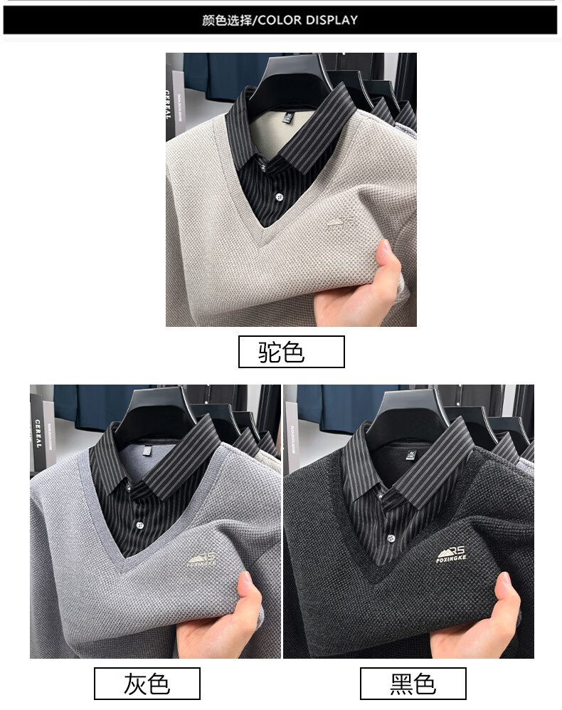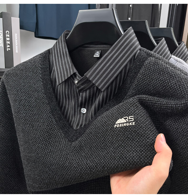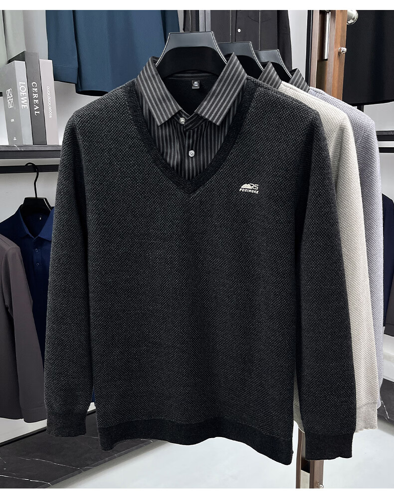 罗蒙(ROMON)仿雪貂绒假两件毛衣男2025冬季新款保暖加绒男士衬衫领针织打底衫 黑色 M (建议体重100-120斤)