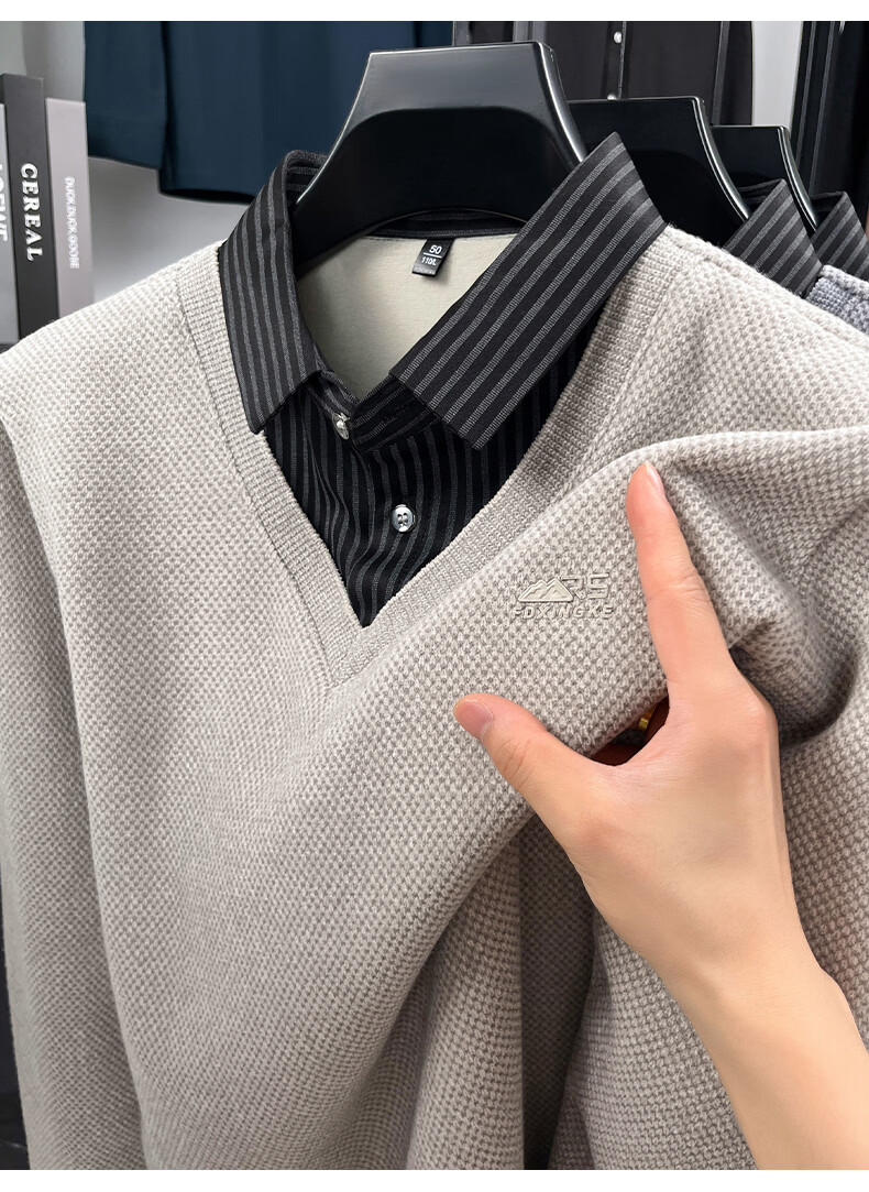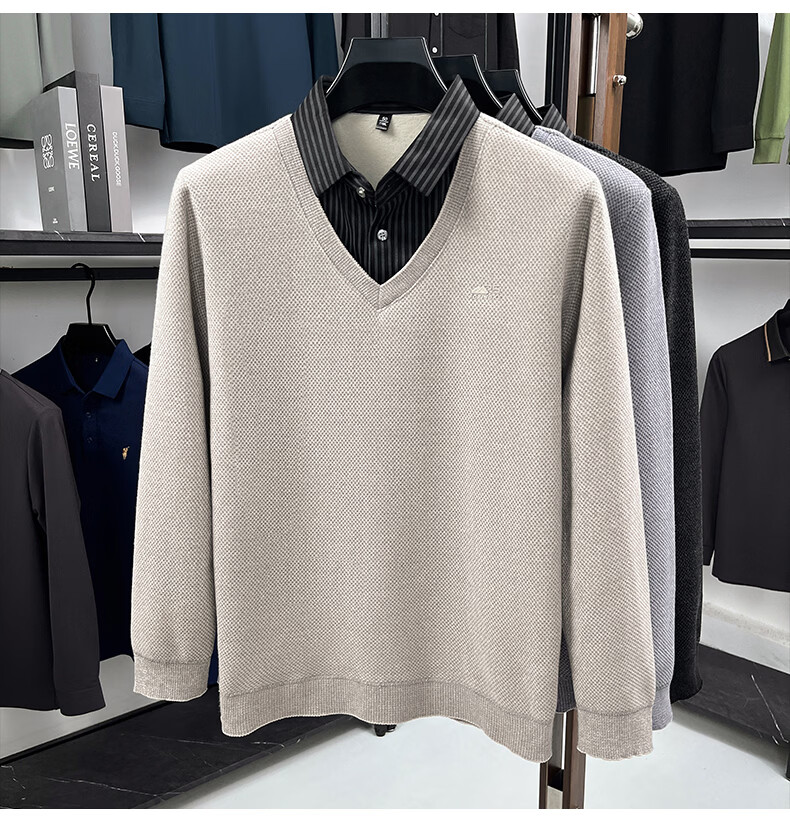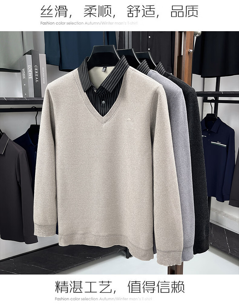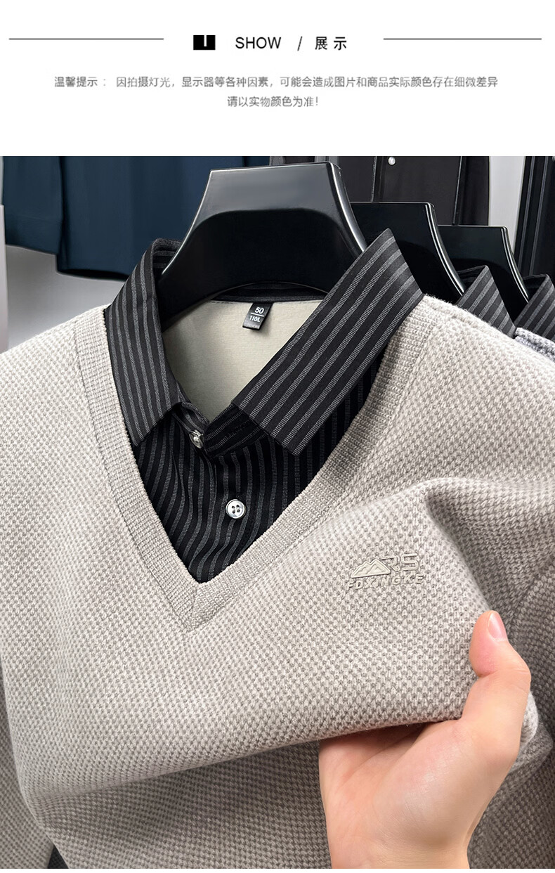 罗蒙(ROMON)仿雪貂绒假两件毛衣男2025冬季新款保暖加绒男士衬衫领针织打底衫 黑色 M (建议体重100-120斤)