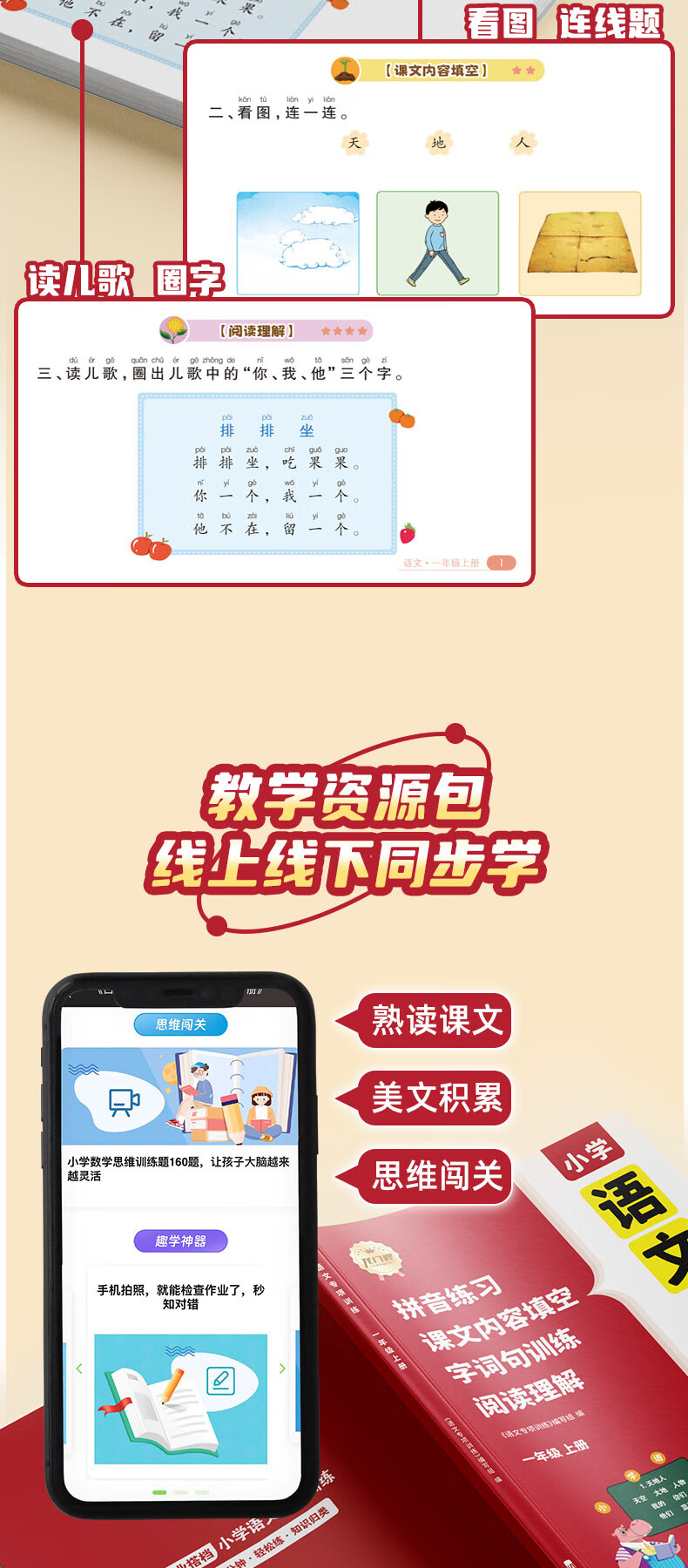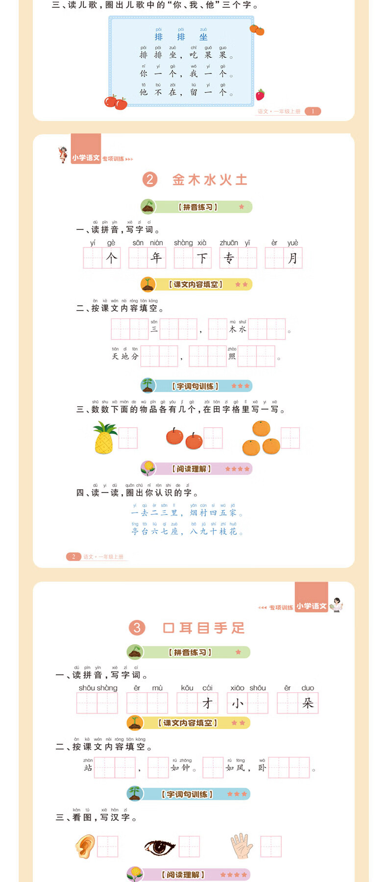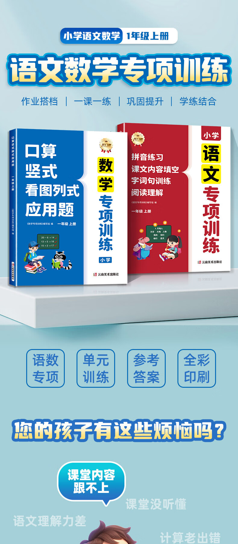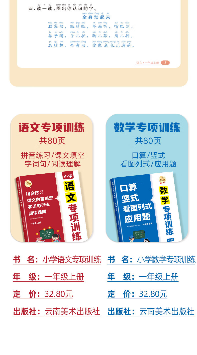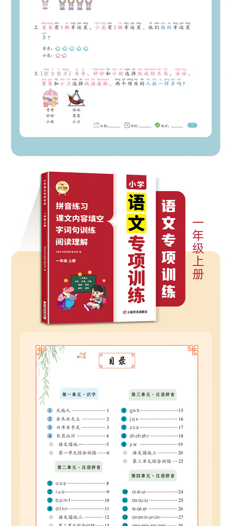2025新版语文数学专项训练一二年级上册人教版口算竖式看图列式应用题四合一同步训练习册看拼音写词语字词句课文内容填空阅读理解归类复习龙门鲤花猫文化 一上语文【拼音+字词句训练+课文填空+阅读理解】