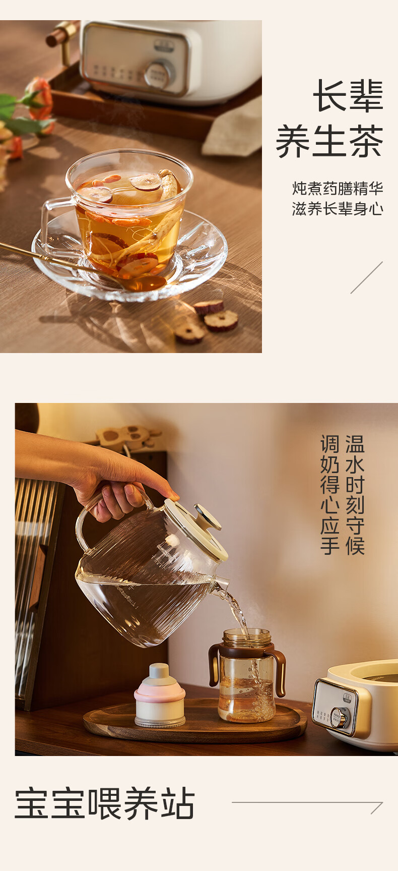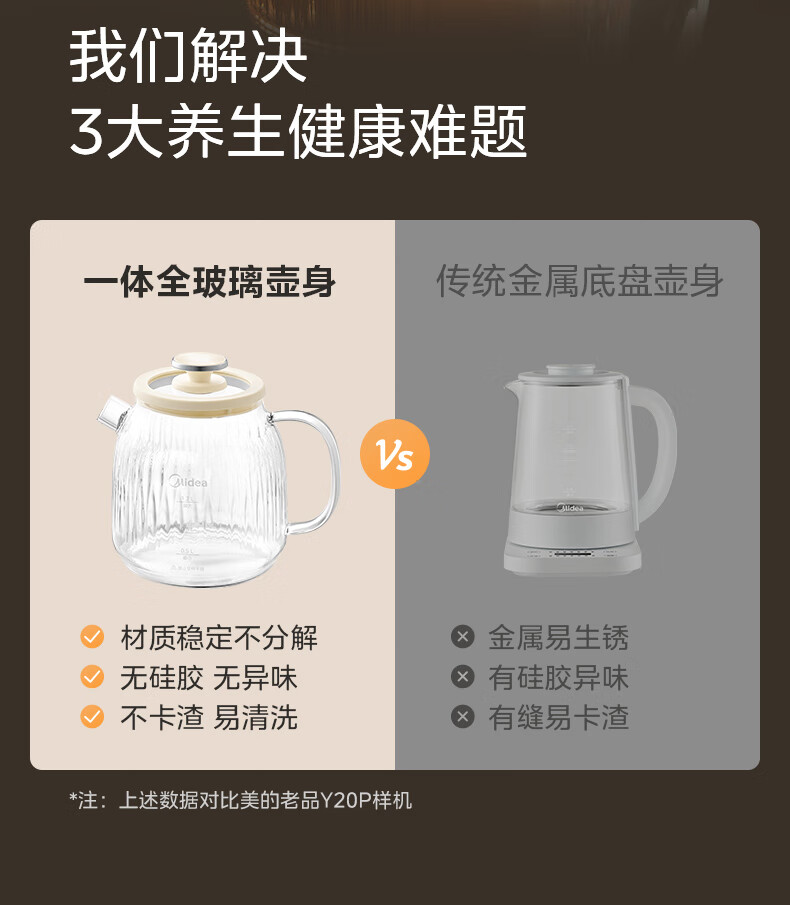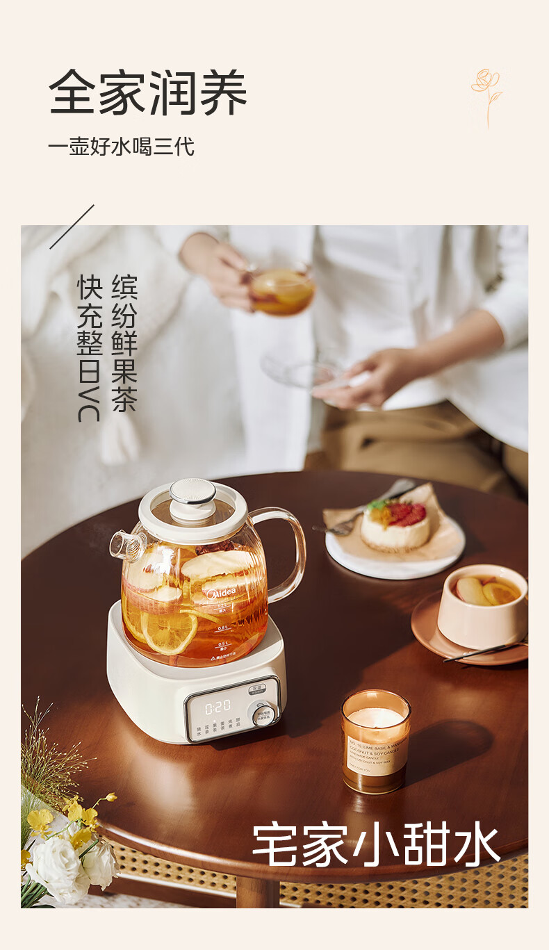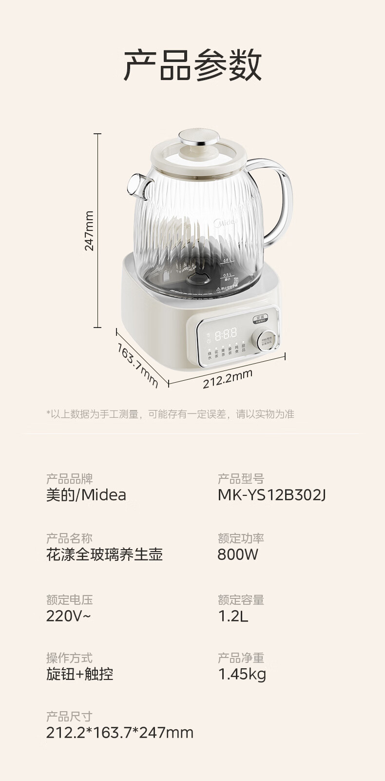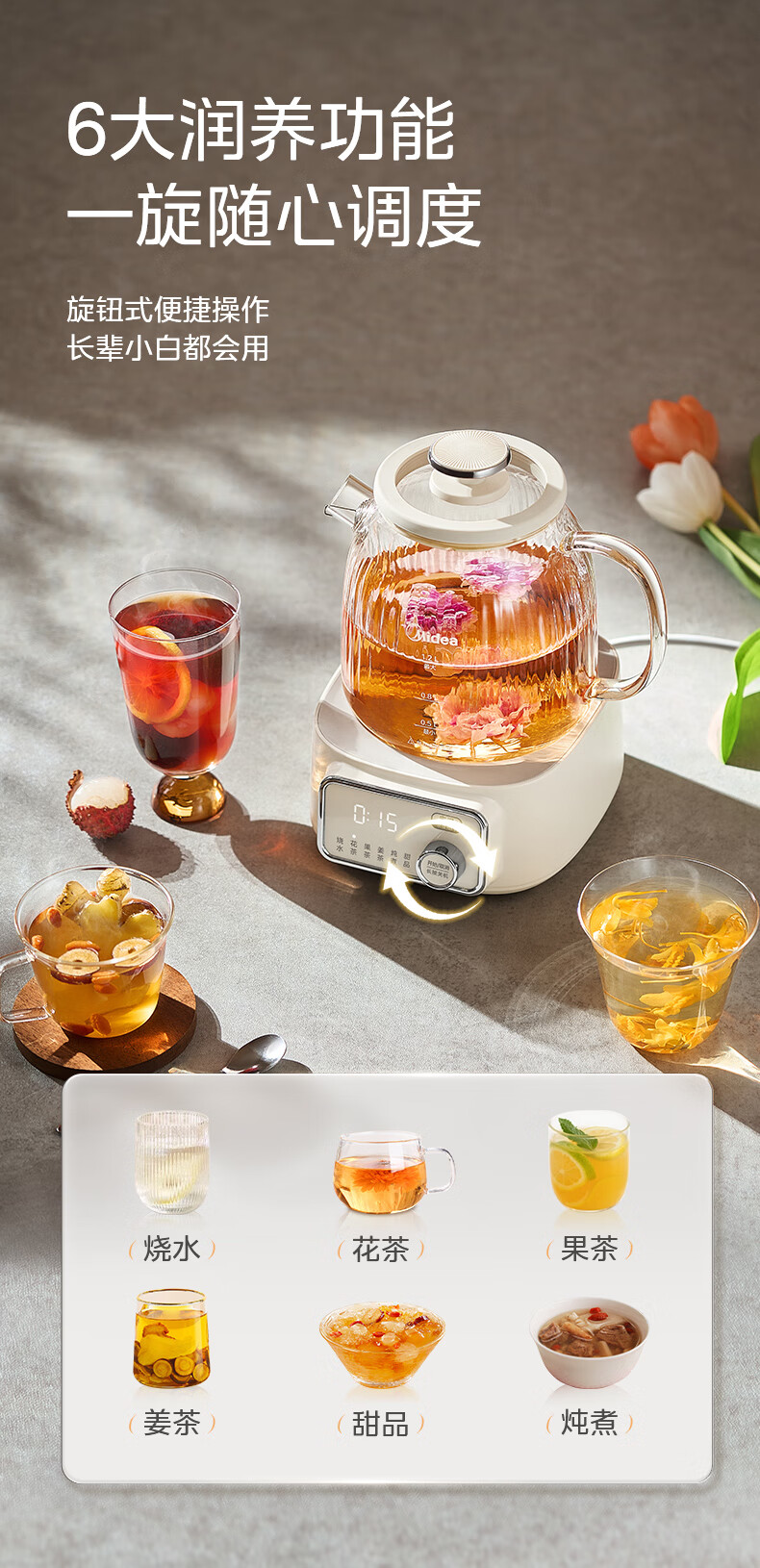 美的(Midea)花漾0胶水全玻璃养生壶 多功能煮茶壶 母婴烧水壶 恒温电热水壶 全自动一体煮茶器1.2L YS12B302J