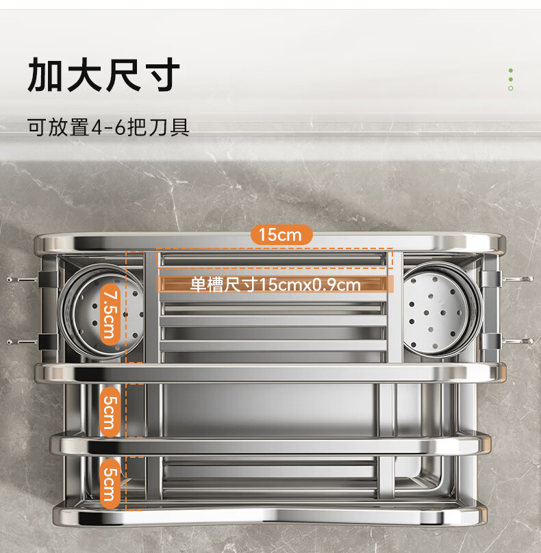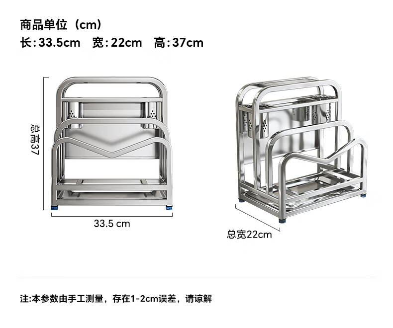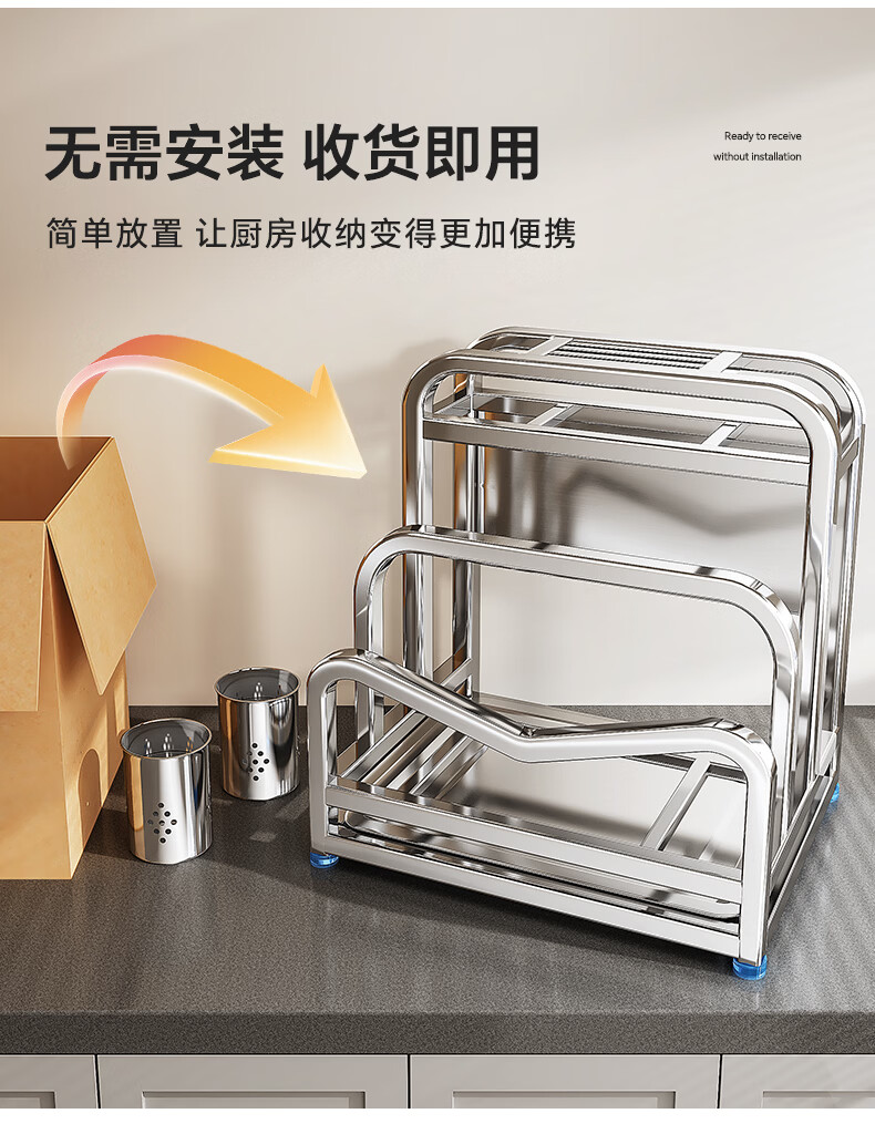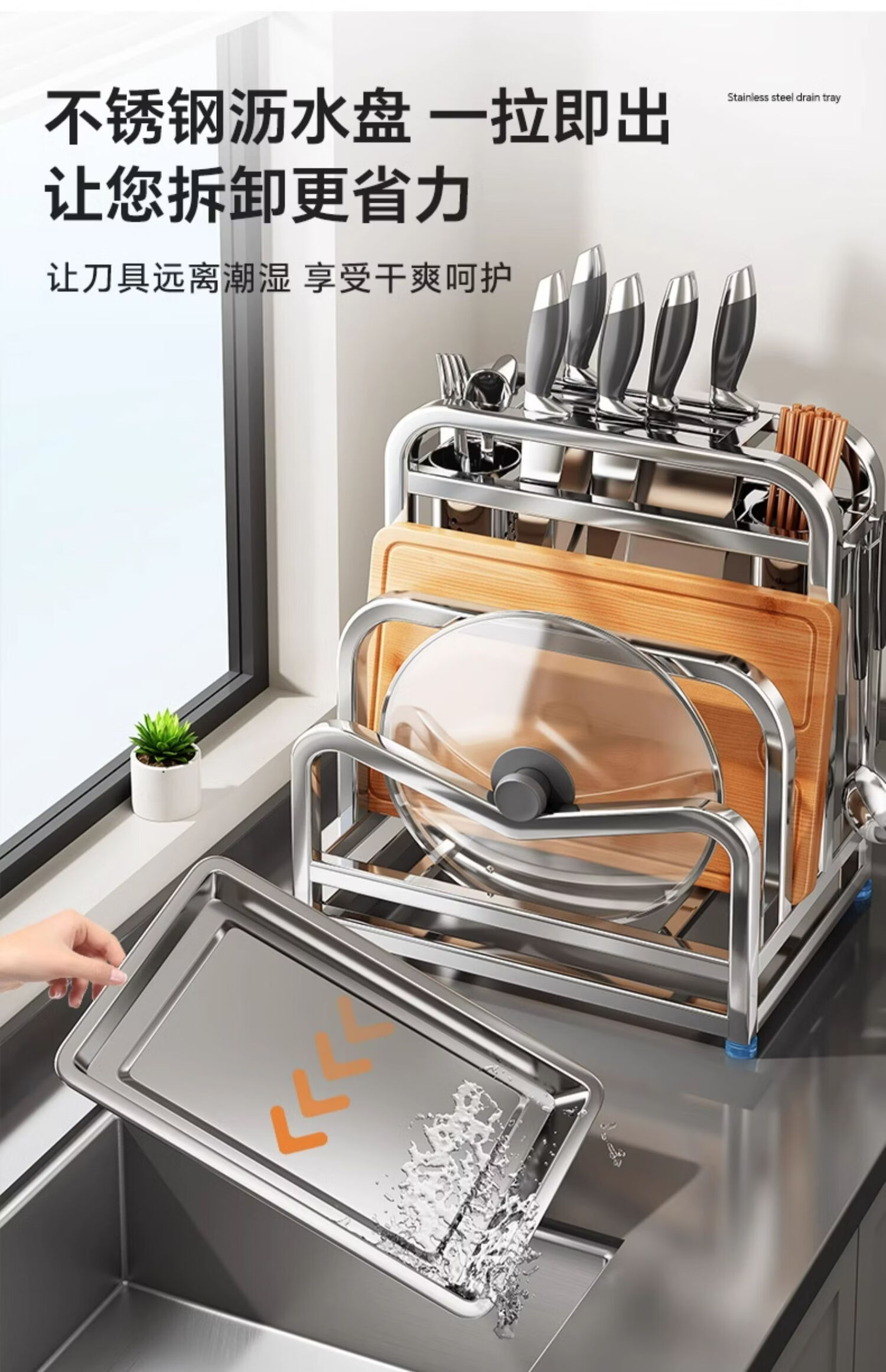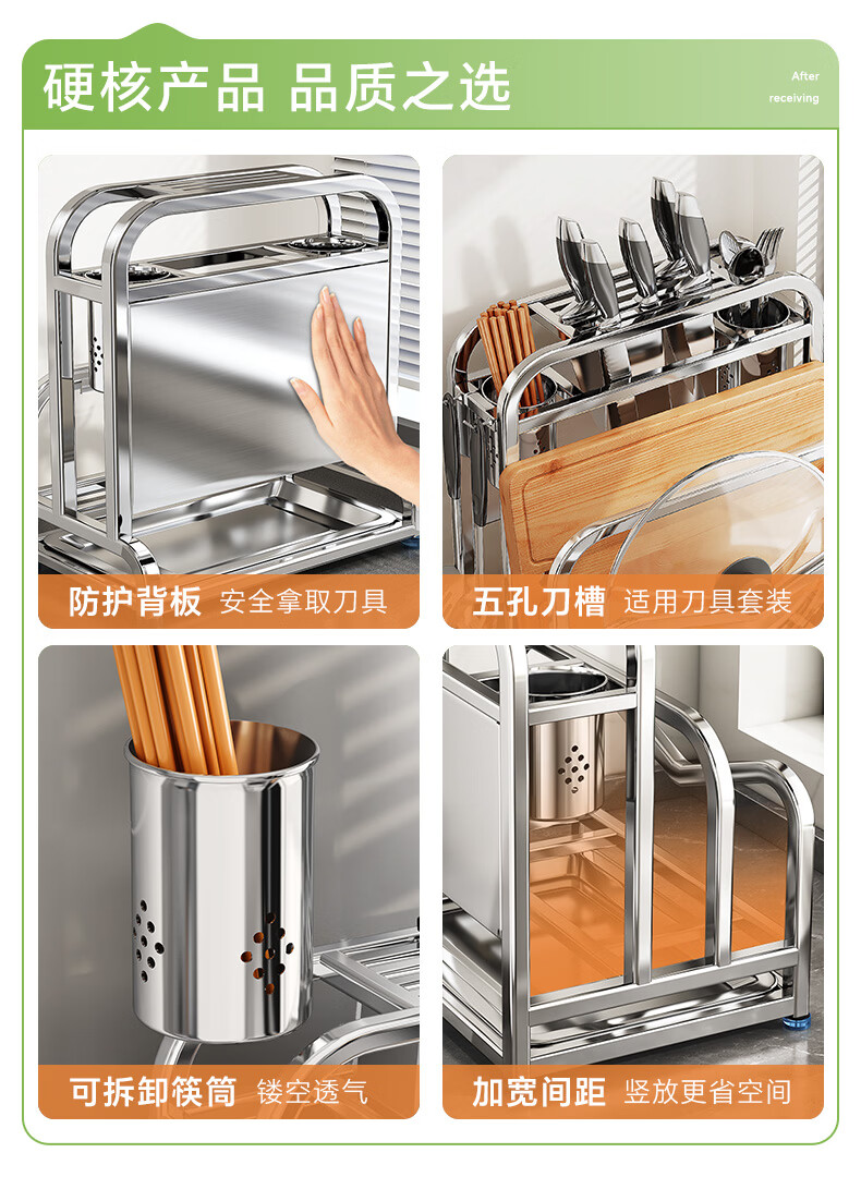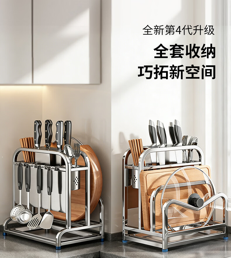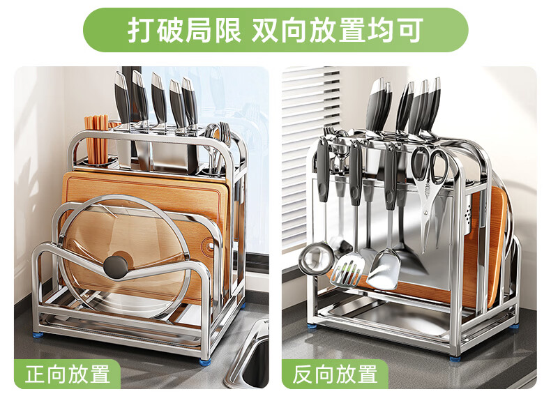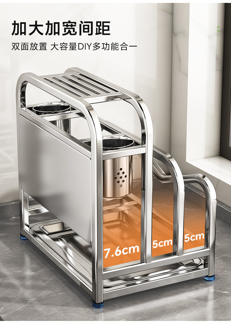炊大皇厨房不锈钢刀架置物架台面可沥水菜刀砧板锅盖多功能一体收纳架 A1【本色不锈钢】单砧板带挡板