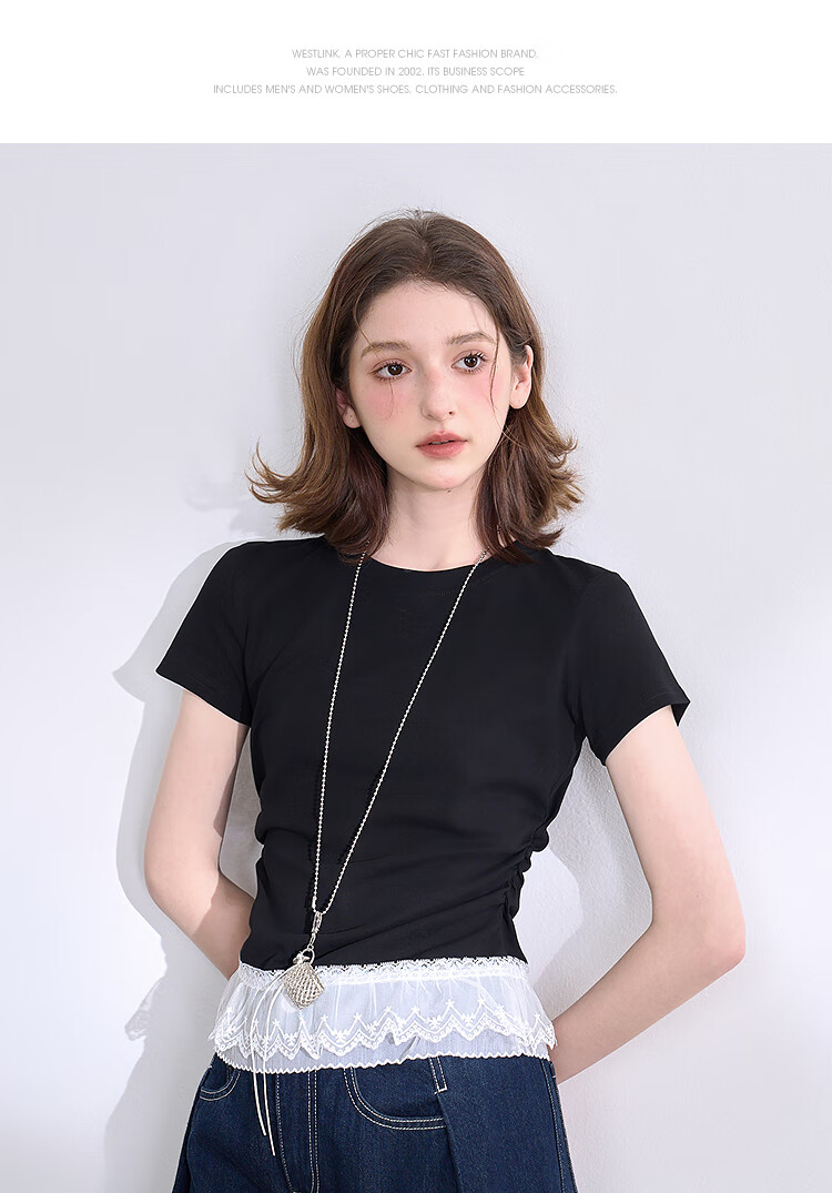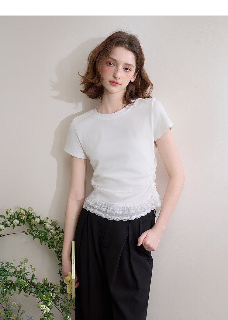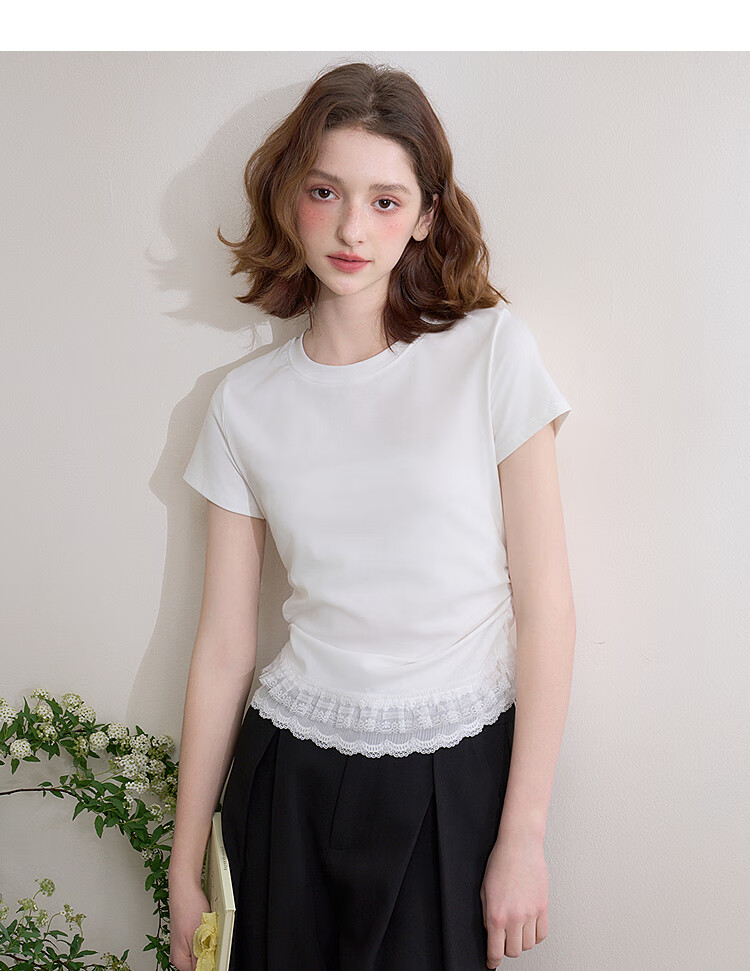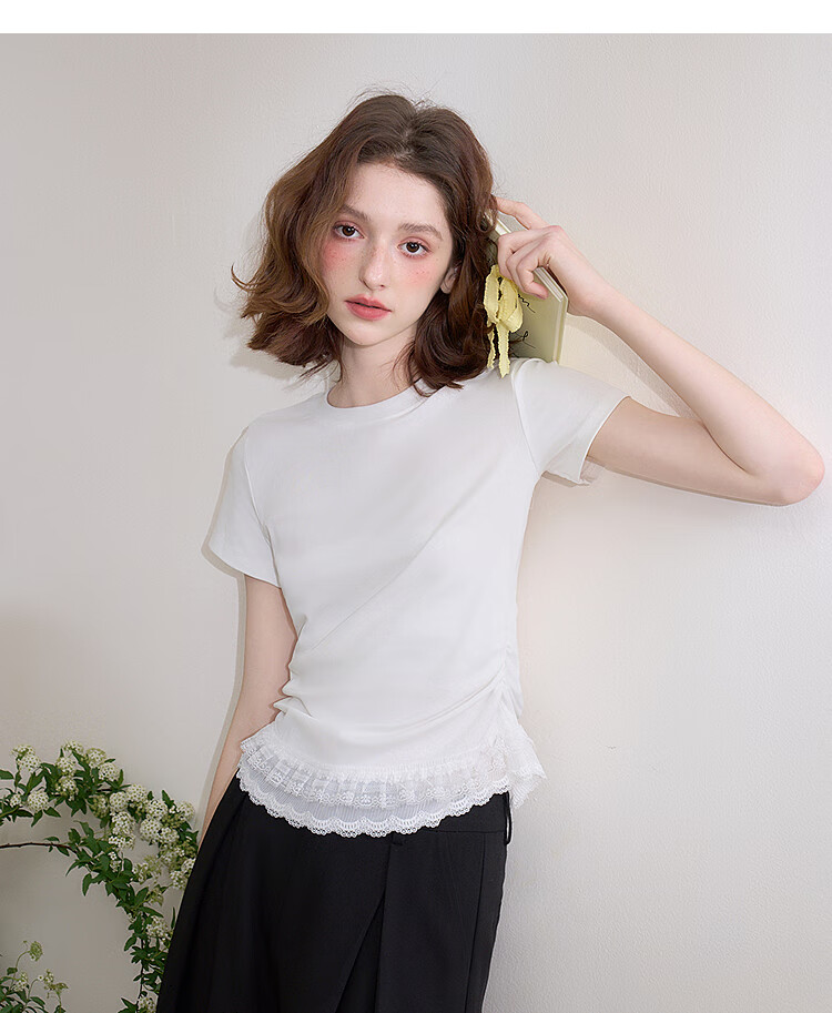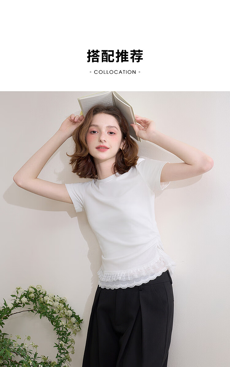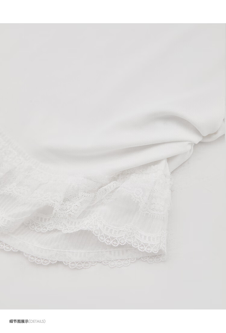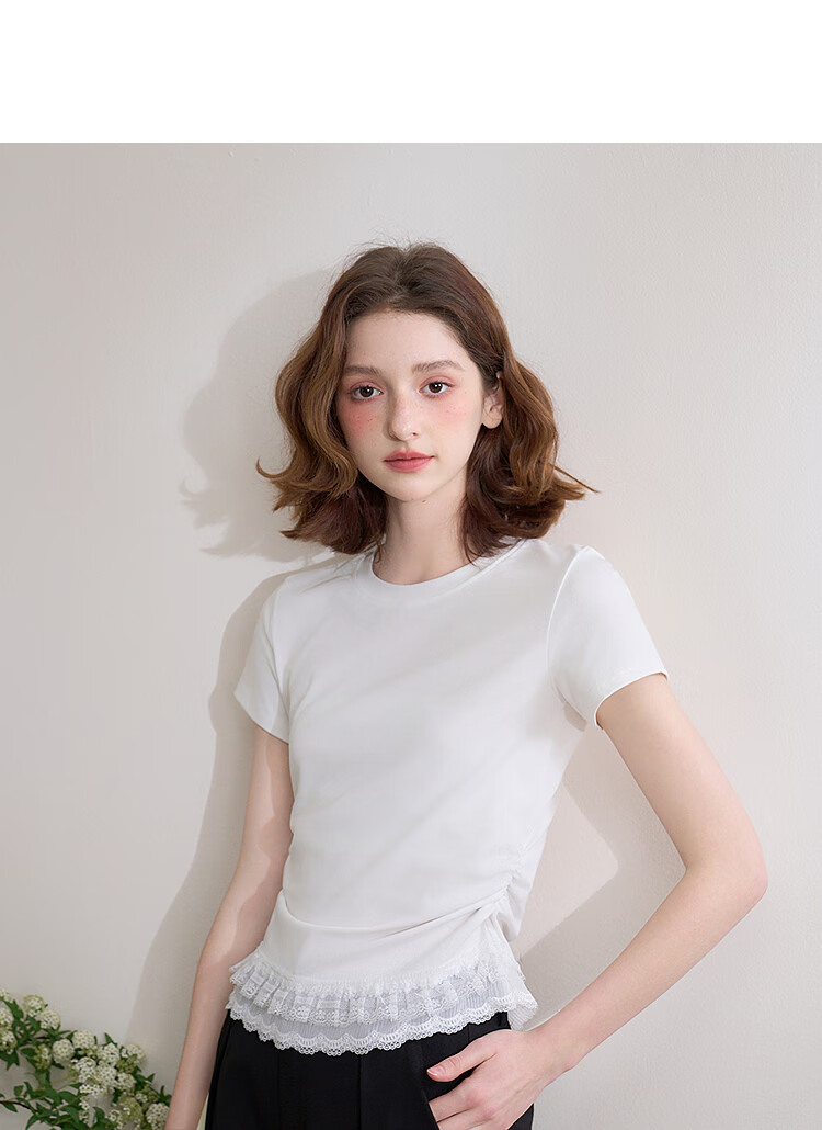 西遇芭蕾风蕾丝假两件简约设计感捏褶收腰T恤女2025夏上衣 白色 L (165)