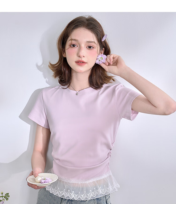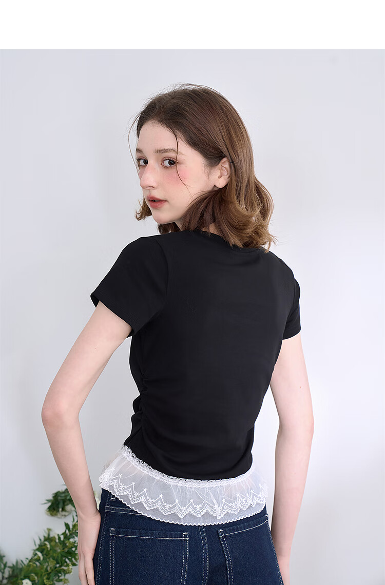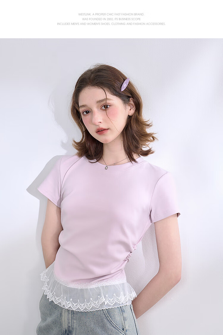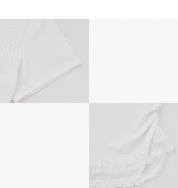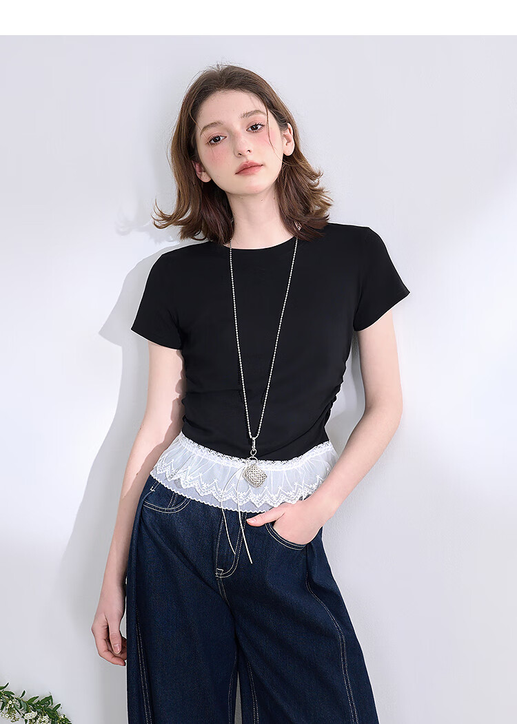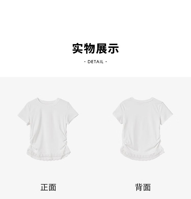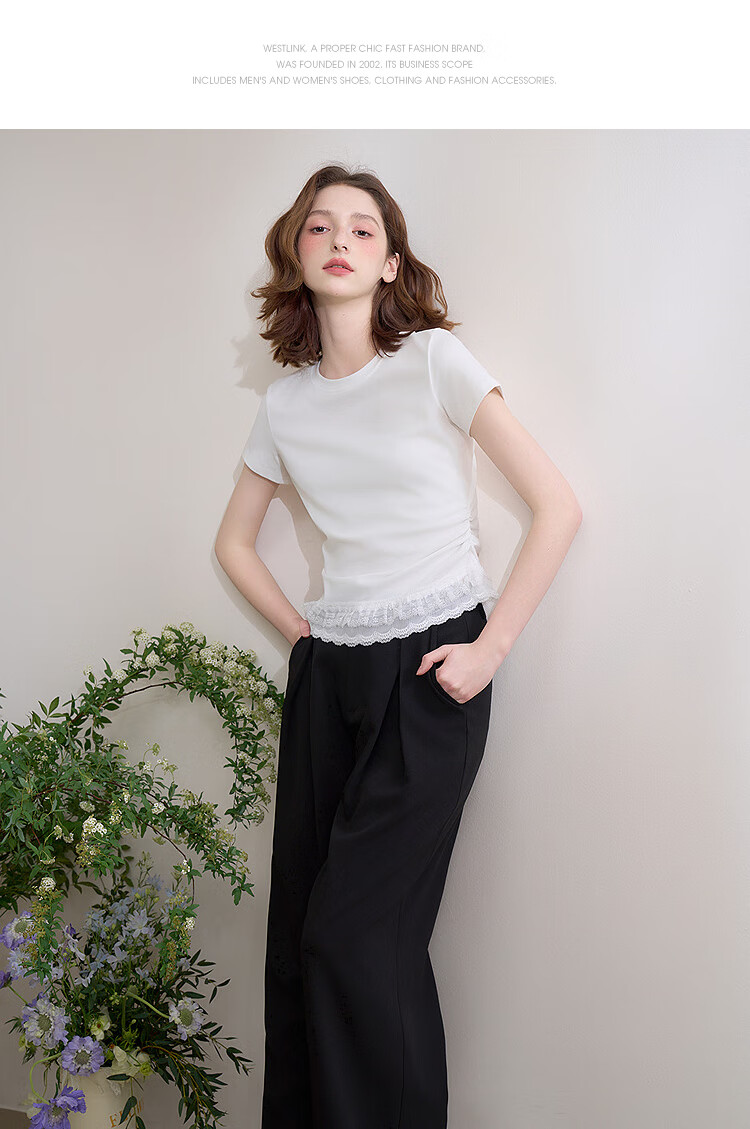 西遇芭蕾风蕾丝假两件简约设计感捏褶收腰T恤女2025夏上衣 白色 L (165)