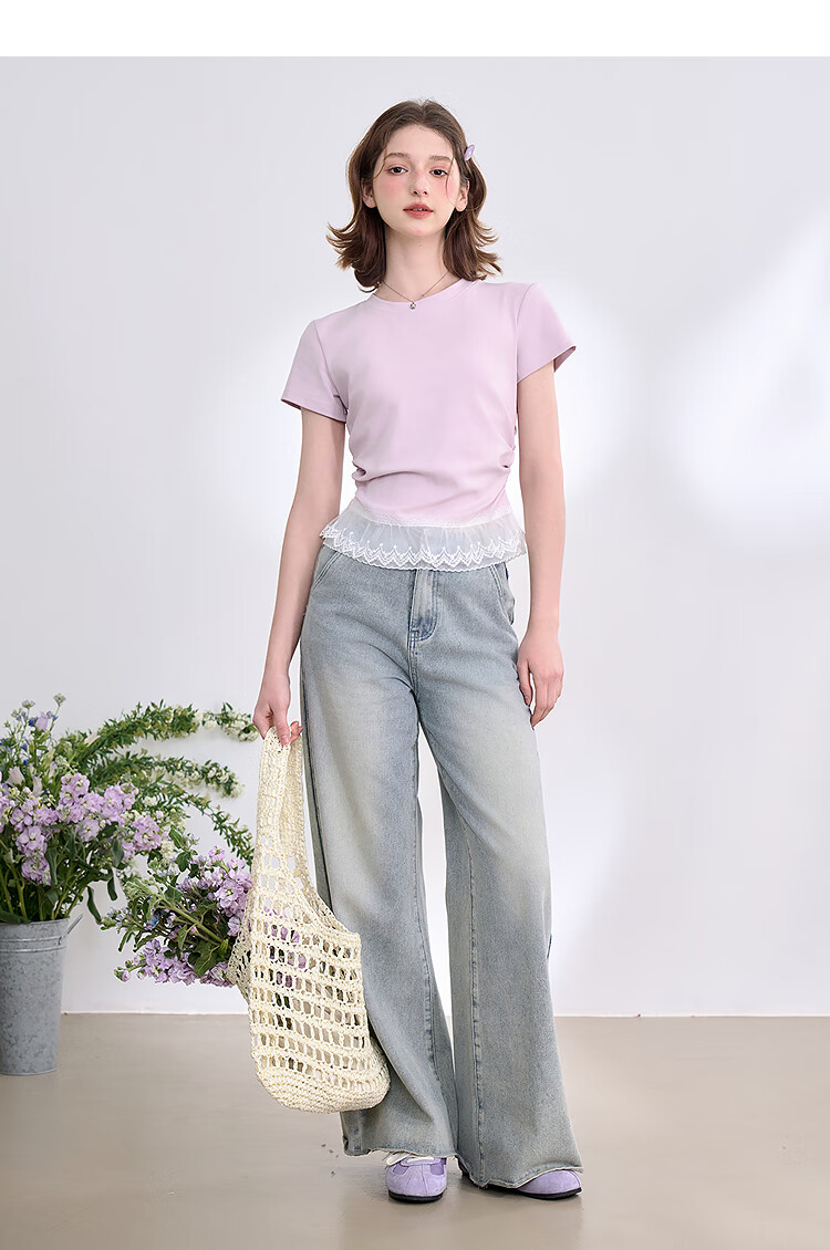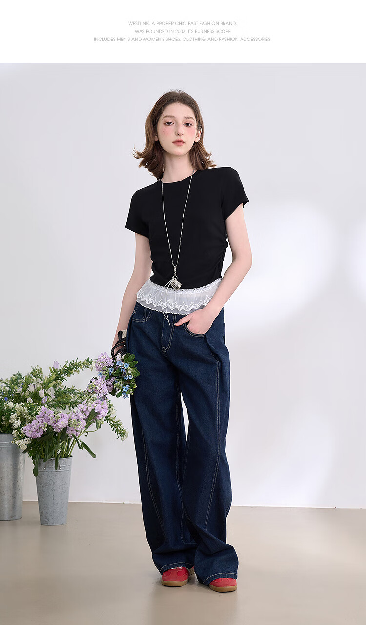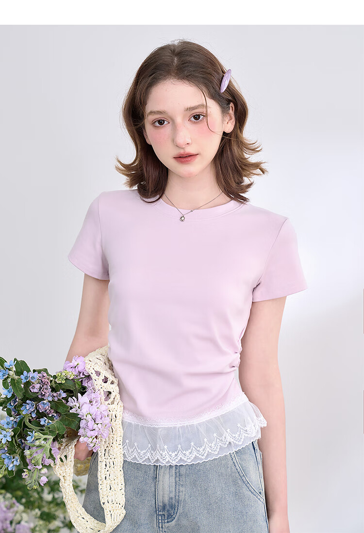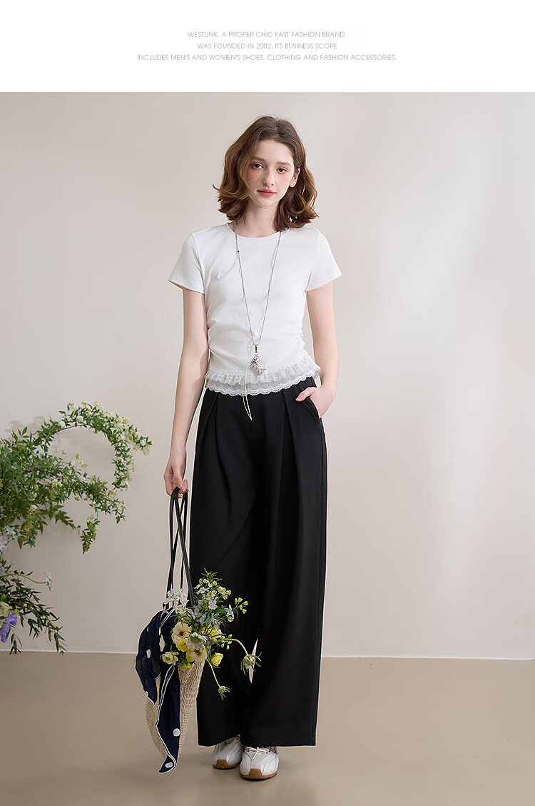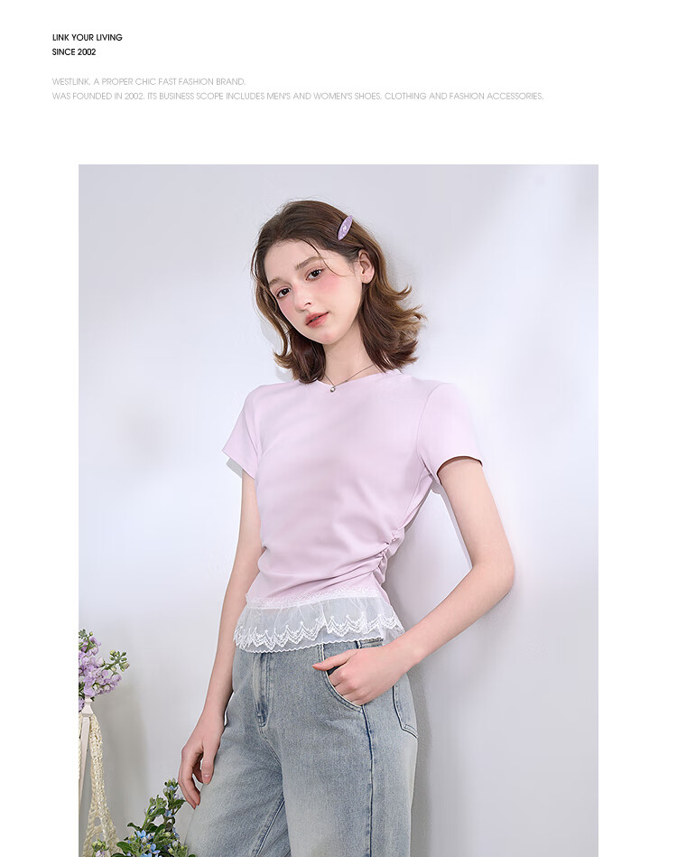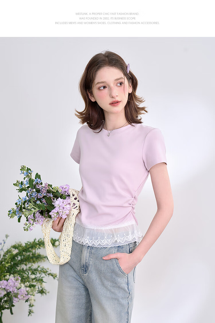 西遇芭蕾风蕾丝假两件简约设计感捏褶收腰T恤女2025夏上衣 白色 L (165)