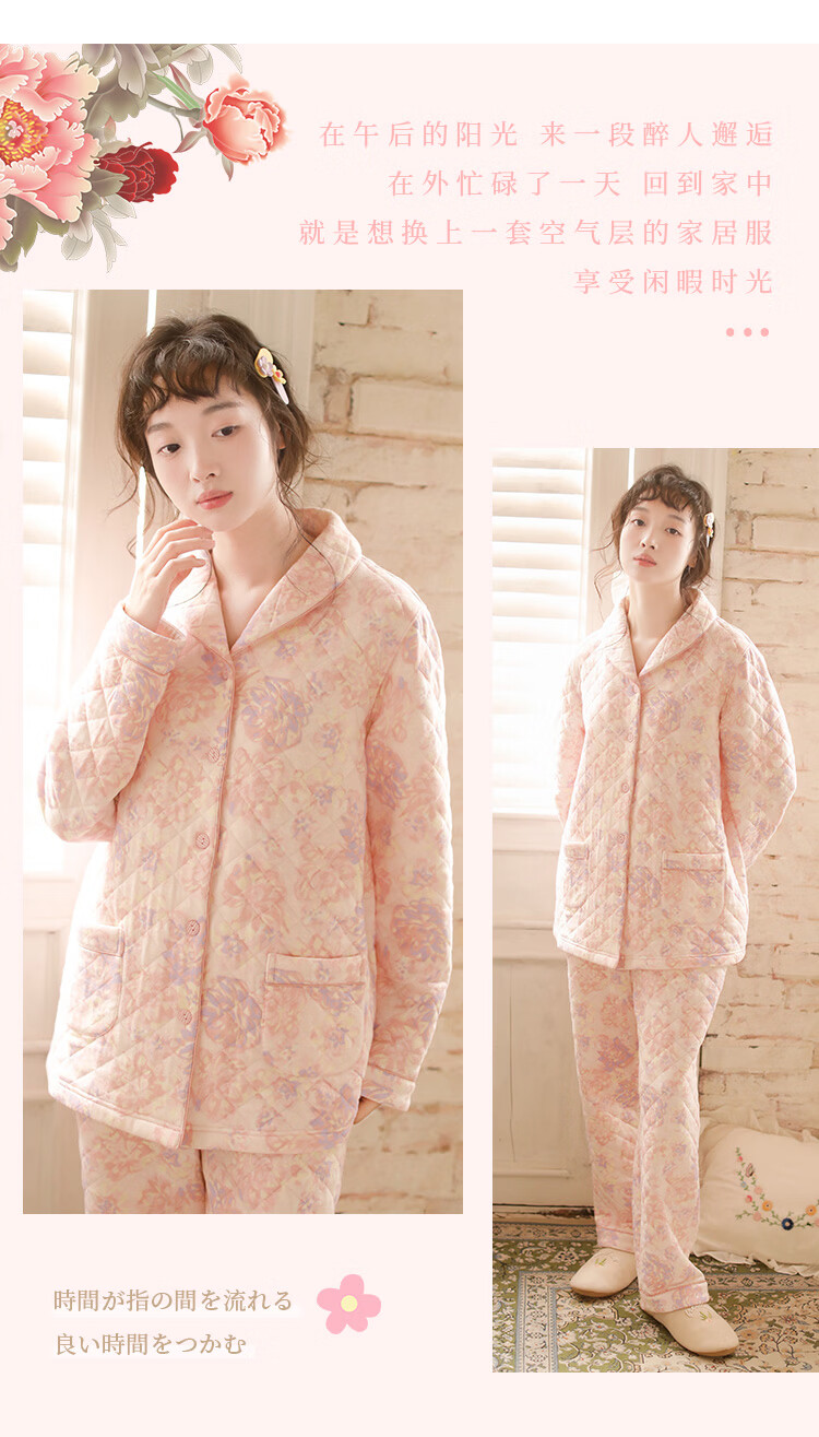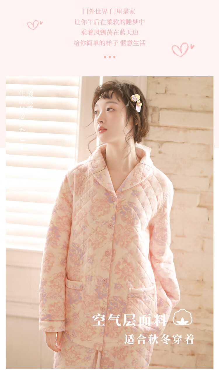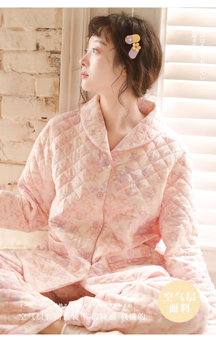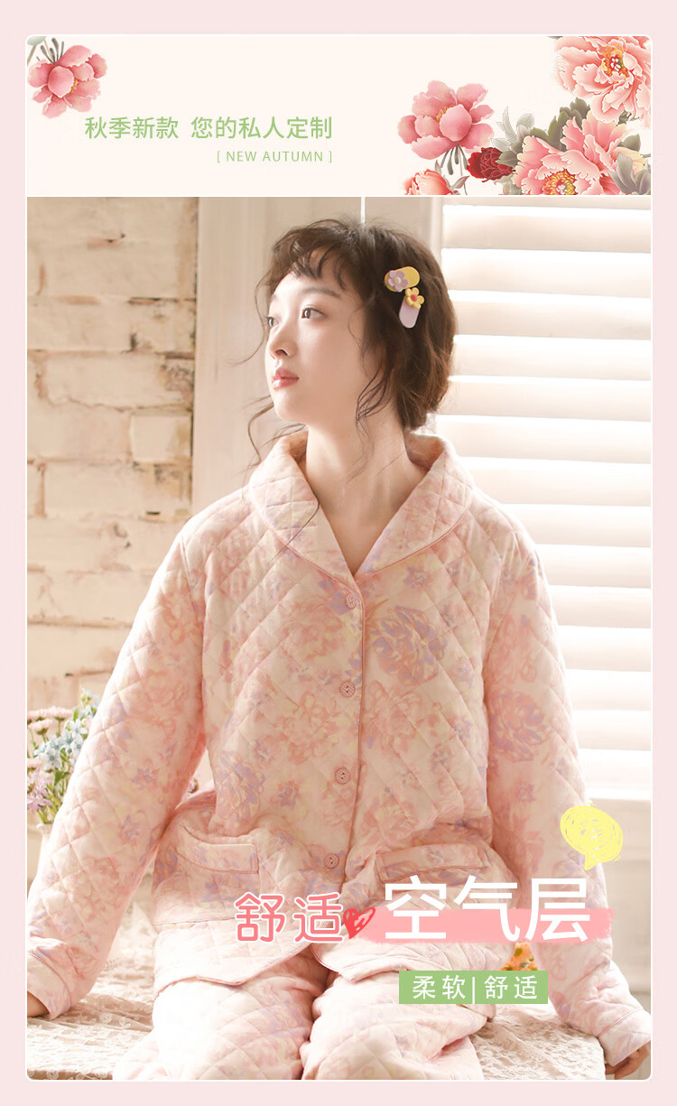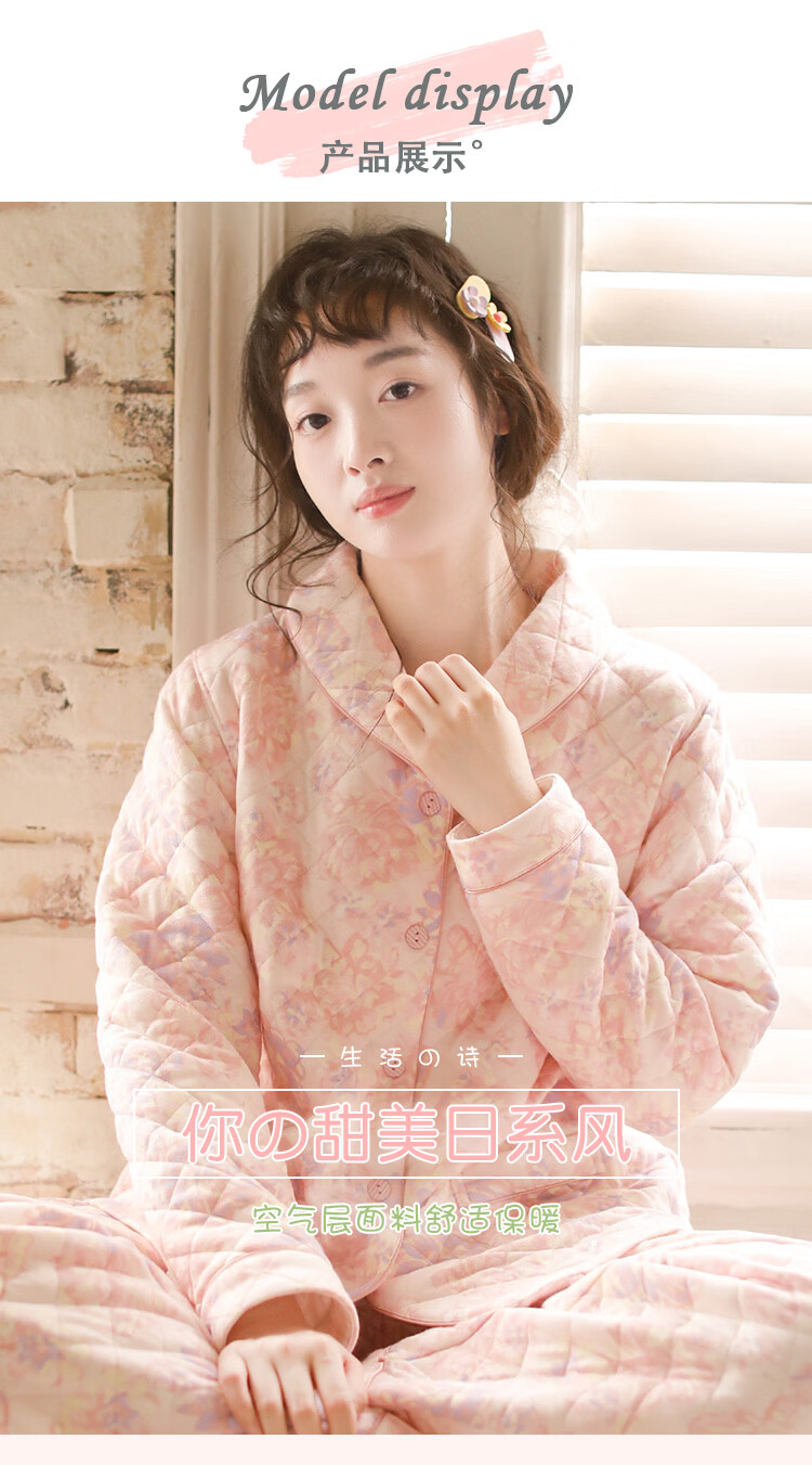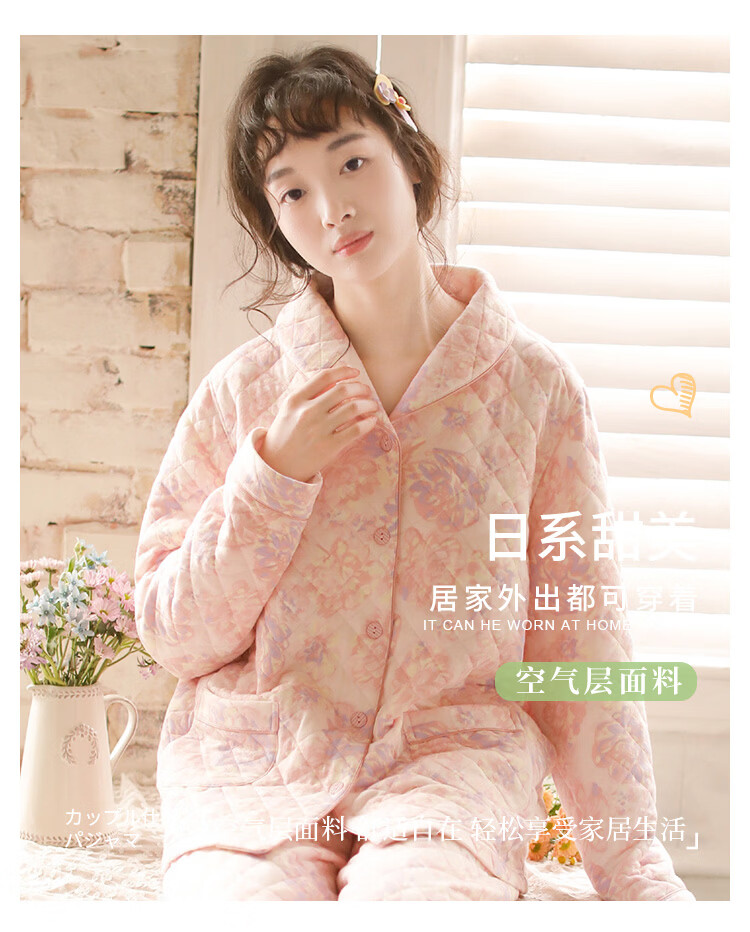 蔓秋 MEJU《海棠》女士开襟加厚空气层空气棉长袖长裤家居服套装 粉色 S 95斤以内