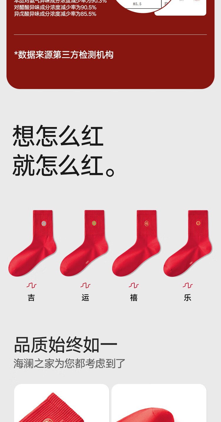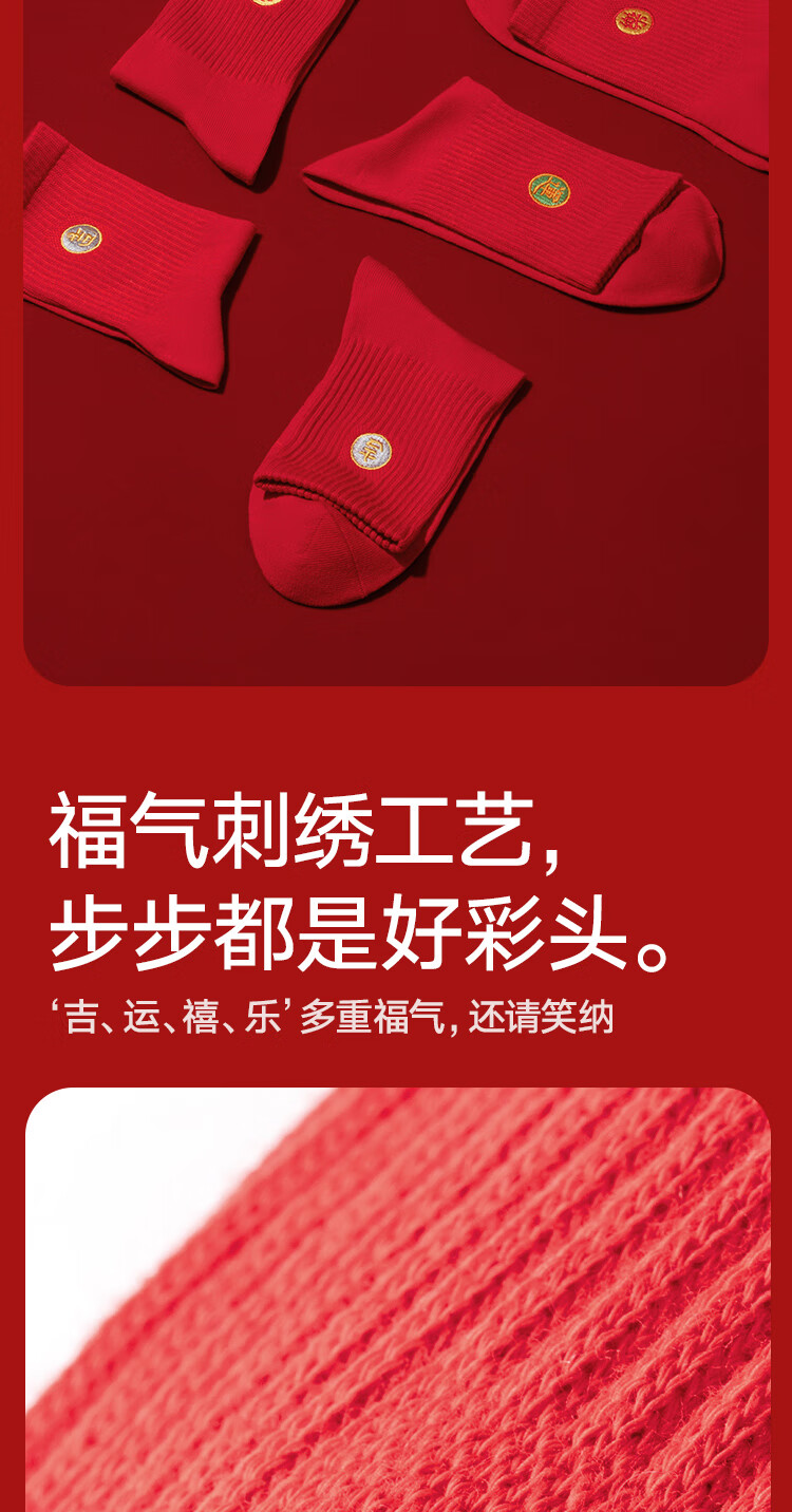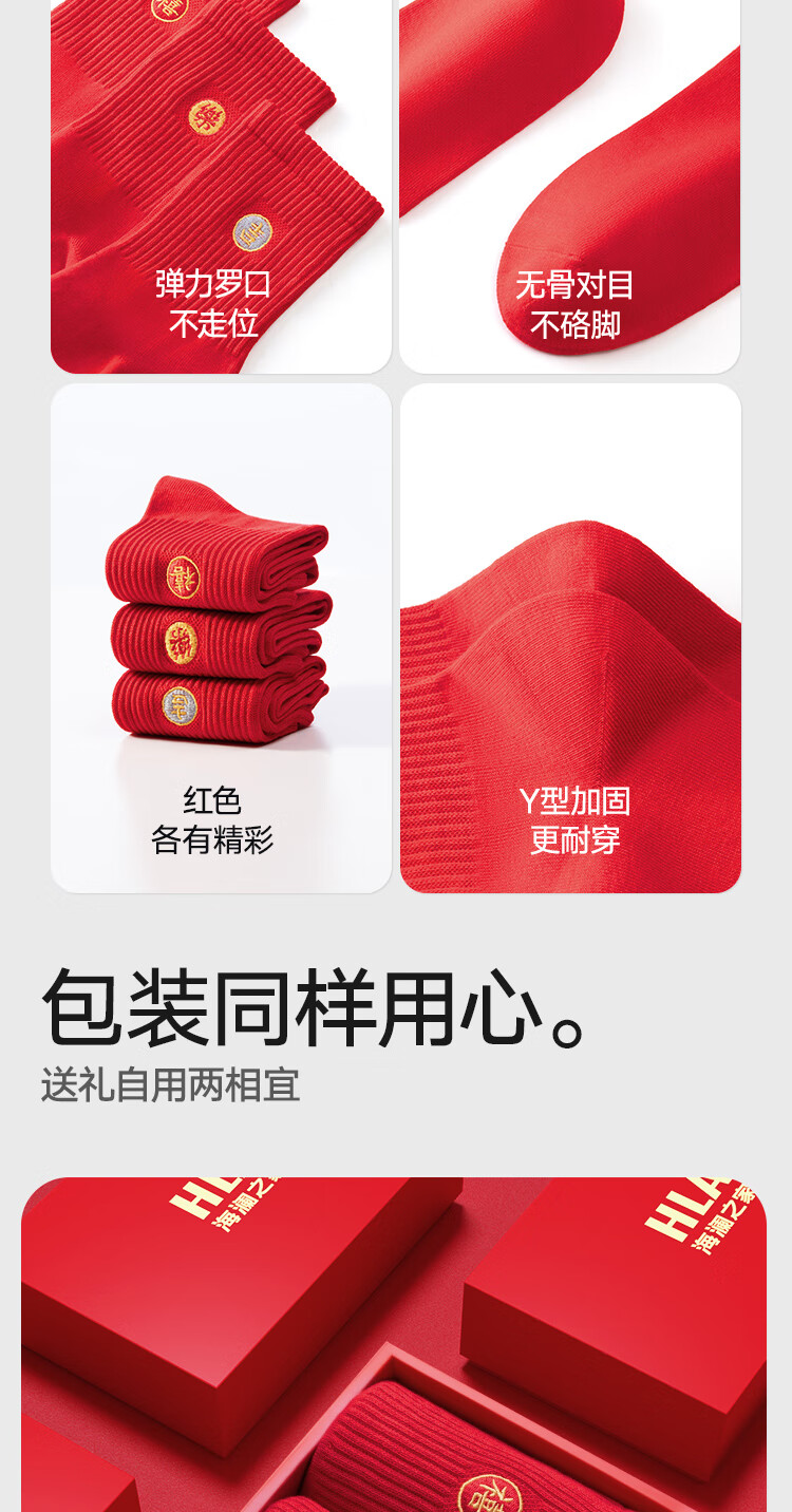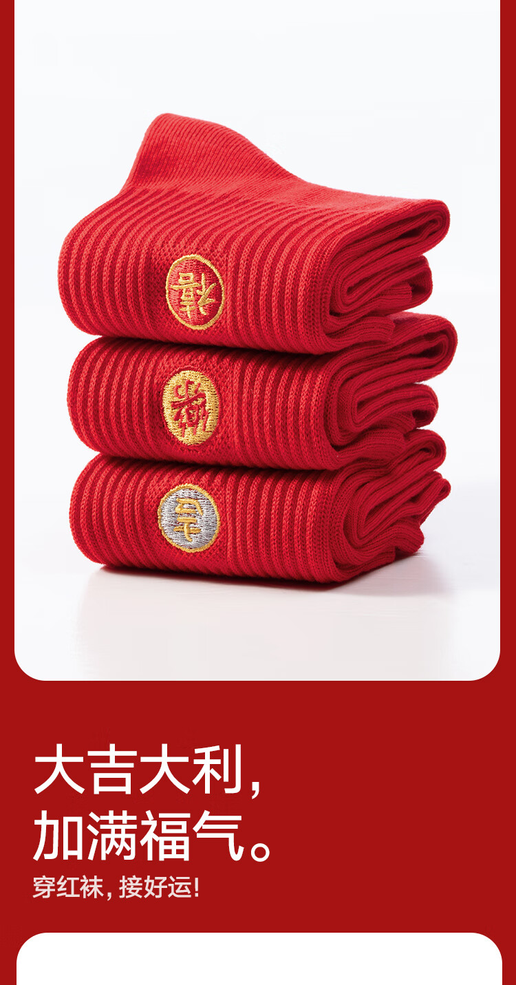 海澜之家【鸿运】红袜子男本命年纯棉抗菌消臭骐骥红马年红色中长袜3双装